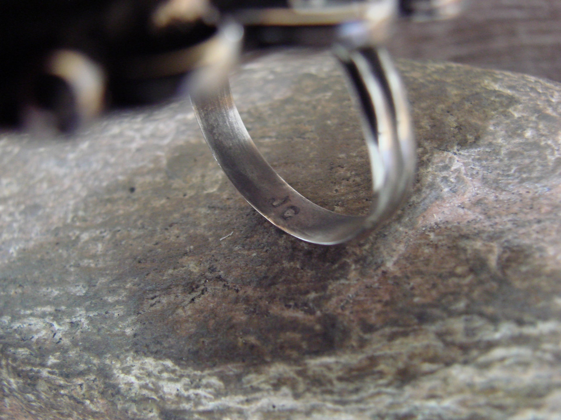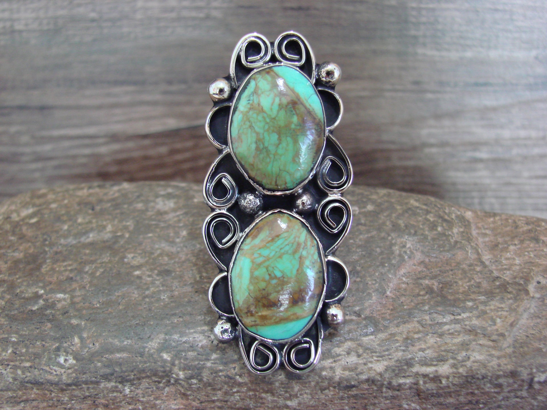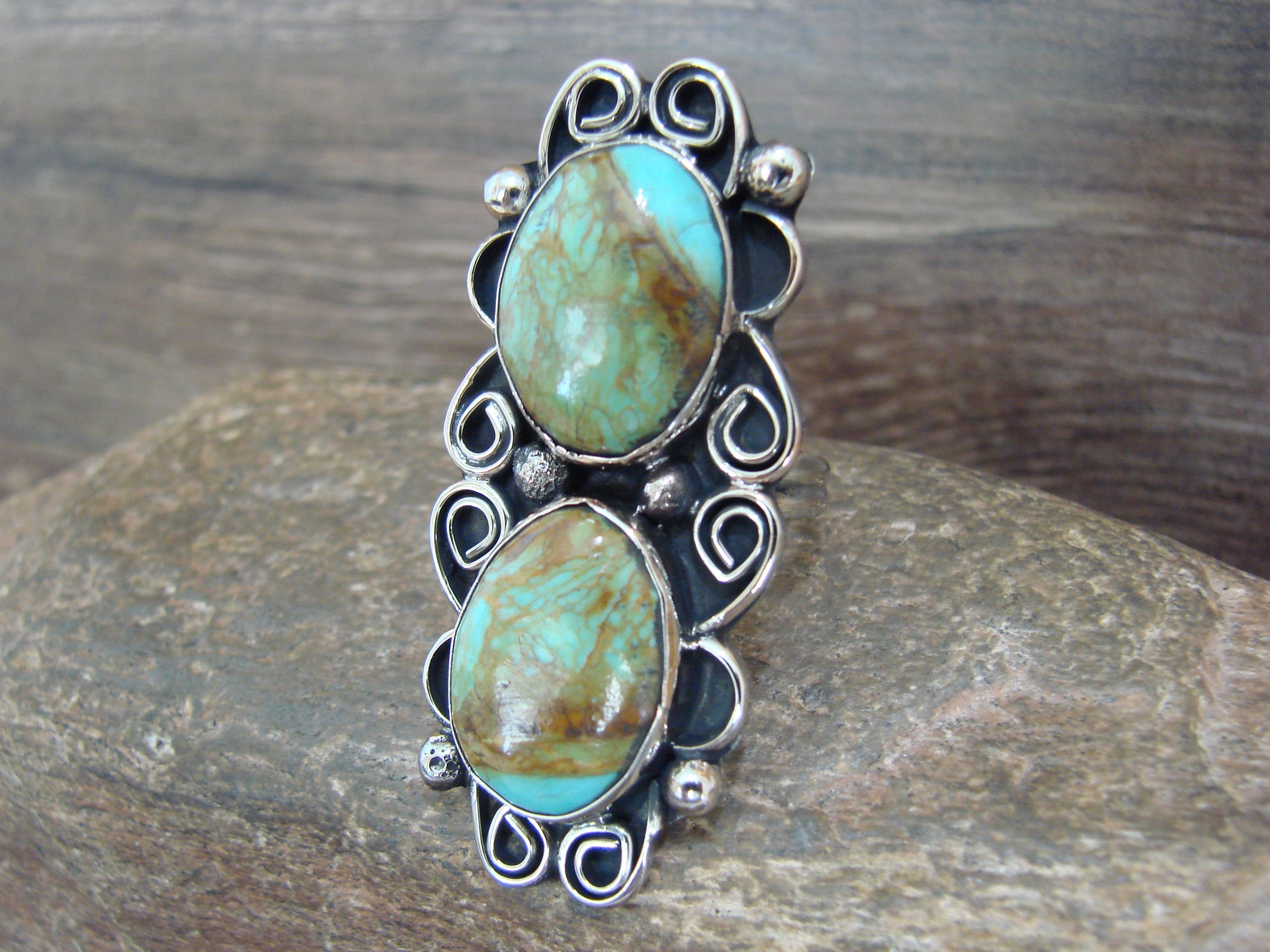 Native American Navajo Indian Nickel Silver & 2 Stone Adjustable Turquoise Ring from Western New Mexico. This Stunning ring features 2 Genuine Turquoise stones set into smooth Nickel Silver bezel settings. Beautiful Nickel Silver details Surround the Stone. This ring is made in Nickel Silver and is Adjustable from sizes 8 - 10. Navajo Indian handmade by Silversmith Jackie Cleveland. Signed "JC" on the inner band. Free Shipping and Gift Box included!