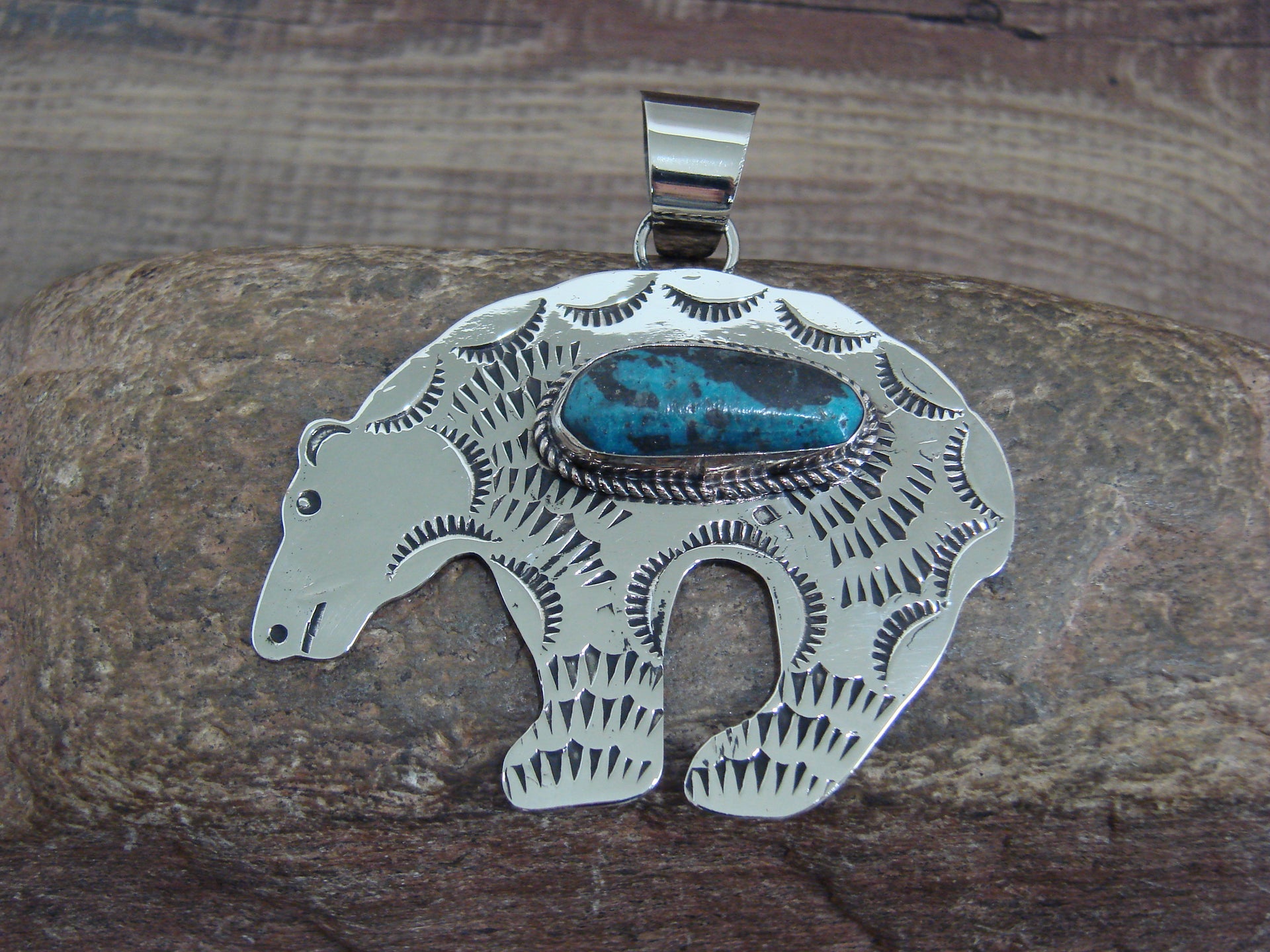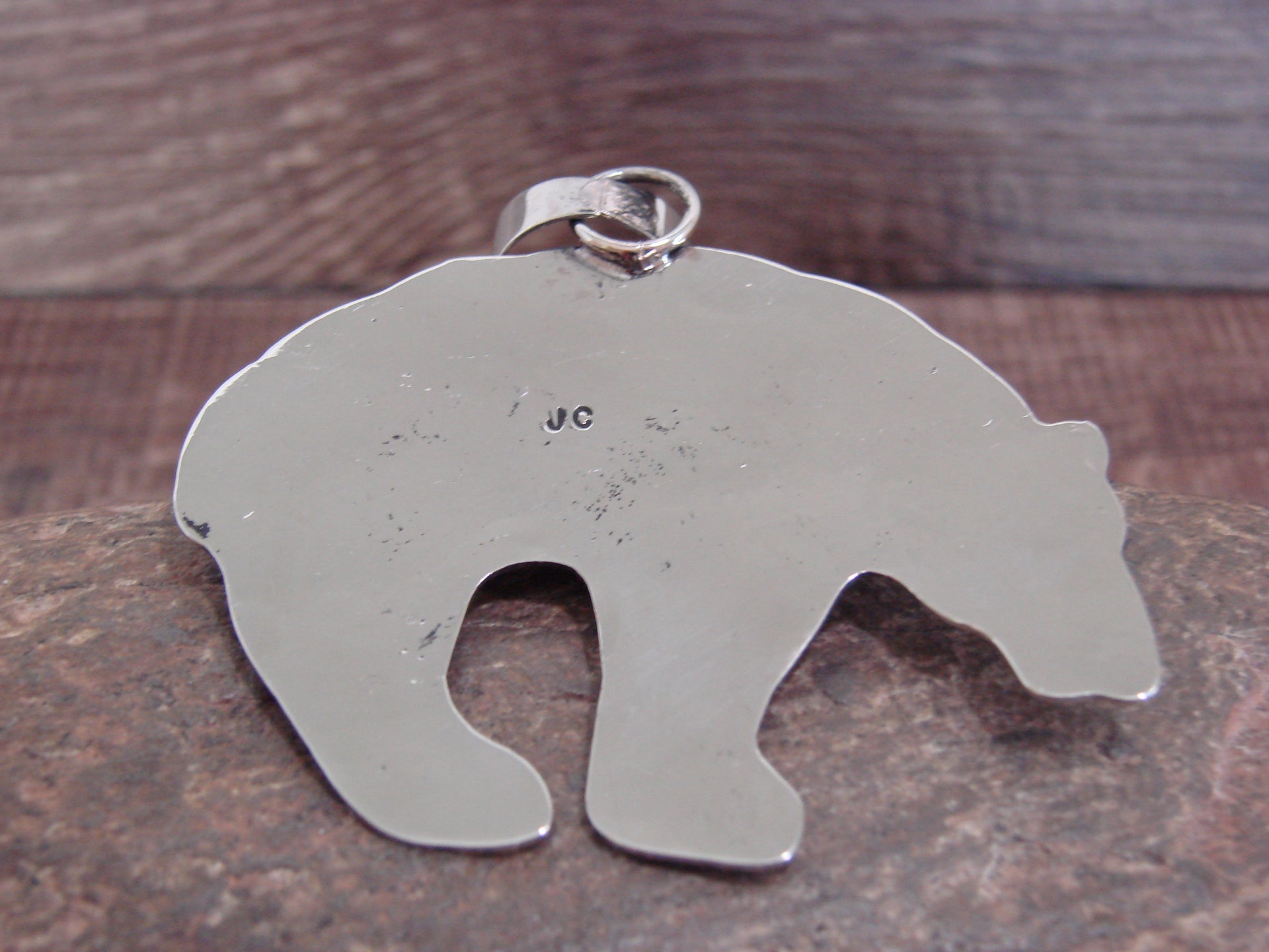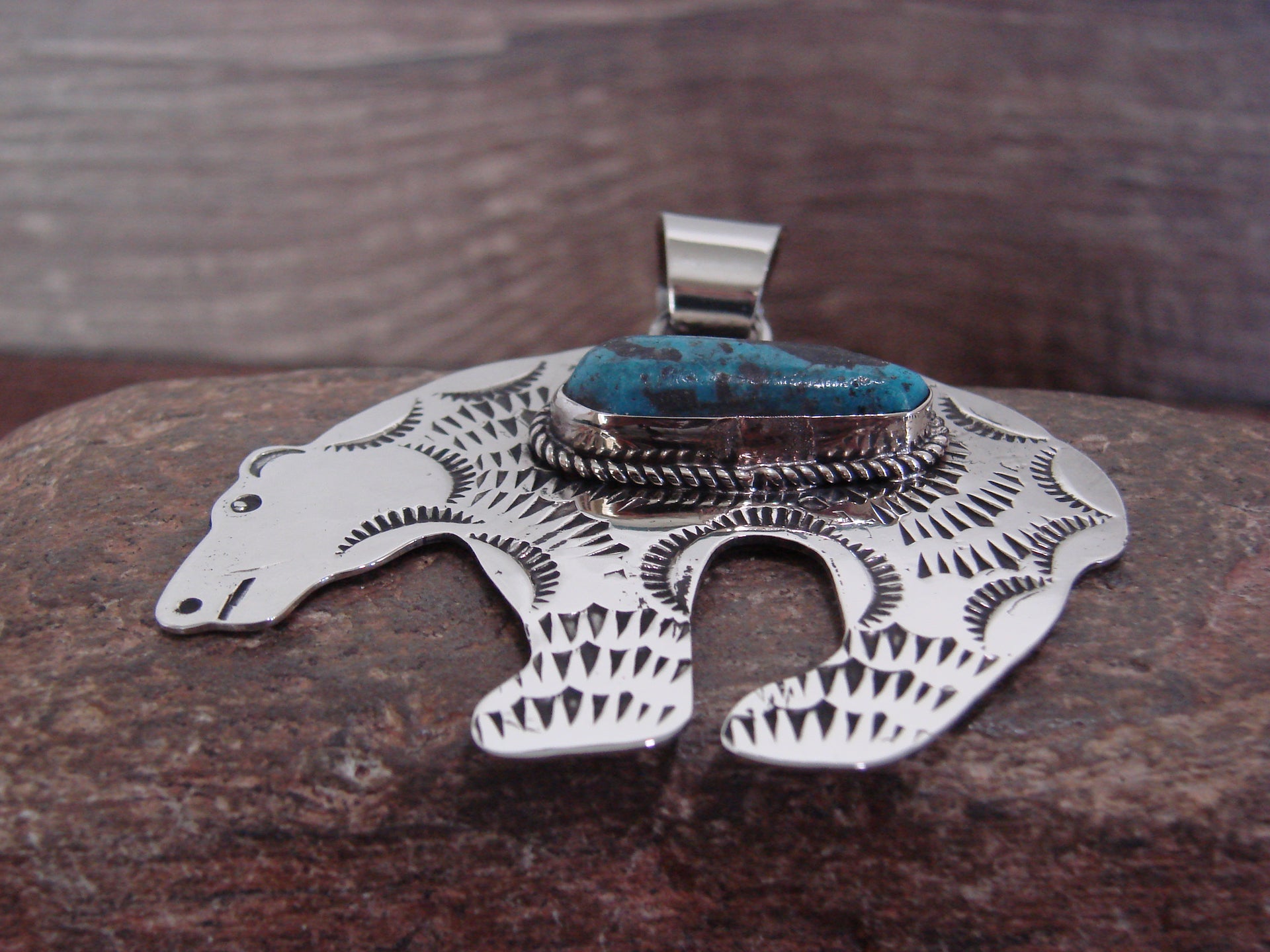 Native American Navajo Indian Nickel Silver & Turquoise Bear Pendant from Western New Mexico. This beautiful Pendant is hand cut from Nickel Silver and features stunning traditional hand stamping throughout. The Genuine Turquoise stone is securely set into a smooth Nickel Silver bezel setting. Handmade by Jackie Cleveland, wife of the late Navajo Silversmith Albert Cleveland. Signed "JC" on back. Jackie is widely known for her traditional Navajo style and hand stamping. Free gift box and shipping included!