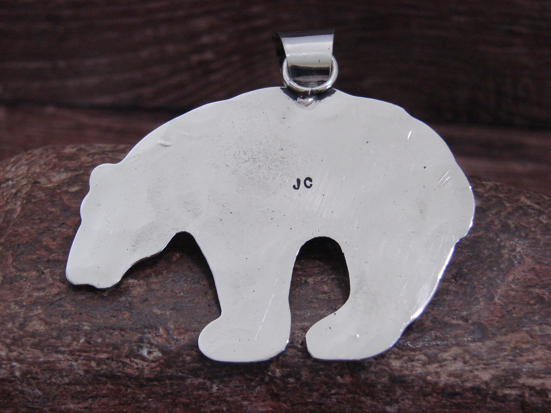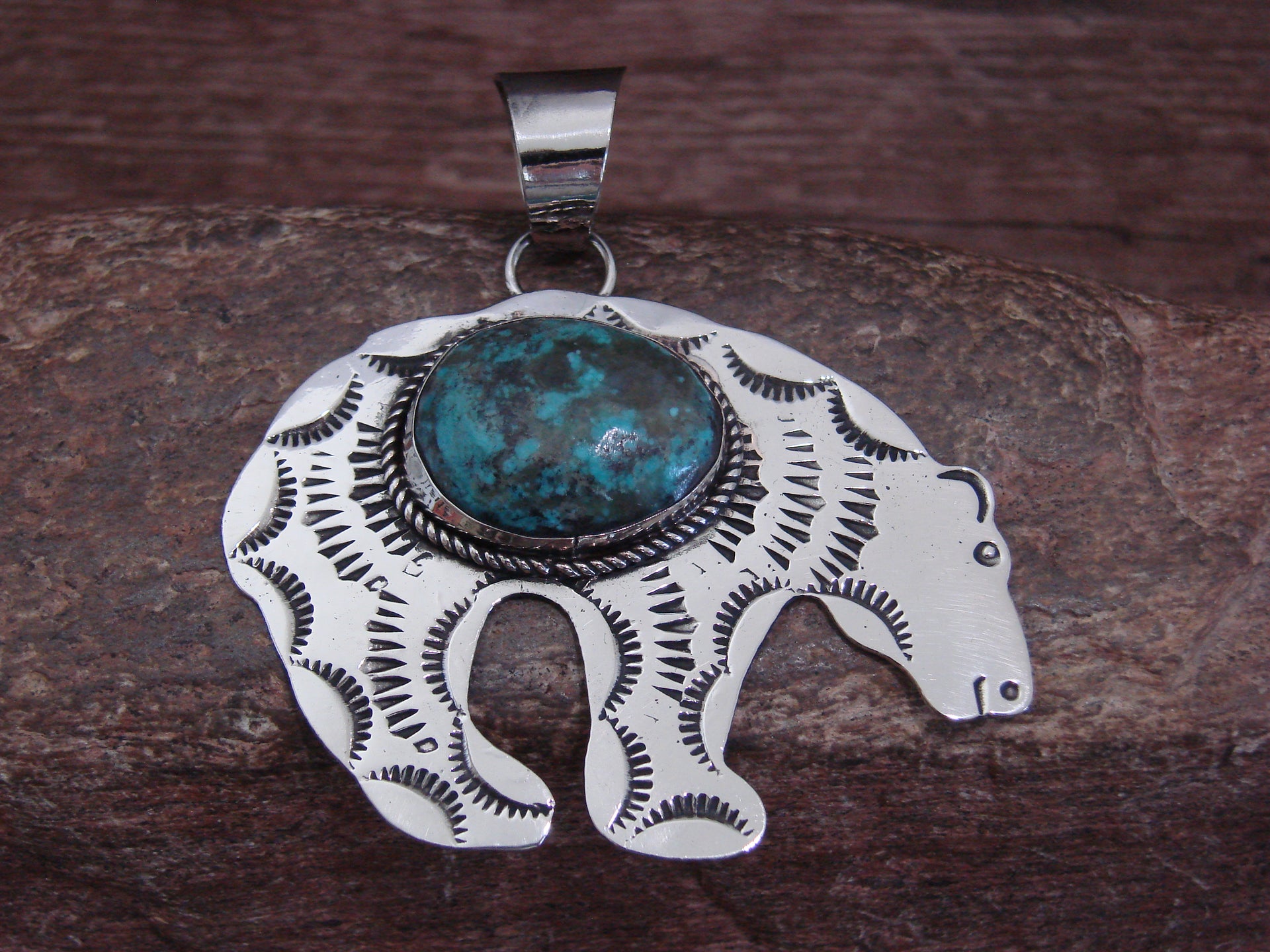 Native American Navajo Indian Nickel Silver & Turquoise Bear Pendant from Western New Mexico. This beautiful Pendant is hand cut from Nickel Silver and features stunning traditional hand stamping throughout. The Genuine Turquoise stone is securely set into a smooth Nickel Silver bezel setting. Handmade by Jackie Cleveland, wife of the late Navajo Silversmith Albert Cleveland. Signed "JC" on back. Jackie is widely known for her traditional Navajo style and hand stamping. Free gift box and shipping included!