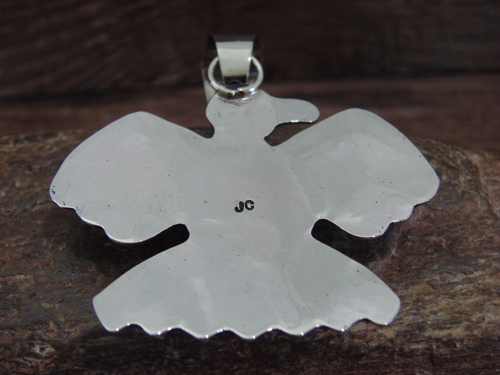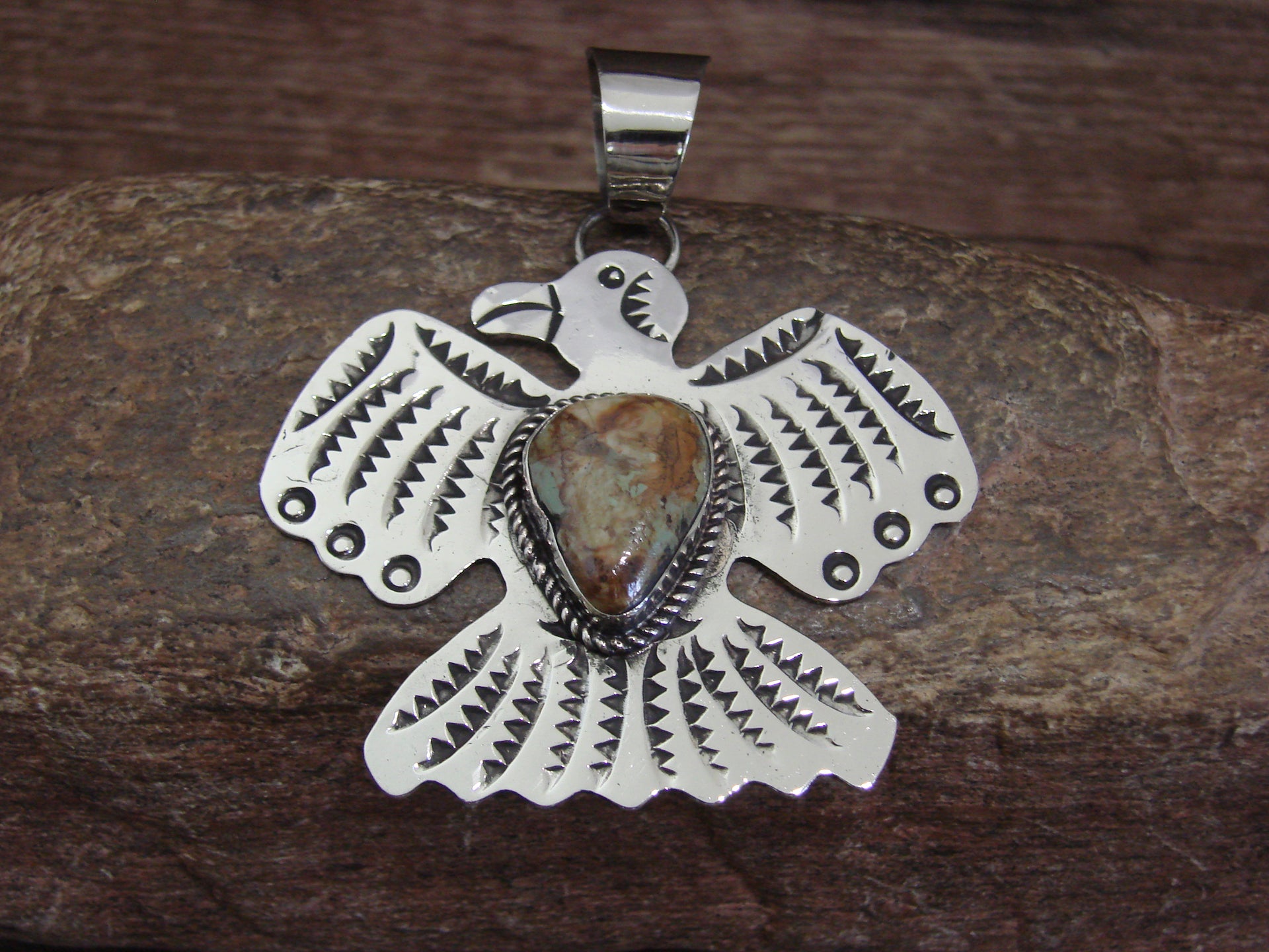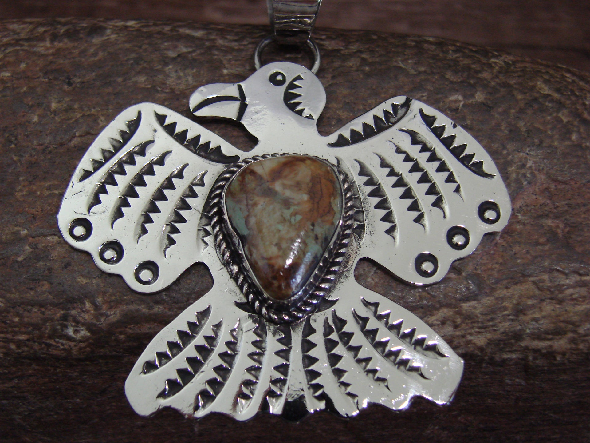 Native American Navajo Indian Nickel Silver & Turquoise Thunderbird Pendant from Western New Mexico. This beautiful Pendant is hand cut from Nickel Silver and features stunning traditional hand stamping throughout. The Genuine Turquoise stone is securely set into a smooth Nickel Silver bezel setting. Handmade by Jackie Cleveland, wife of the late Navajo Silversmith Albert Cleveland. Signed "JC" on back. Jackie is widely known for her traditional Navajo style and hand stamping. Free gift box and shipping included!