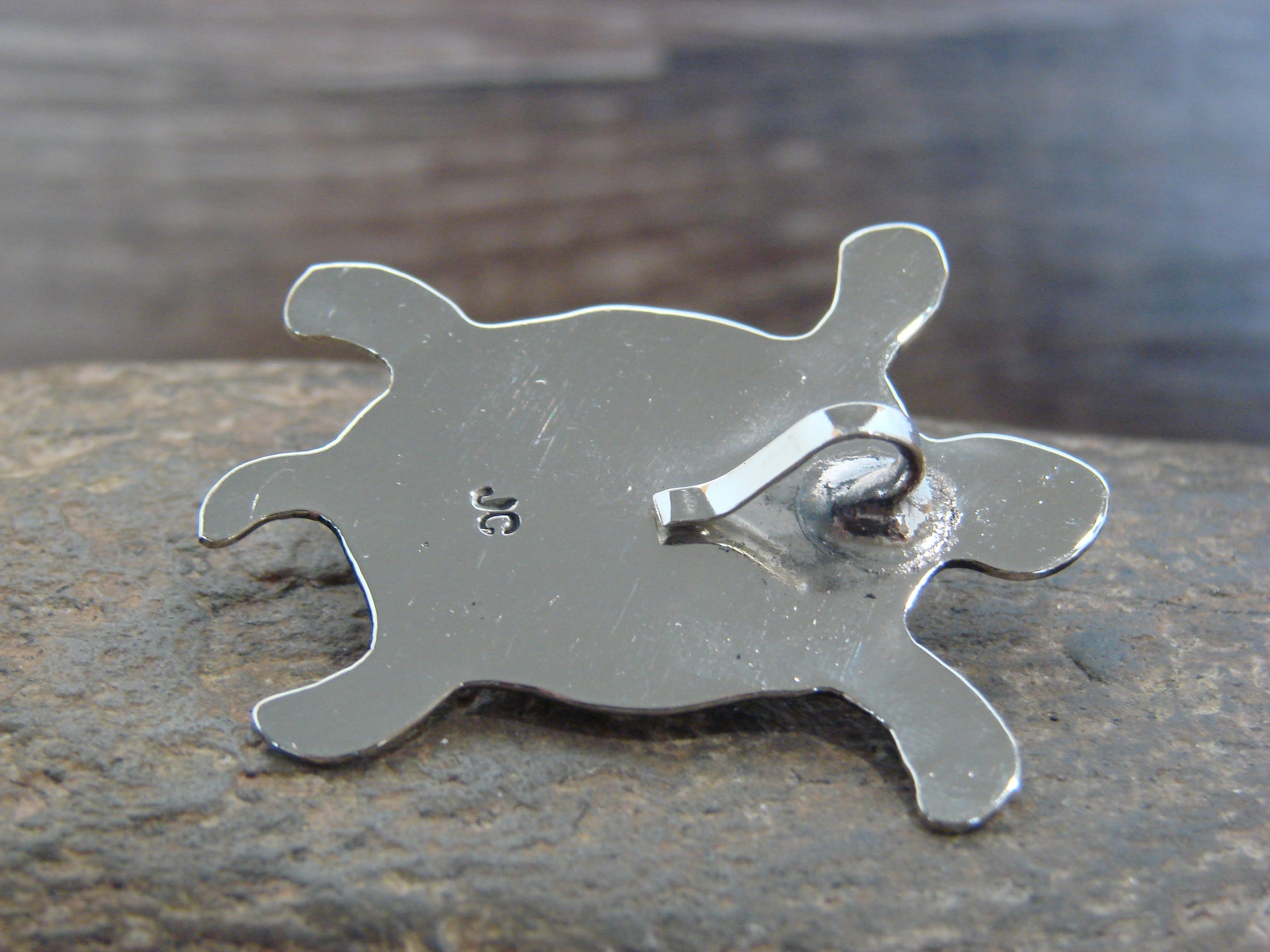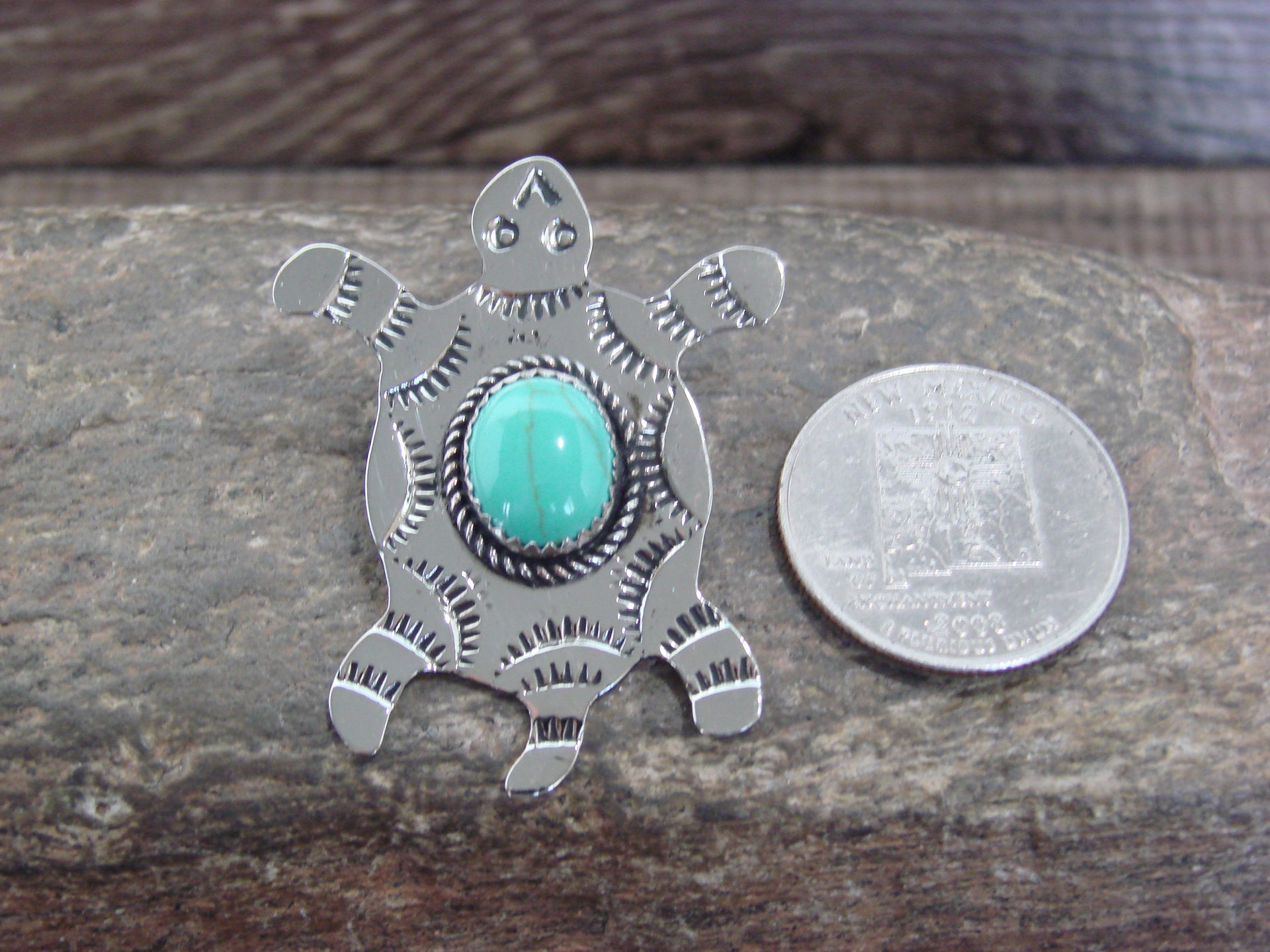 Native American Navajo Indian Nickel Silver & Turquoise Turtle Pendant from Western New Mexico. This beautiful Pendant is hand cut from Nickel Silver and features stunning traditional hand stamping throughout. The Man Made Turquoise stone is securely set into a crown Nickel Silver bezel setting. Handmade by Jackie Cleveland, wife of the late Navajo Silversmith Albert Cleveland. Signed "JC" on back. Jackie is widely known for her traditional Navajo style and hand stamping. Free gift box and shipping included!
