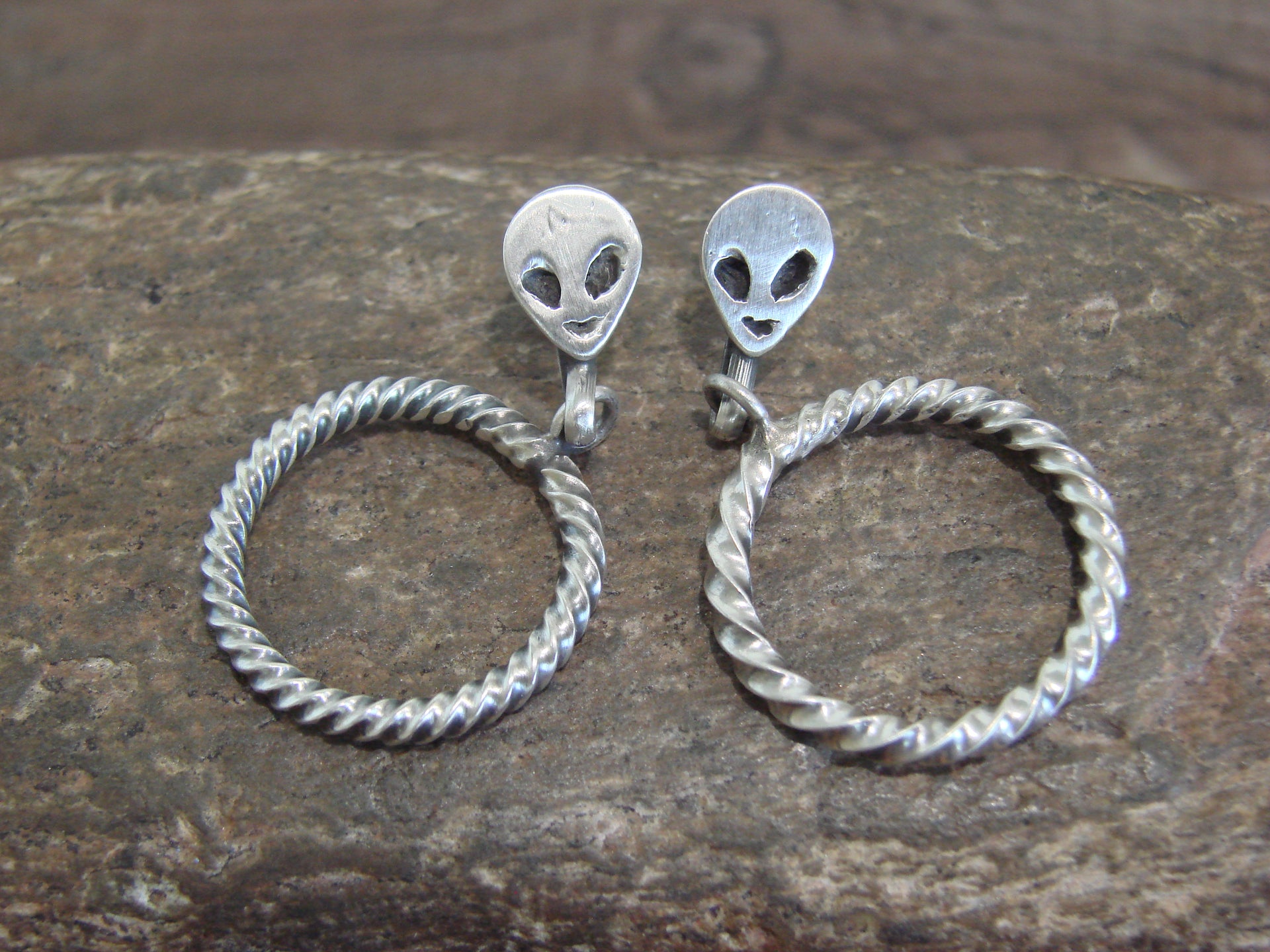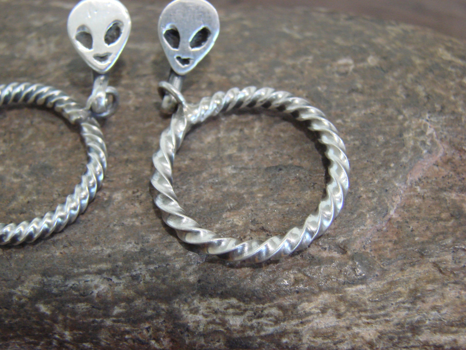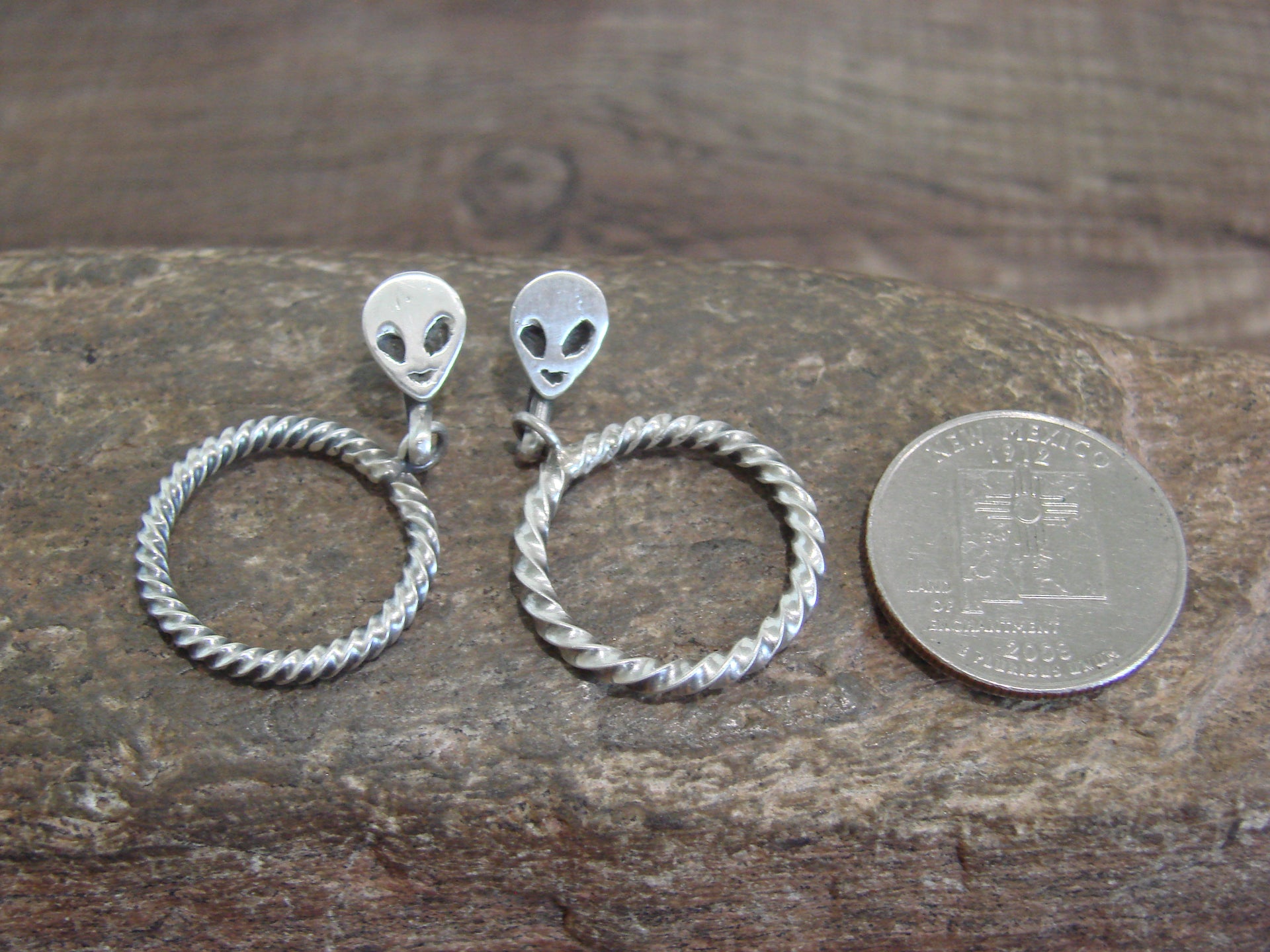Genuine Native American Navajo Indian Sterling Silver Alien Post Dangle Hoop Earrings from Western New Mexico. These Stunning Post Dangle style earrings feature Hand Stamped Sterling Silver Aliens with a Twisted Sterling Silver Hoop Dangle. This is a very nice pair of earrings! Navajo Indian handmade by Sonyei Coho. Unsigned. Free Shipping with a gift box included!