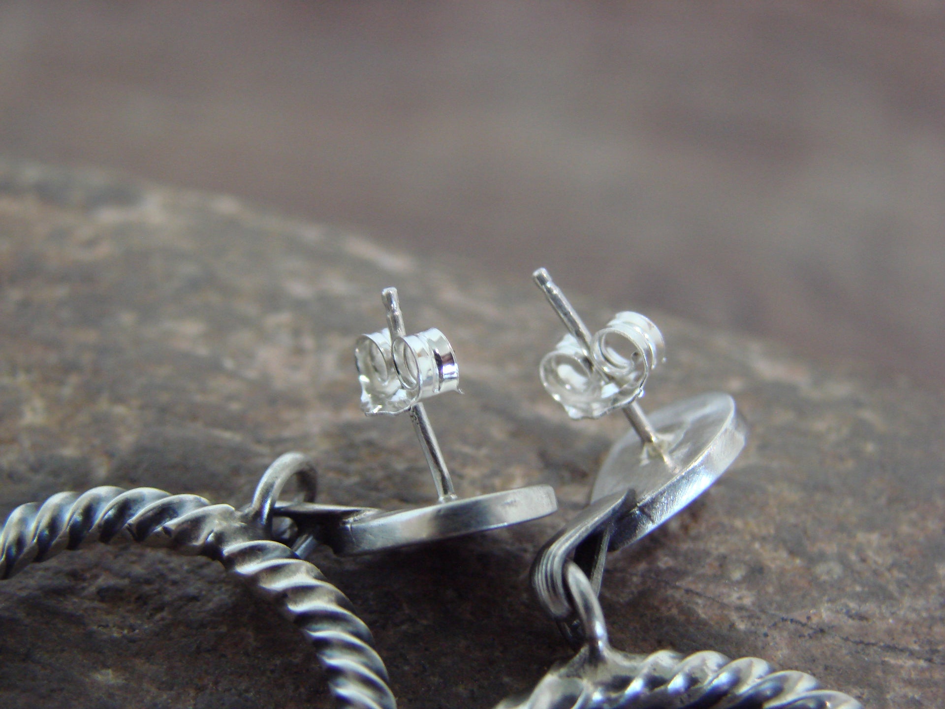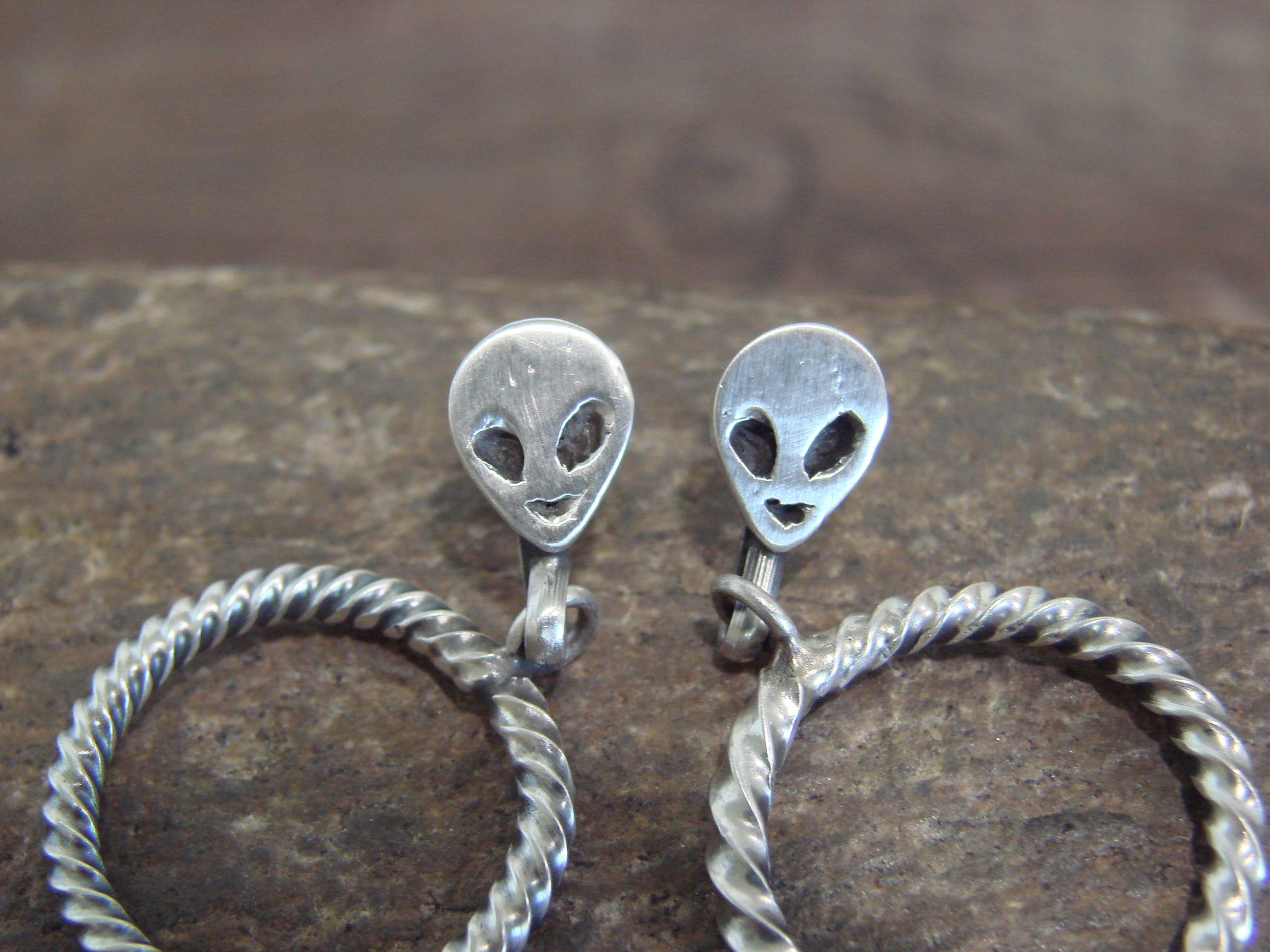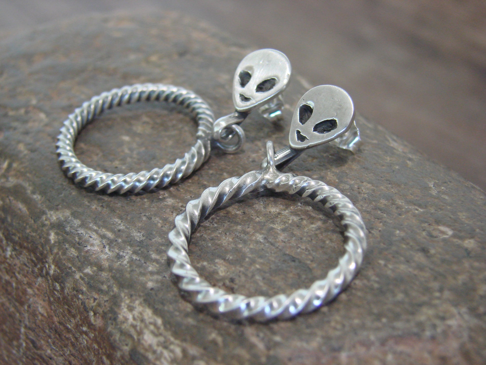 Genuine Native American Navajo Indian Sterling Silver Alien Post Dangle Hoop Earrings from Western New Mexico. These Stunning Post Dangle style earrings feature Hand Stamped Sterling Silver Aliens with a Twisted Sterling Silver Hoop Dangle. This is a very nice pair of earrings! Navajo Indian handmade by Sonyei Coho. Unsigned. Free Shipping with a gift box included!