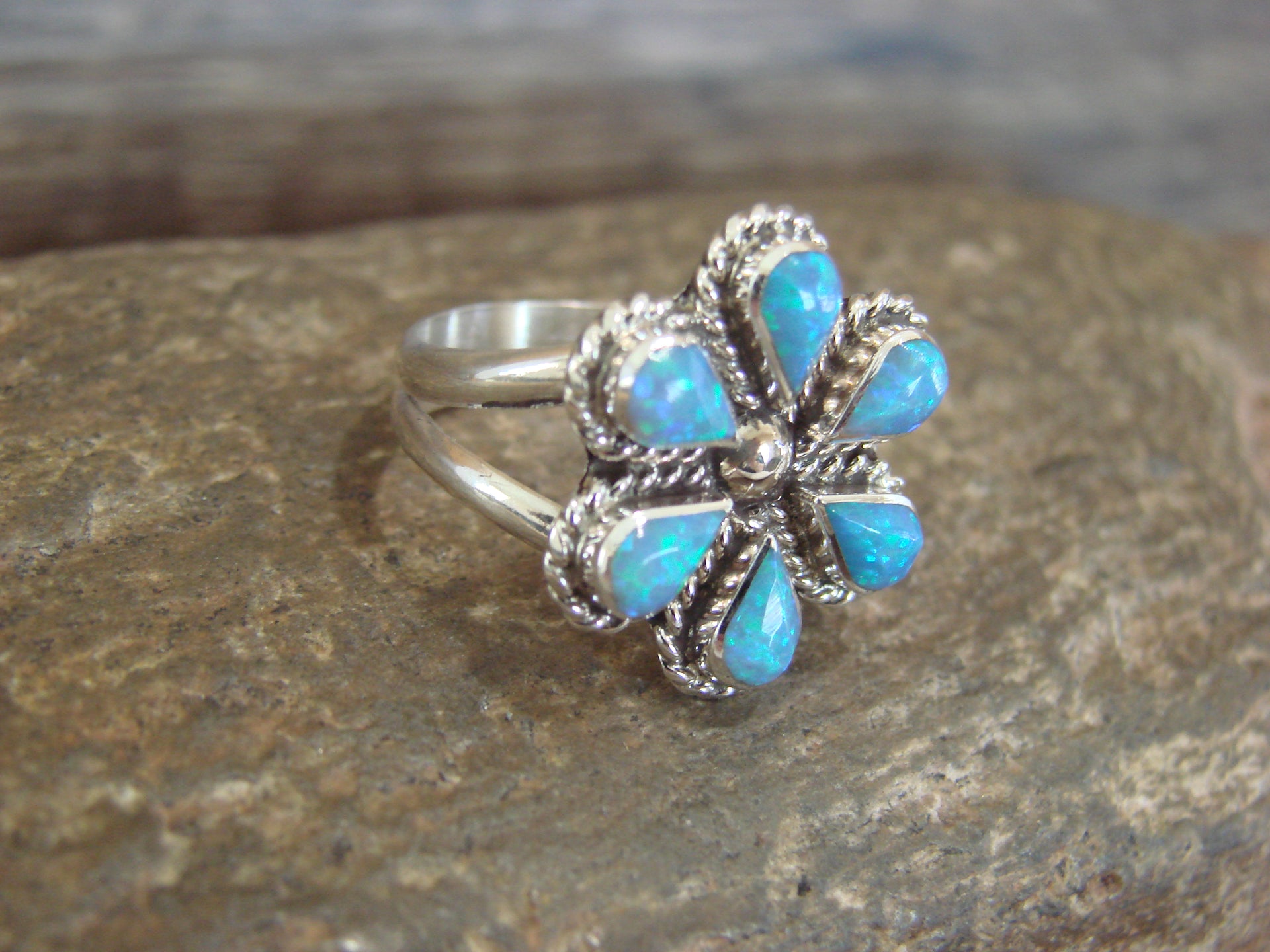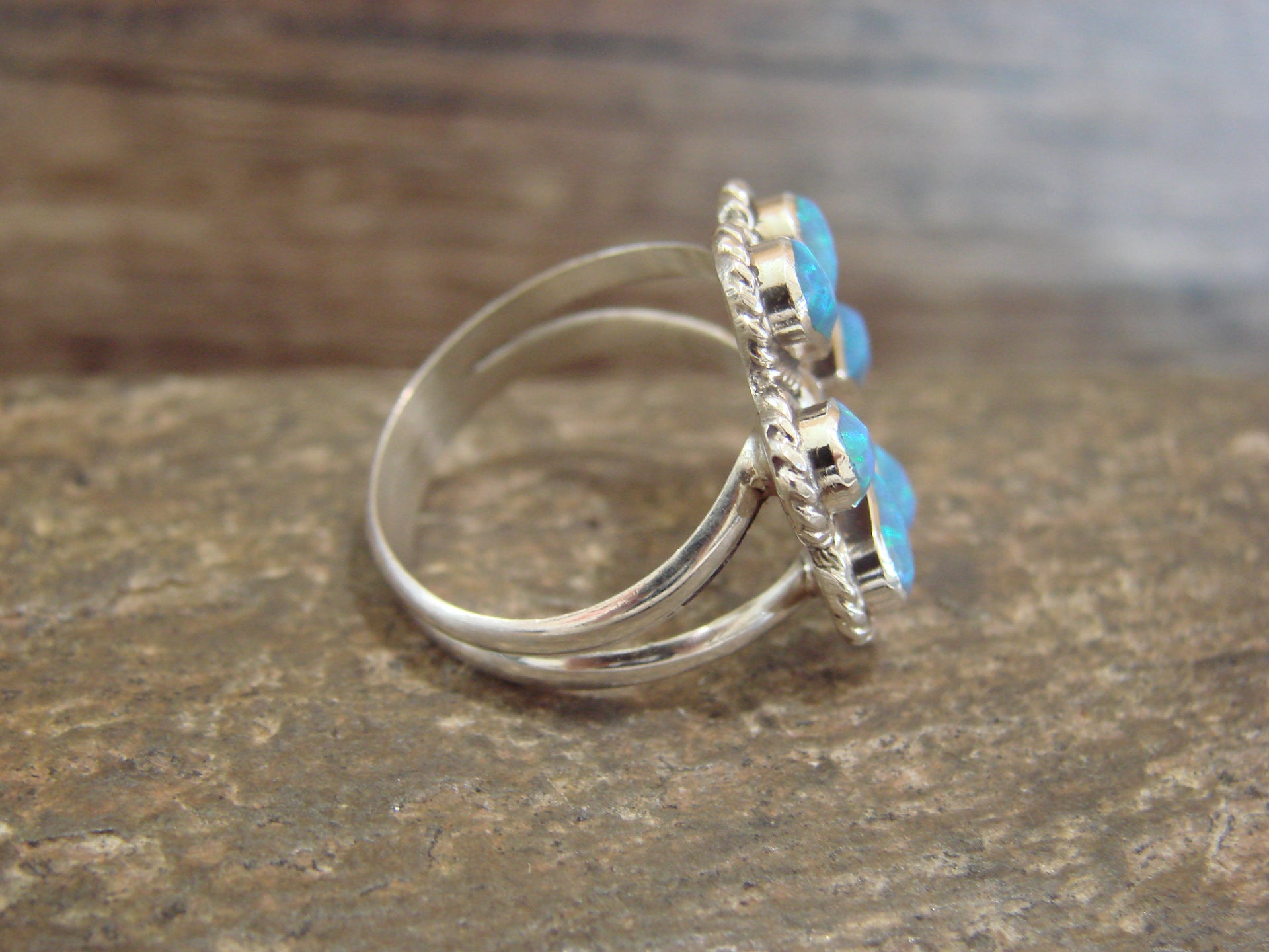 Native American Zuni Indian Sterling Silver & Blue Opal Cluster Ring from Western New Mexico. This Stunning ring features beautiful Blue Lab Opal stones Inlayed into smooth Sterling Silver. Polished to a bright shine, this is a very nice ring! Handmade by Zuni Silversmith Gina Dosedo. Signed on the back. Free Shipping and gift box included!