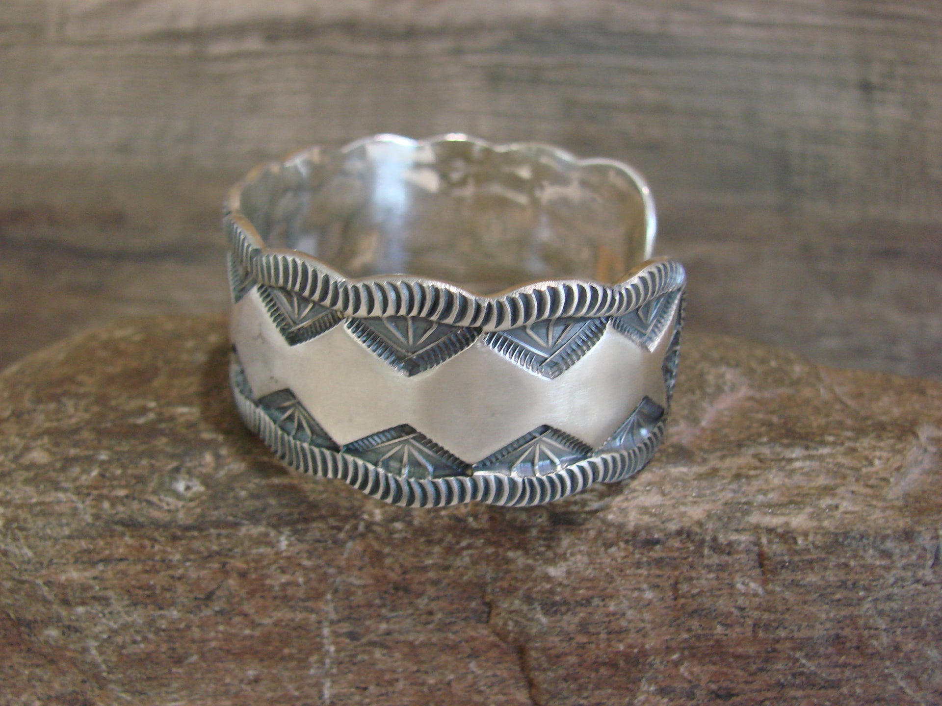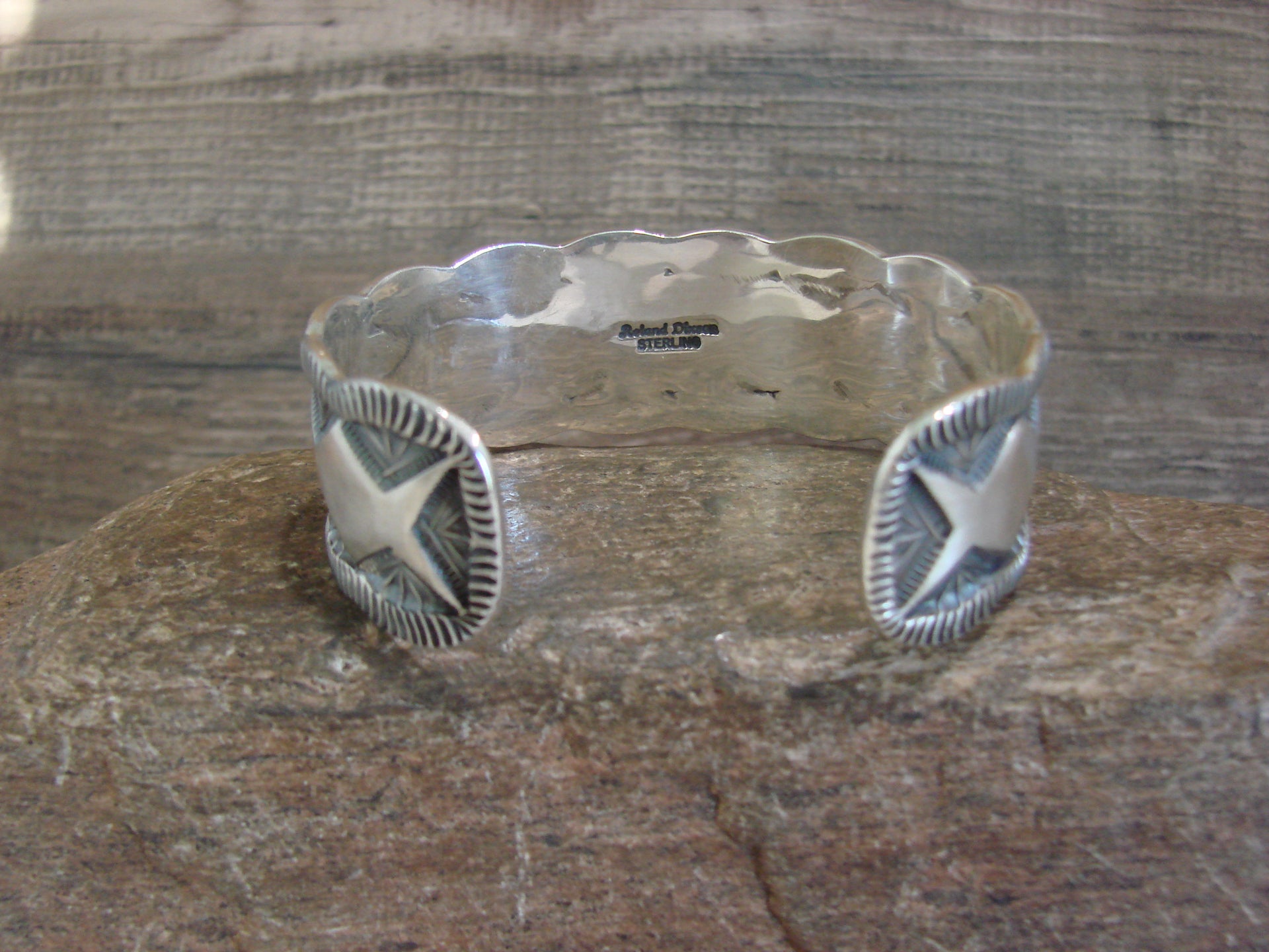 Genuine Native American Navajo Indian Sterling Silver Bracelet from Western New Mexico. This 57 gram Sterling Silver bracelet features Stunning Hand Stamping and Sterling Silver Details throughout! Fine Navajo Silversmith workmanship quality makes this bracelet a beautiful hand made masterpiece! This bracelet is Gorgeous! Navajo Indian handmade by Roland Dixon. Signed "Roland Dixon" and Stamped "Sterling" on the back. Free gift box and shipping included!