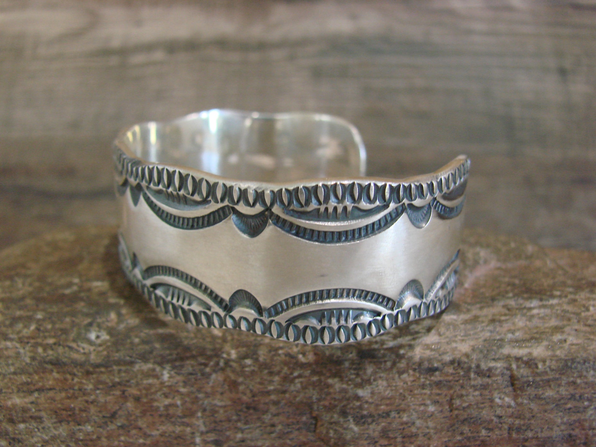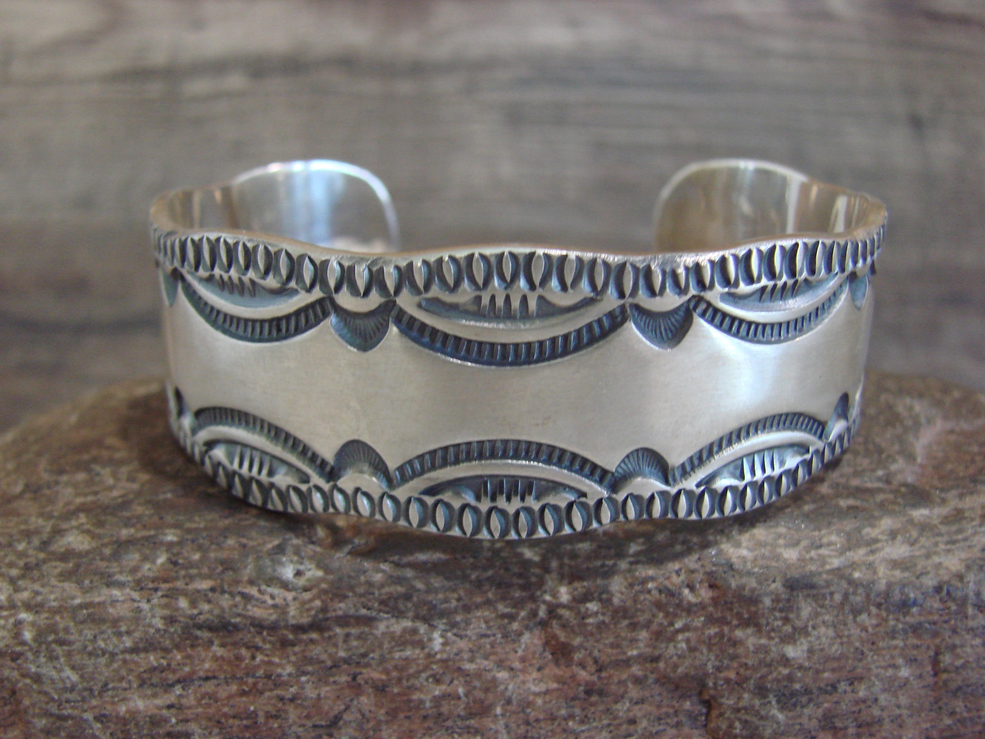 Genuine Native American Navajo Indian Sterling Silver Bracelet from Western New Mexico. This 57 gram Sterling Silver bracelet features Stunning Hand Stamping and Sterling Silver Details throughout! Fine Navajo Silversmith workmanship quality makes this bracelet a beautiful hand made masterpiece! This bracelet is Gorgeous! Navajo Indian handmade by Roland Dixon. Signed "Roland Dixon" and Stamped "Sterling" on the back. Free gift box and shipping included!