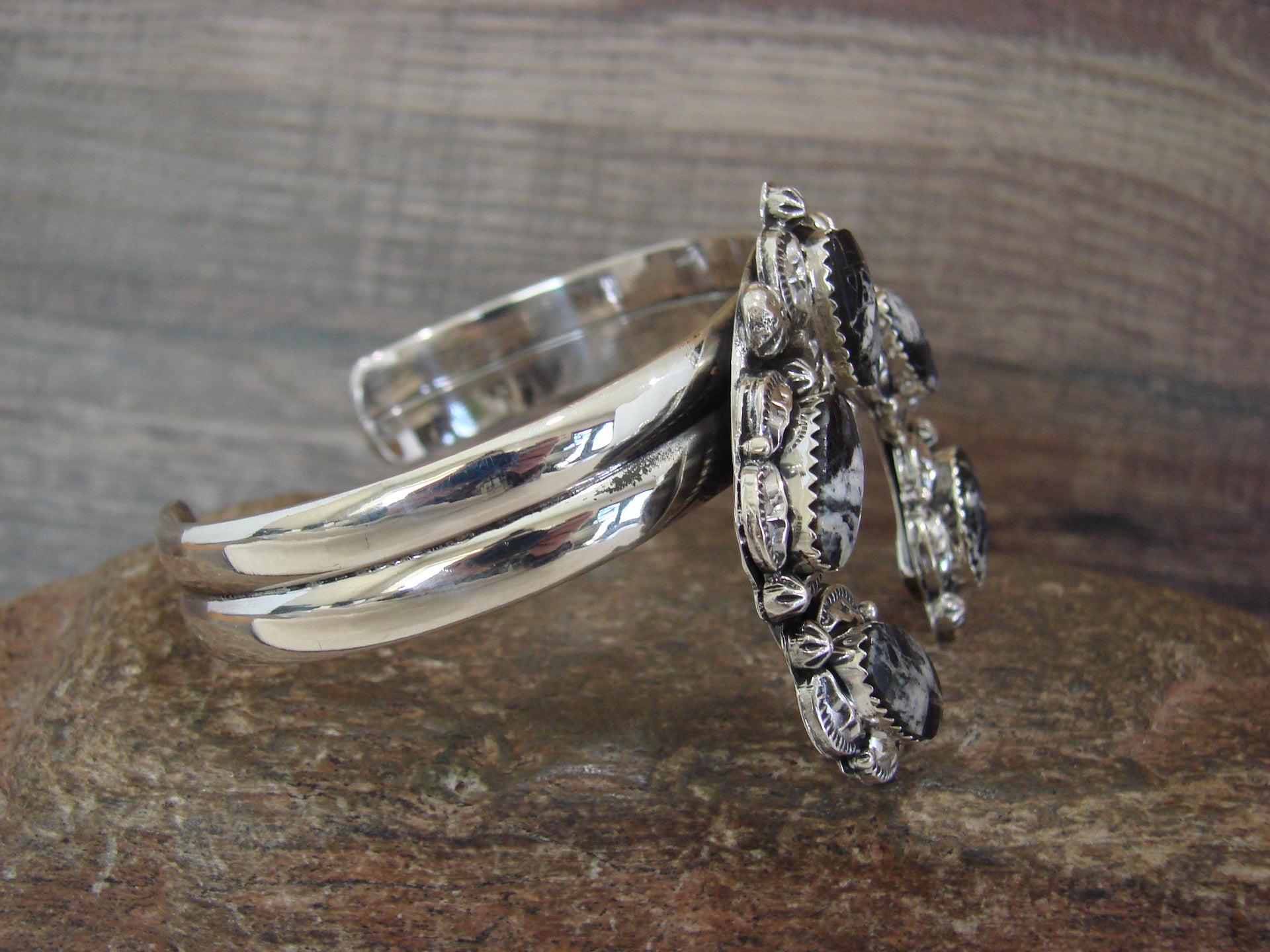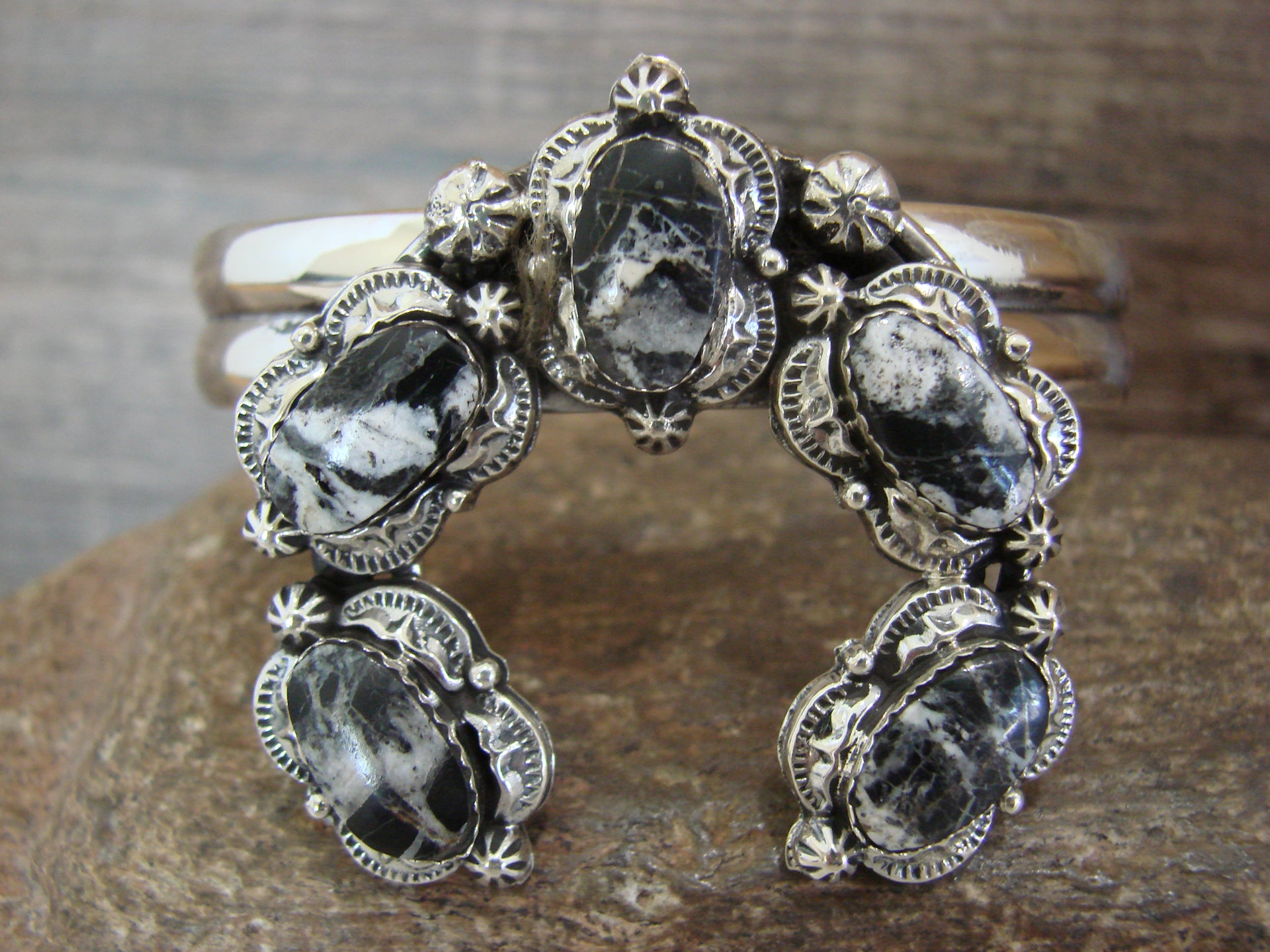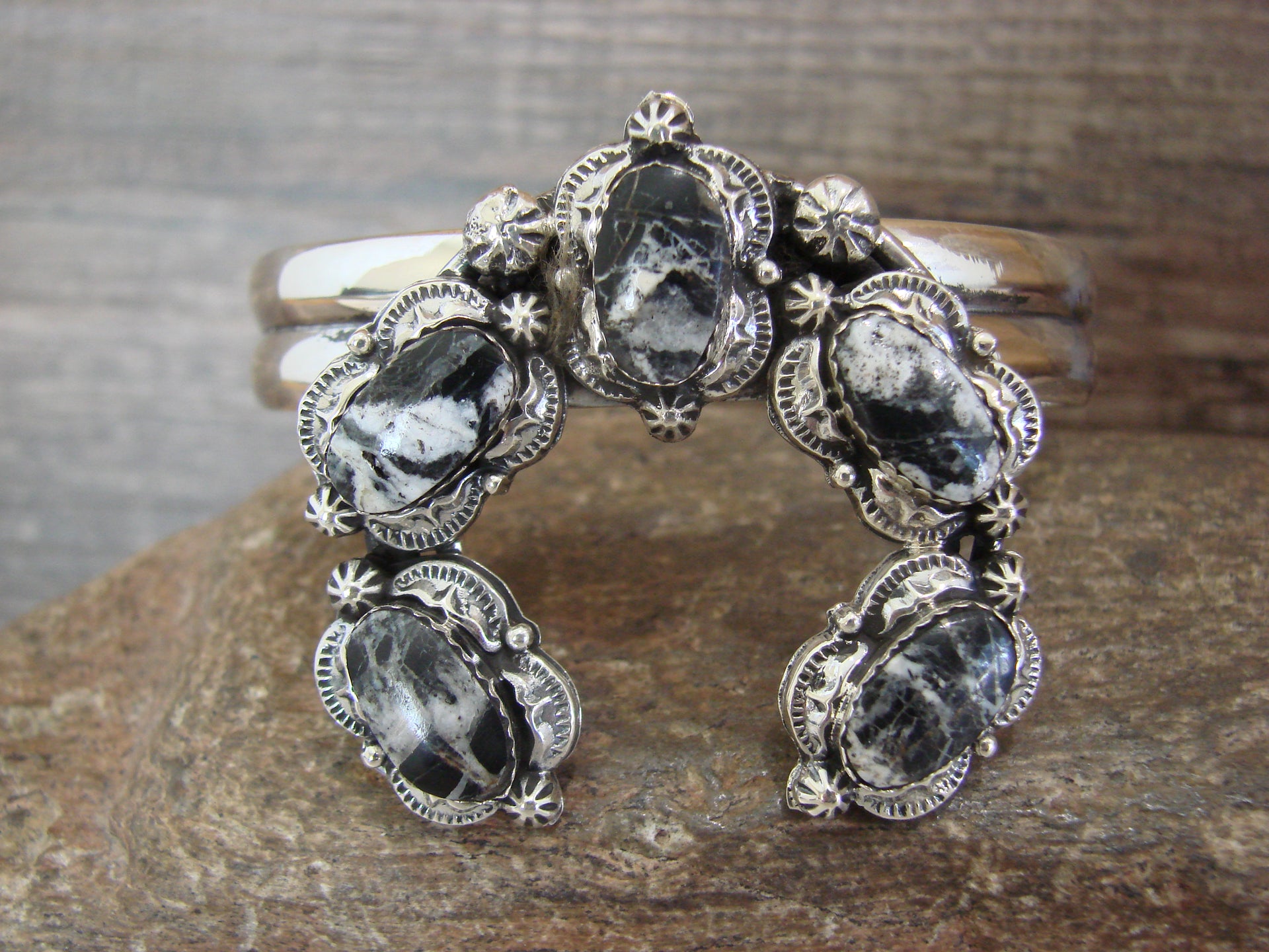 Genuine Native American Navajo Indian Sterling Silver & White Buffalo Turquoise Naja Bracelet from Western New Mexico. This Stunning bracelet features Genuine White Buffalo Turquoise stones intricately set into a Sterling Silver Naja bezel setting. Sterling Silver Details surround the stones. Fine Navajo Silversmith workmanship quality makes this bracelet a beautiful hand made masterpiece! Navajo Indian handmade by Raymond Yazzie. Signed "RY" and Stamped "Sterling" on the back. Free gift box and shipping included!