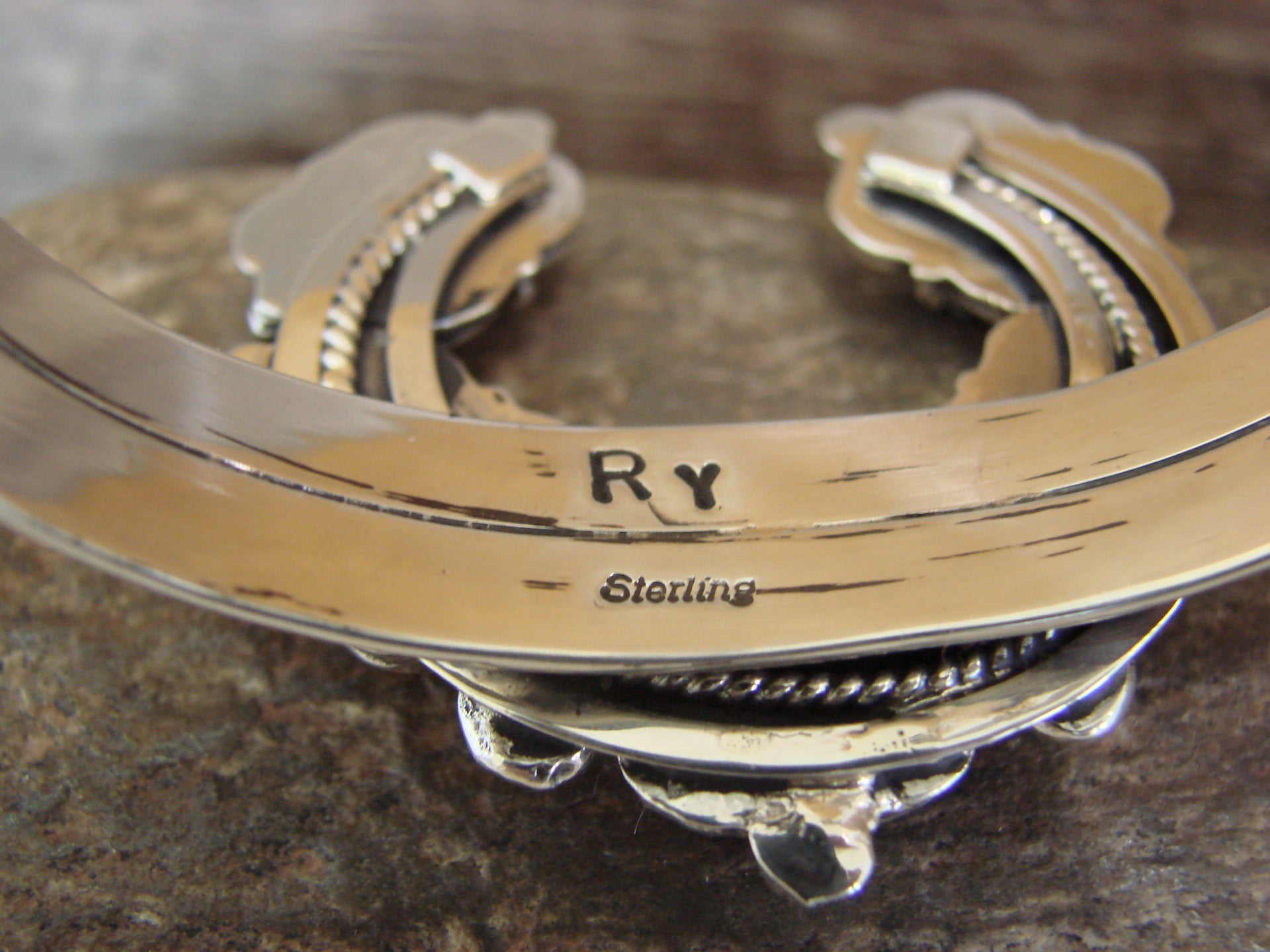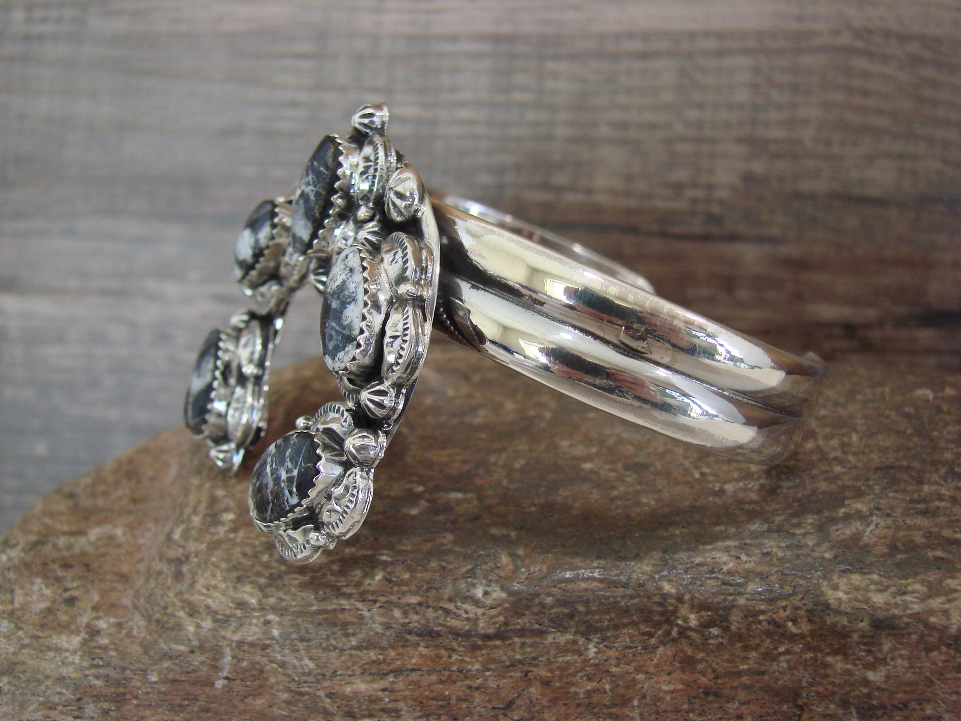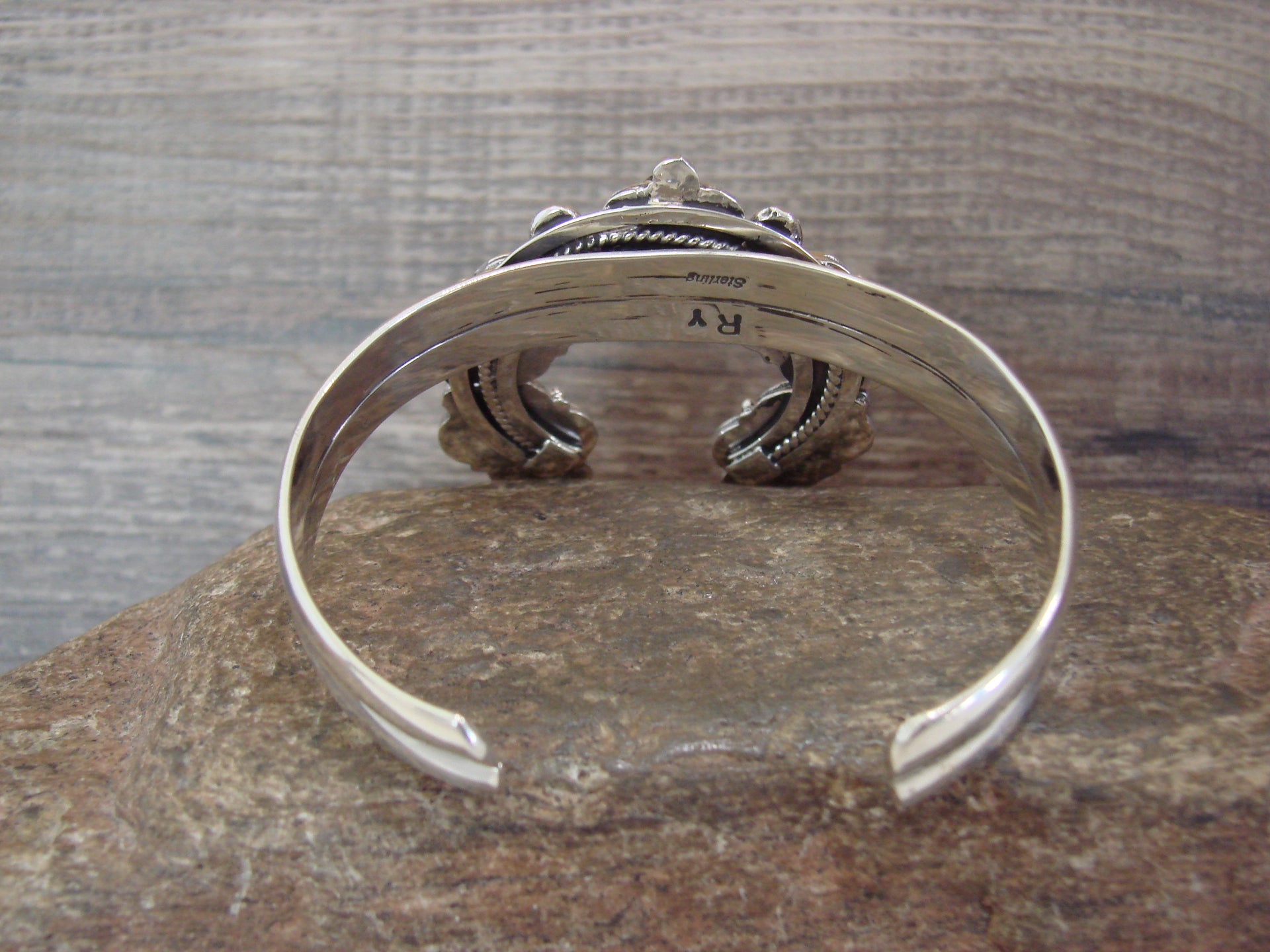 Genuine Native American Navajo Indian Sterling Silver & White Buffalo Turquoise Naja Bracelet from Western New Mexico. This Stunning bracelet features Genuine White Buffalo Turquoise stones intricately set into a Sterling Silver Naja bezel setting. Sterling Silver Details surround the stones. Fine Navajo Silversmith workmanship quality makes this bracelet a beautiful hand made masterpiece! Navajo Indian handmade by Raymond Yazzie. Signed "RY" and Stamped "Sterling" on the back. Free gift box and shipping included!