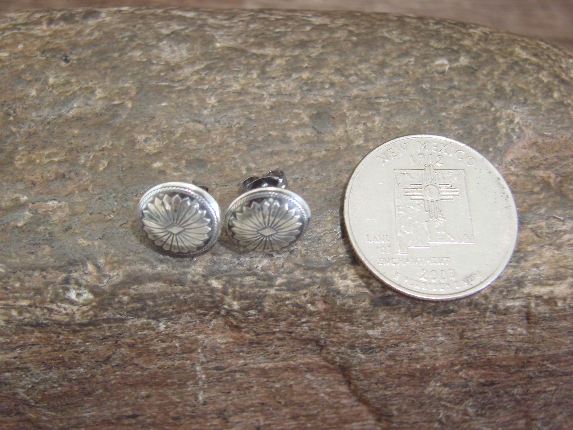 Native American Navajo Indian Sterling Silver Hand Stamped Concho Post Earrings from Western New Mexico. These small earrings feature beautiful traditional Navajo style Silverwork throughout stunning Sterling Silver Conchos. These are post style earrings with the post set in the middle of the earring. Handmade by well known Navajo Silversmith Yazzie. Unsigned. Free Shipping with a gift box included!
