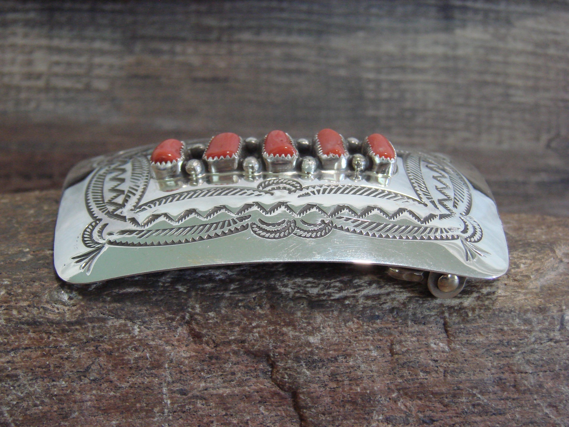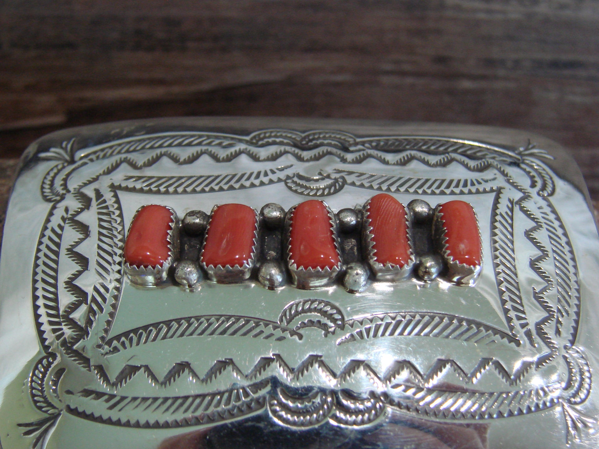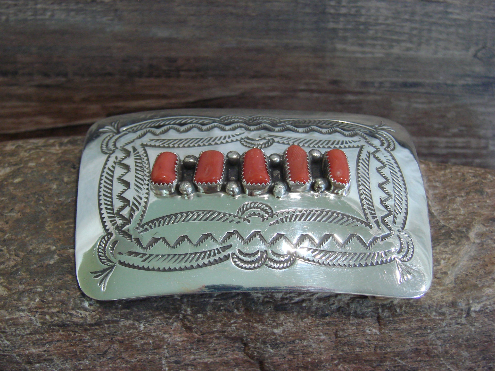 Genuine Native American Navajo Indian Hand Stamped Sterling Silver & Coral Row Belt Buckle from Western New Mexico. This Stunning buckle features 5 Genuine Coral stones intricately set into crown Sterling Silver bezel Settings. Gorgeous Hand Stamping Surround the Stones. This is a beautiful Sterling Silver Buckle! Navajo Indian handmade by J. Begay. Signed "JB" and Stamped "Sterling" on the back. Free shipping and gift box included!