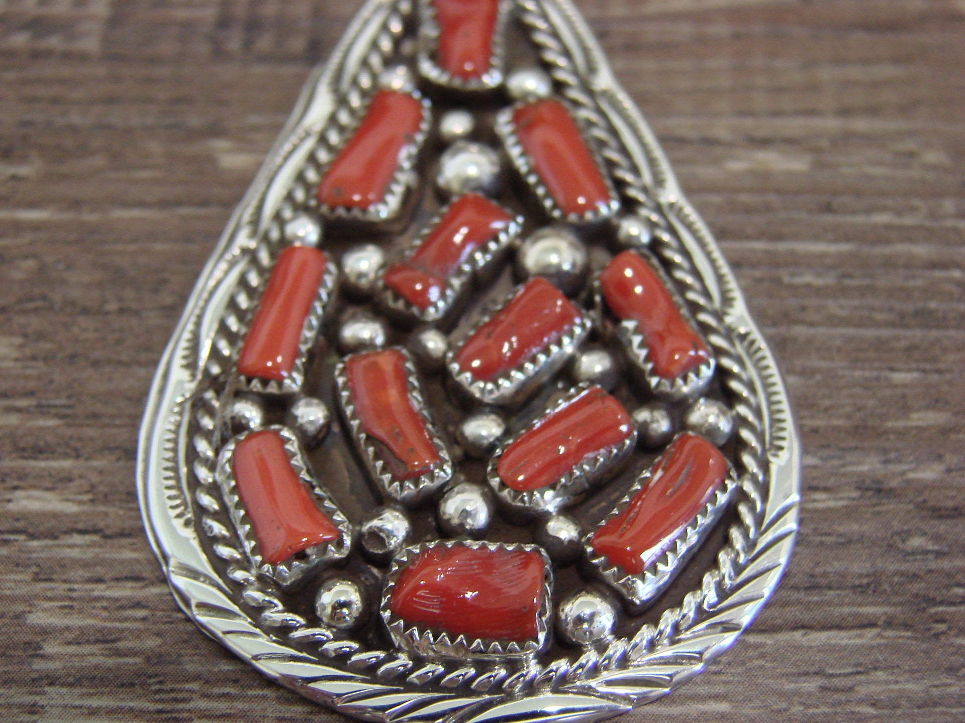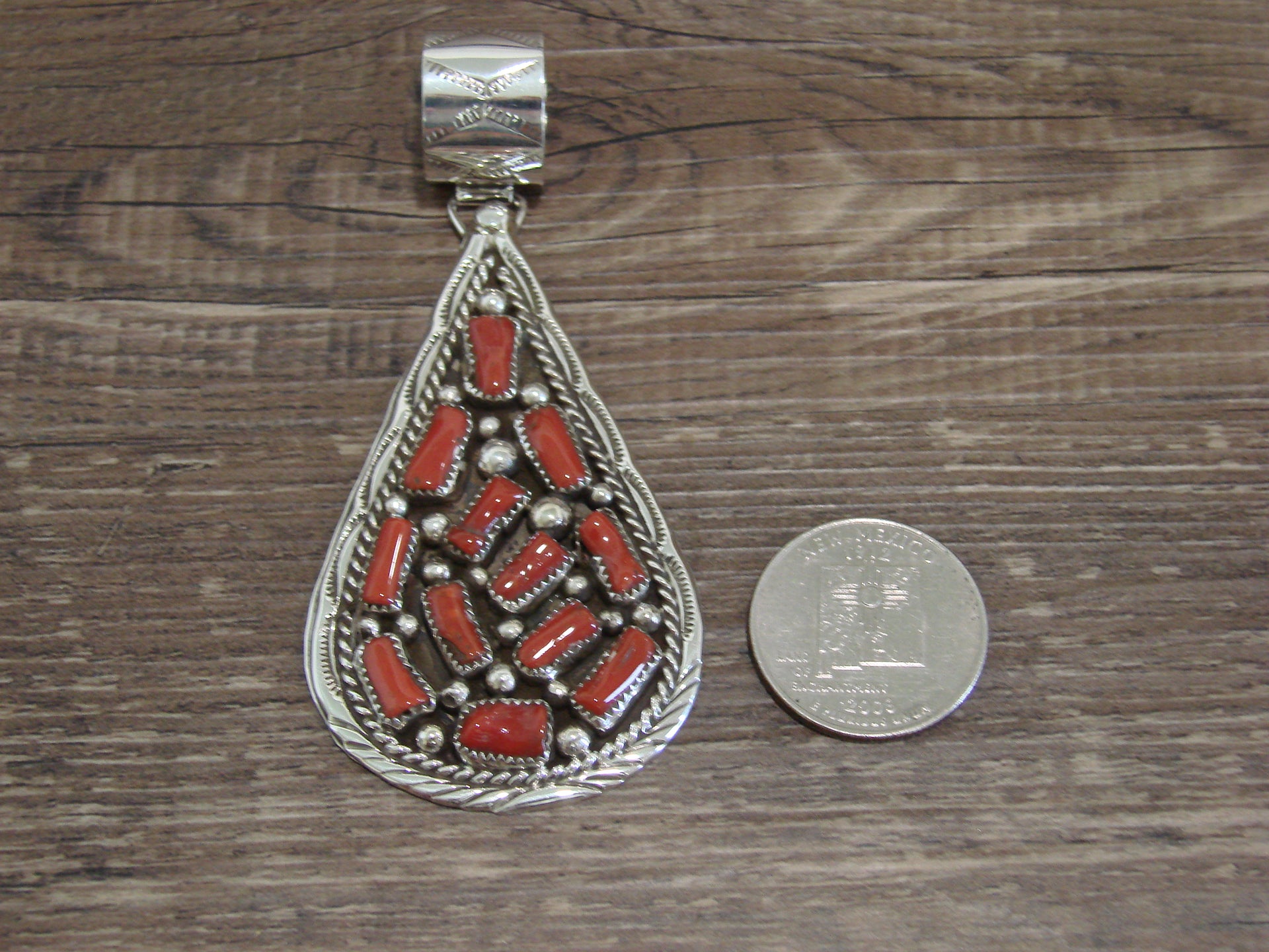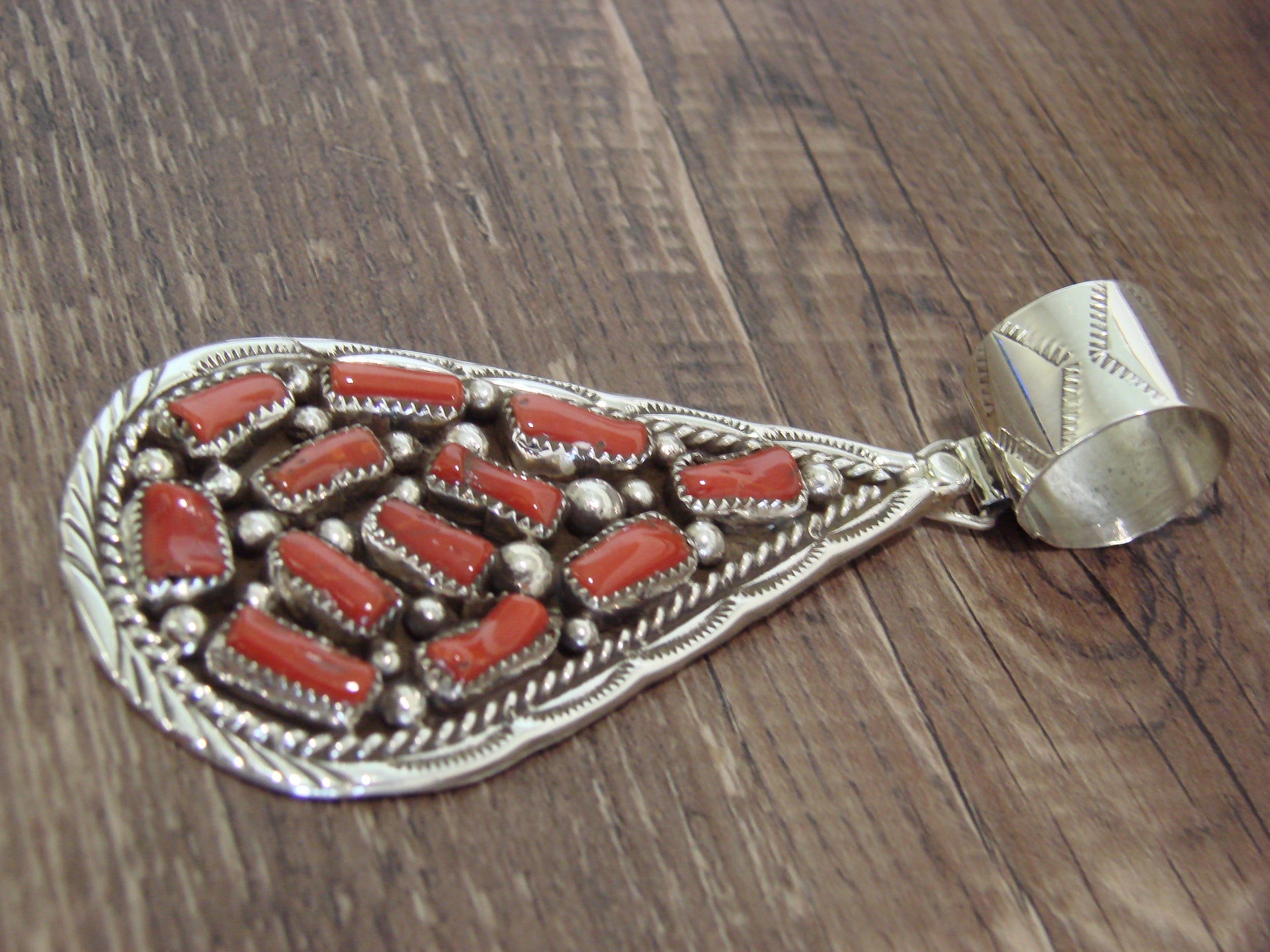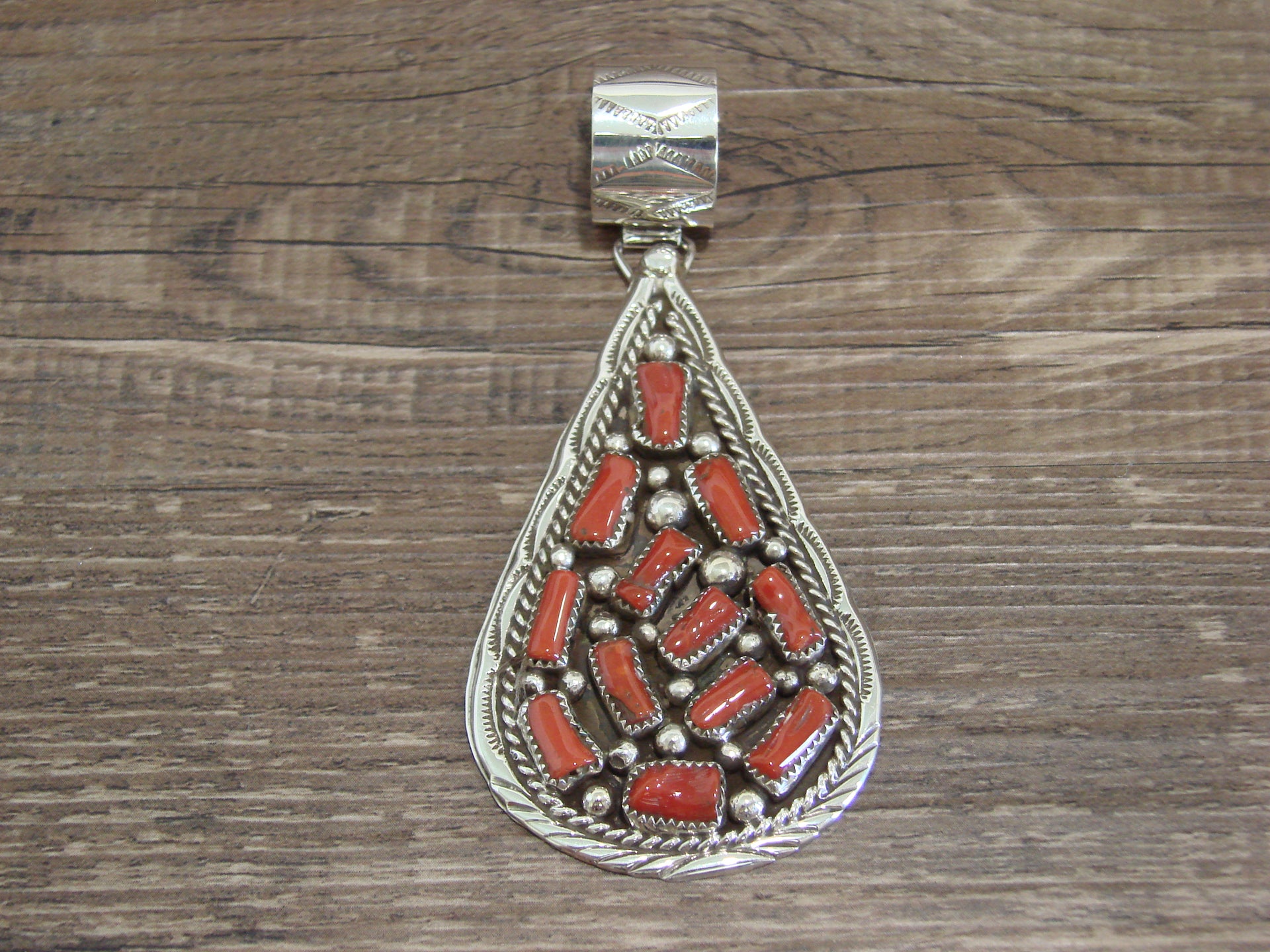 Native American Navajo Indian Sterling Silver & Coral Cluster Pendant from Western New Mexico. This pendant features a cluster of Genuine Coral stones beautifully set into crown sterling silver bezel settings. Gorgeous Sterling Silver details and Hand Stamping surround the stones. Fine Navajo Silversmith workmanship quality makes this pendant a beautiful hand made masterpiece! Handmade by Navajo artist Darlene Begay. Signed "Darlene Begay" and stamped Sterling on the back. Free Shipping with a Gift Box included!