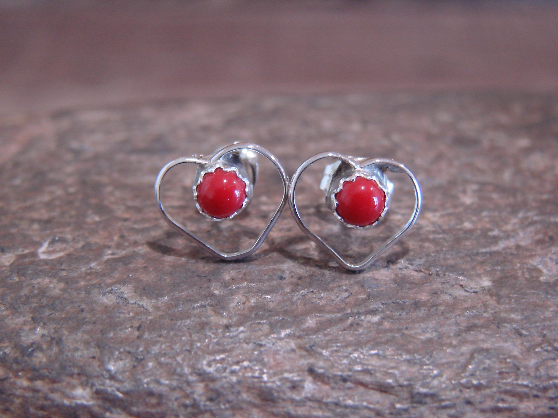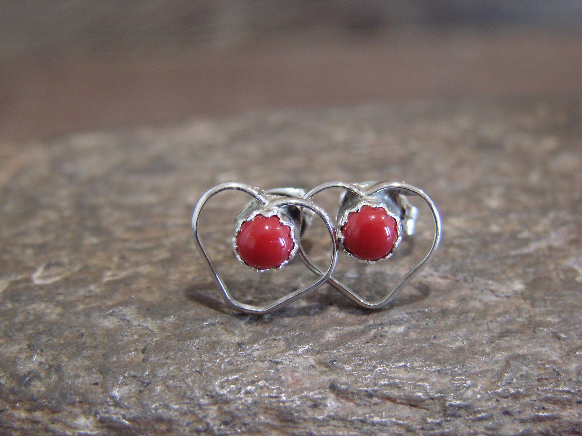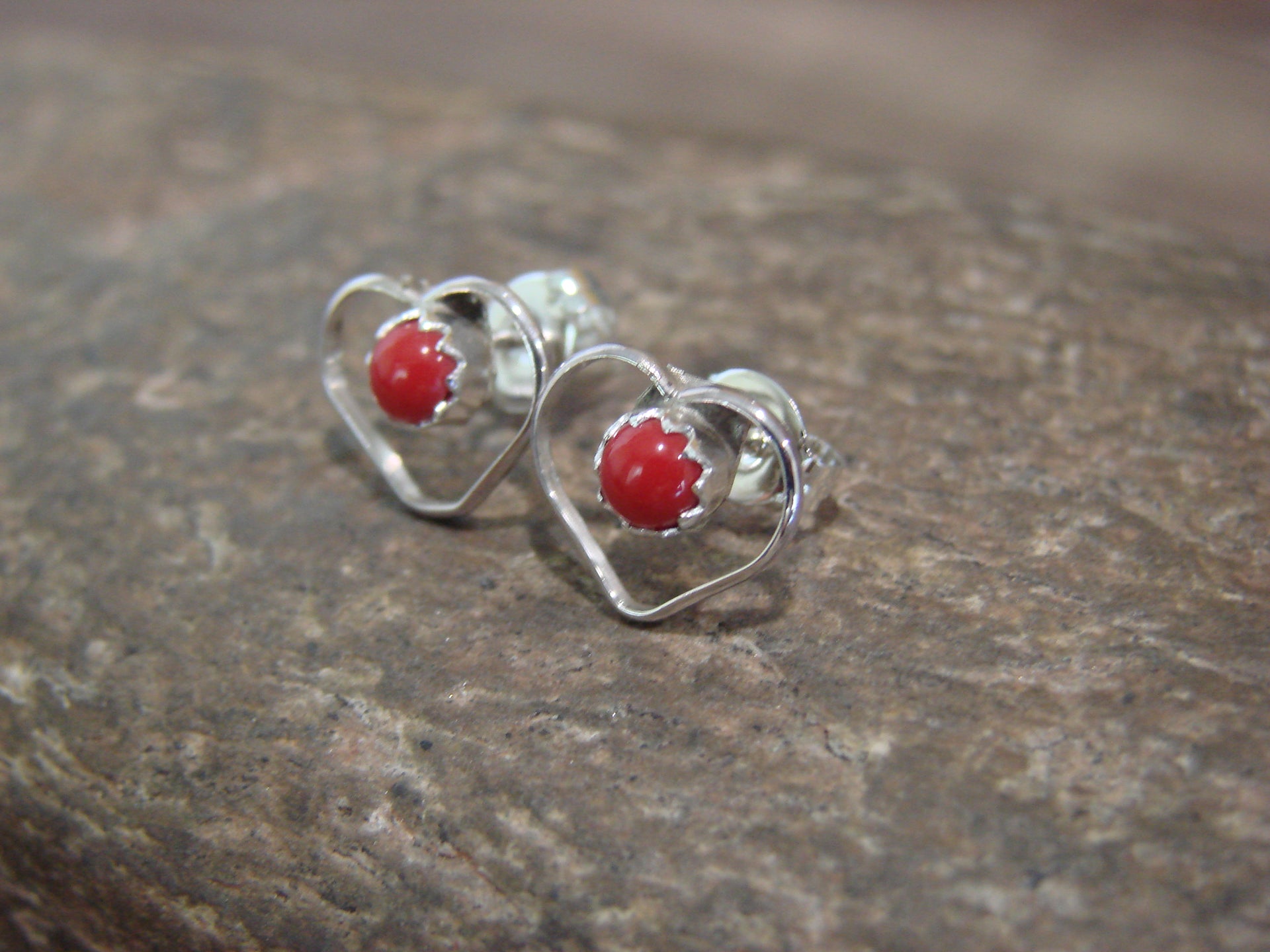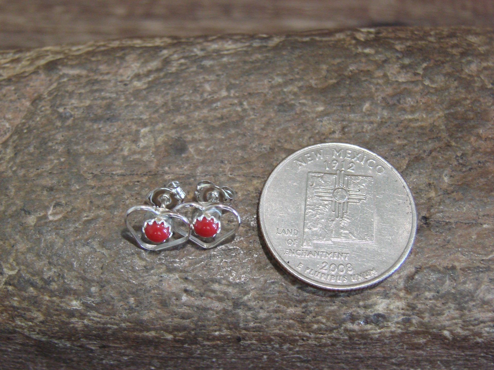 Native American Sterling Silver Coral Heart Post Earrings - Pablito