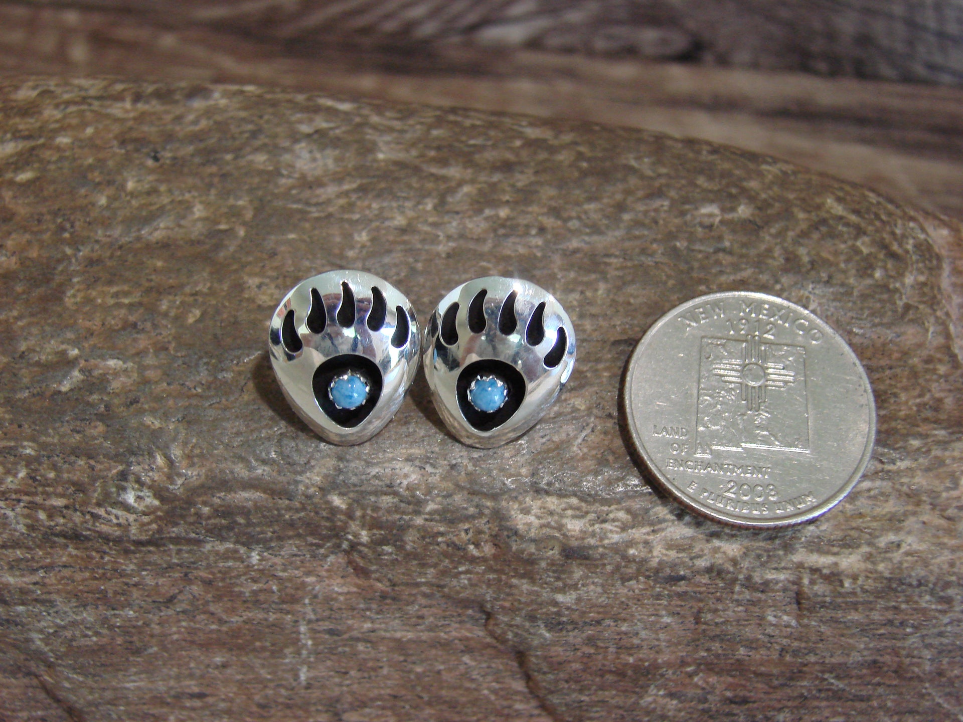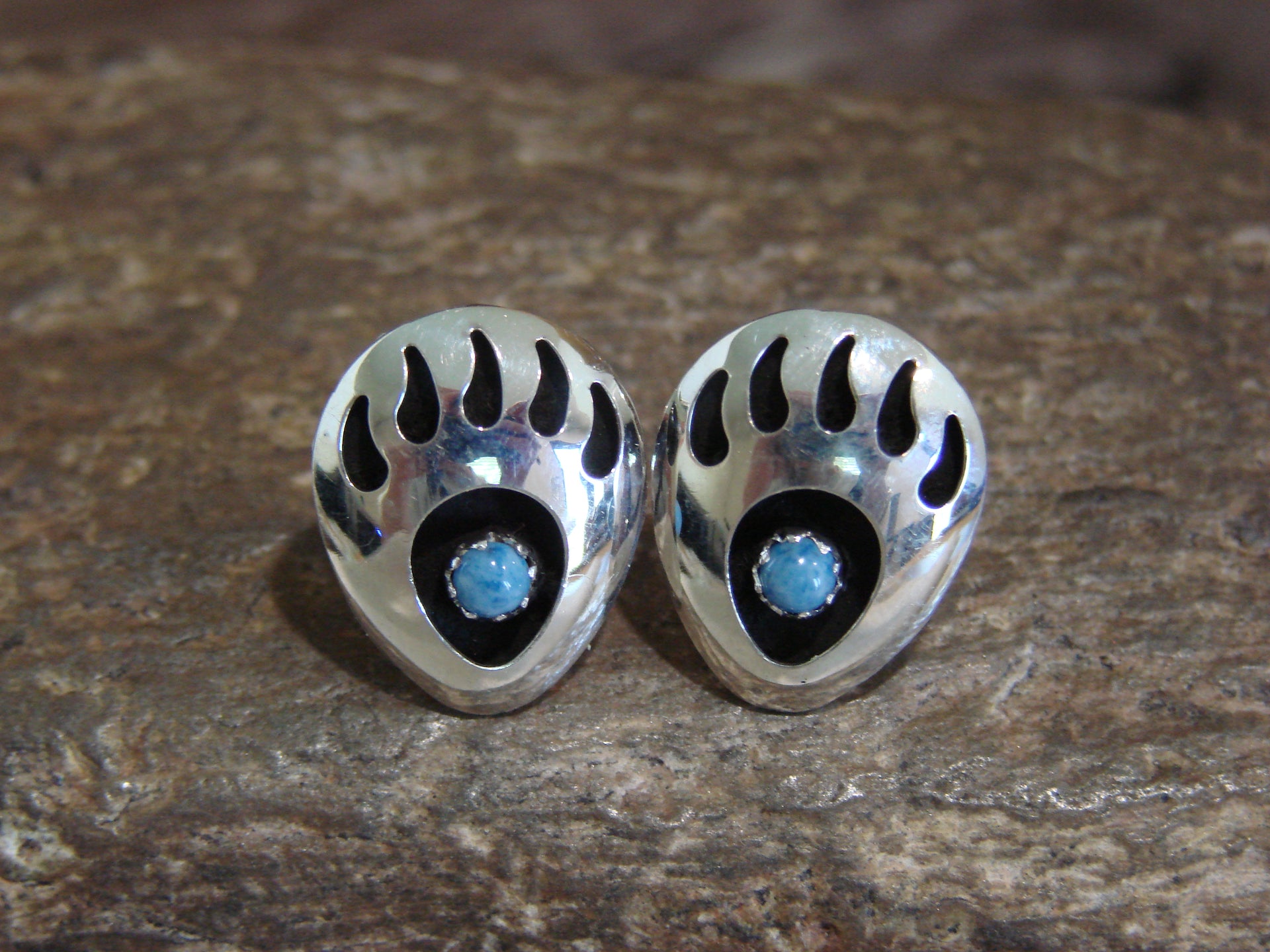 Native American Navajo Indian Sterling Silver & Denim Lapis Bear Paw Stud Post Earrings from Western New Mexico. These earrings feature a Denim Lapis stone set into a beautiful sterling silver setting. The Bear Paw is cut out around the stone giving these a shadow box look. Navajo Indian handmade by Leta Parker. Stamped "Sterling" on the back. Free shipping and gift box included!