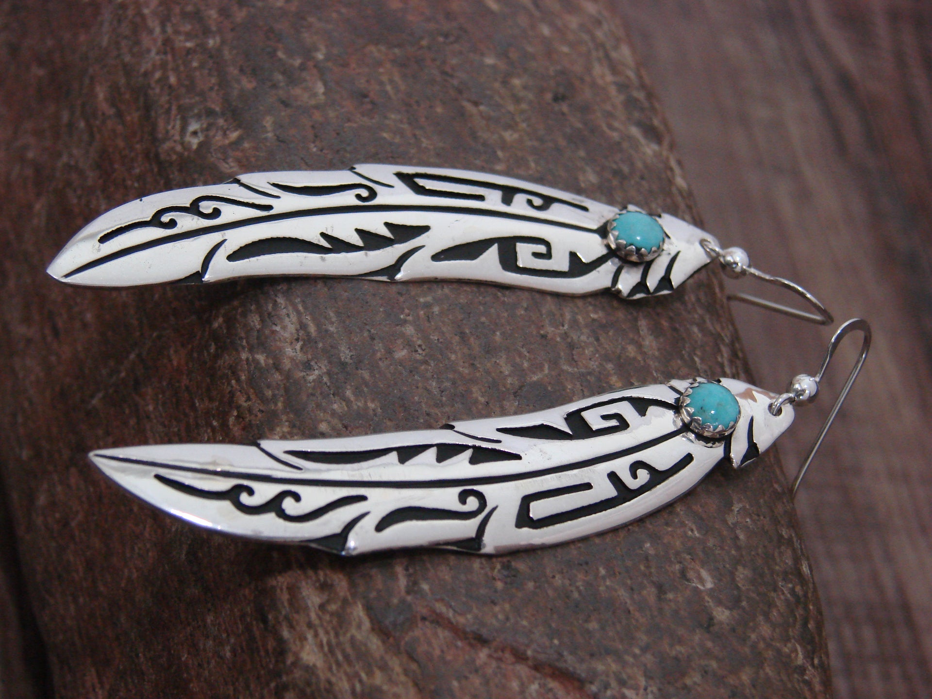 Native American Navajo Indian Sterling Silver Feather & Turquoise Petroglyph Dangle Earrings from Western New Mexico. This is a stunning pair of dangle earrings! These earrings feature beautiful hand stamping and sterling silver overlay throughout. They are accented by a genuine turquoise stone. The stone is set into a crown sterling silver bezel setting. Fine Navajo Silversmith workmanship quality makes these earrings a beautiful hand made masterpiece. Handmade by well known Navajo Silversmiths T & R Singer. Signed and Stamped "Sterling' on the back. Free shipping and gift box included!