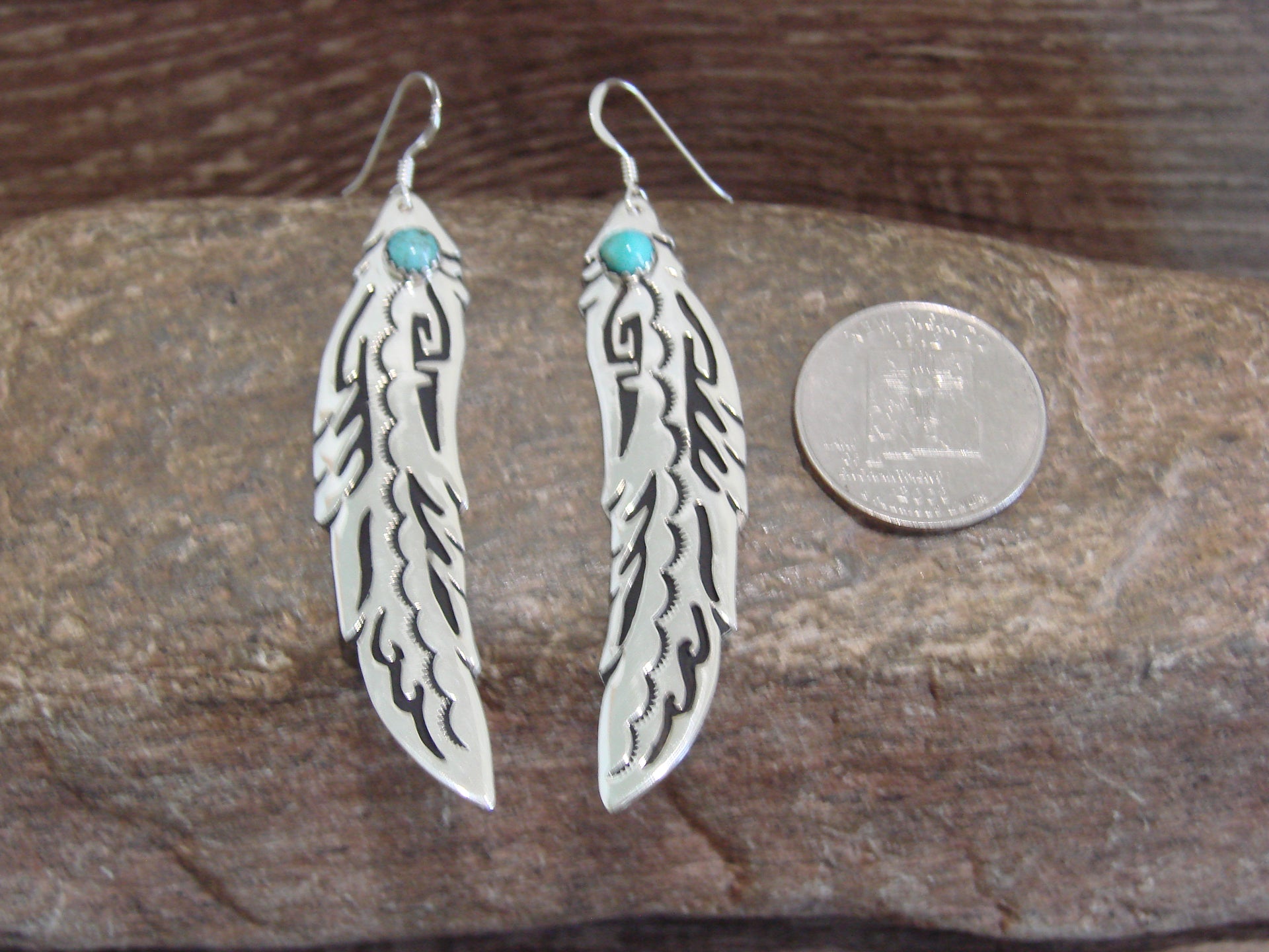 Native American Navajo Indian Sterling Silver Feather & Turquoise Petroglyph Dangle Earrings from Western New Mexico. This is a stunning pair of dangle earrings! These earrings feature beautiful hand stamping and sterling silver overlay throughout. They are accented by a genuine turquoise stone. The stone is set into a crown sterling silver bezel setting. Fine Navajo Silversmith workmanship quality makes these earrings a beautiful hand made masterpiece. Handmade by well known Navajo Silversmiths T & R Singer. Signed and Stamped Sterling on the back. Free shipping and gift box included!