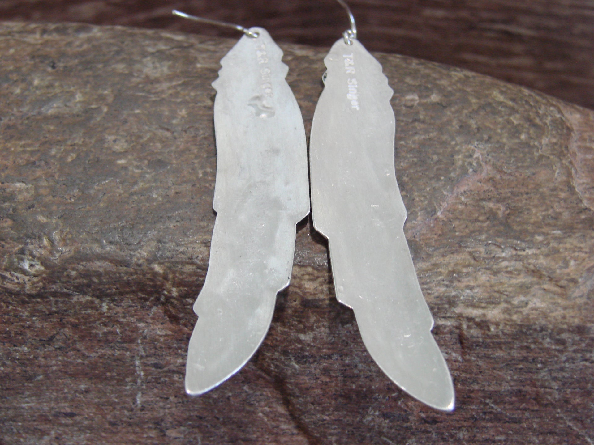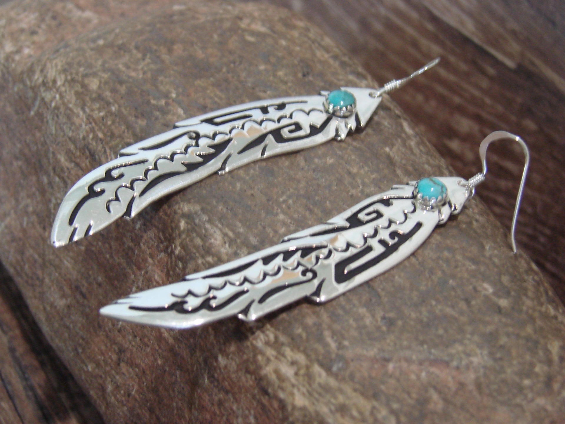 Native American Navajo Indian Sterling Silver Feather & Turquoise Petroglyph Dangle Earrings from Western New Mexico. This is a stunning pair of dangle earrings! These earrings feature beautiful hand stamping and sterling silver overlay throughout. They are accented by a genuine turquoise stone. The stone is set into a crown sterling silver bezel setting. Fine Navajo Silversmith workmanship quality makes these earrings a beautiful hand made masterpiece. Handmade by well known Navajo Silversmiths T & R Singer. Signed and Stamped Sterling on the back. Free shipping and gift box included!
