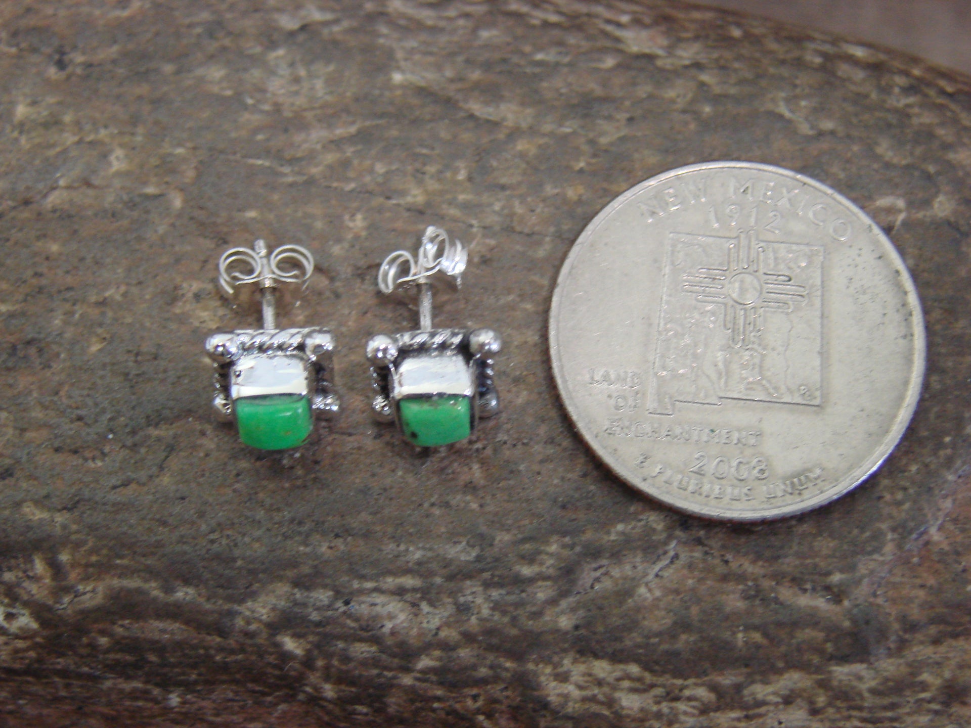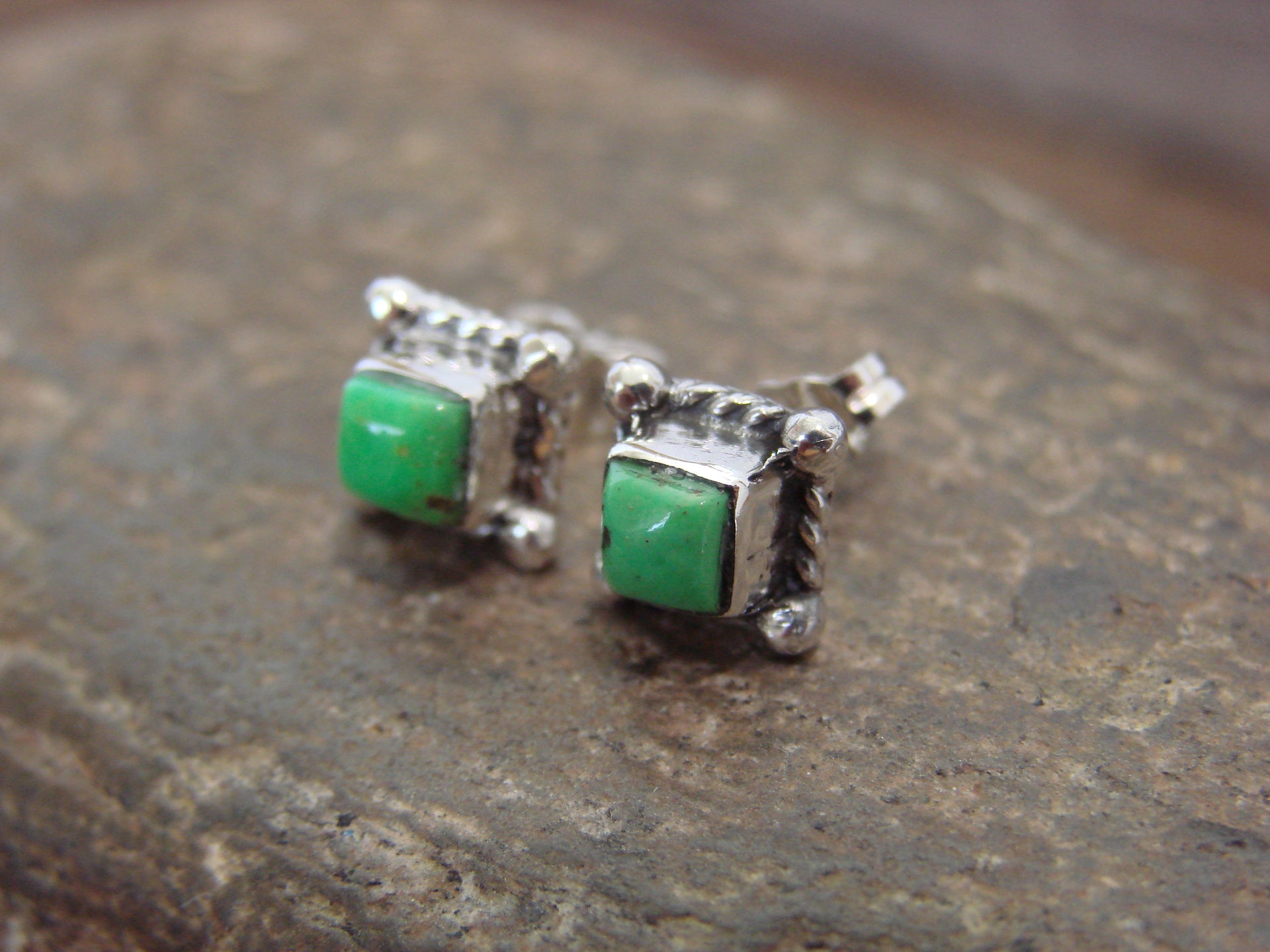Genuine Native American Navajo Indian Sterling Silver & Gaspeite Square Stud Post Earrings from Western New Mexico. These earrings feature a Gaspeite stone set into a beautiful, smooth sterling silver bezel setting. This is a Gorgeous pair of earrings! Navajo Indian handmade by Sheena Jack. Unsigned. Free shipping and gift box included!