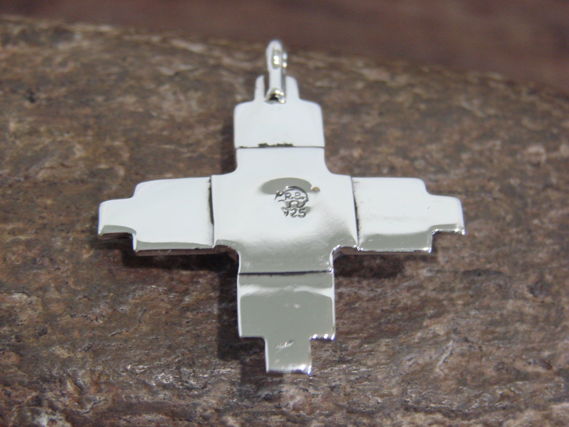 Genuine Native American Navajo Indian Sterling Silver & Gaspeite Zia Symbol Pendant from Western New Mexico. This Beautiful pendant features a Genuine Gaspeite stone intricately set into a crown Sterling Silver bezel setting within the center of a Smooth Sterling Silver Zia Cross. This Zia is Genuine and Stunning! Navajo Indian handmade by Ryntanna Yazzie. Hallmarked on the back. Free shipping and gift box included!