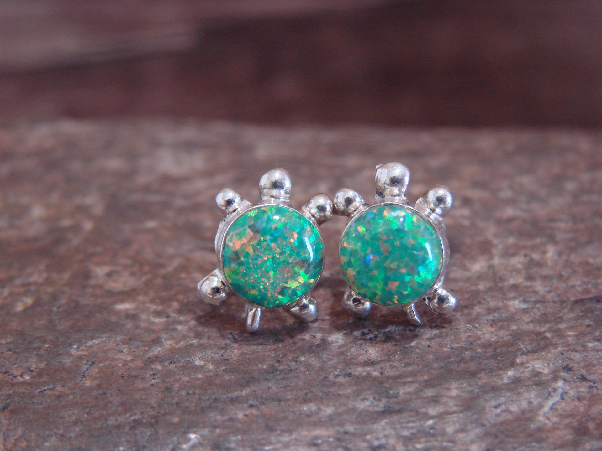 Native American Zuni Indian Sterling Silver & Opal Turtle Post Earrings from Western New Mexico. These Stunning earrings feature Lab Opal stones beautifully set into a sterling silver turtle setting. The sterling silver work surrounding the earrings is very nicely detailed and polished to a bright finish! Zuni Indian handmade by Richard & Trista Siow. Unsigned. Free Shipping and Gift Box included!