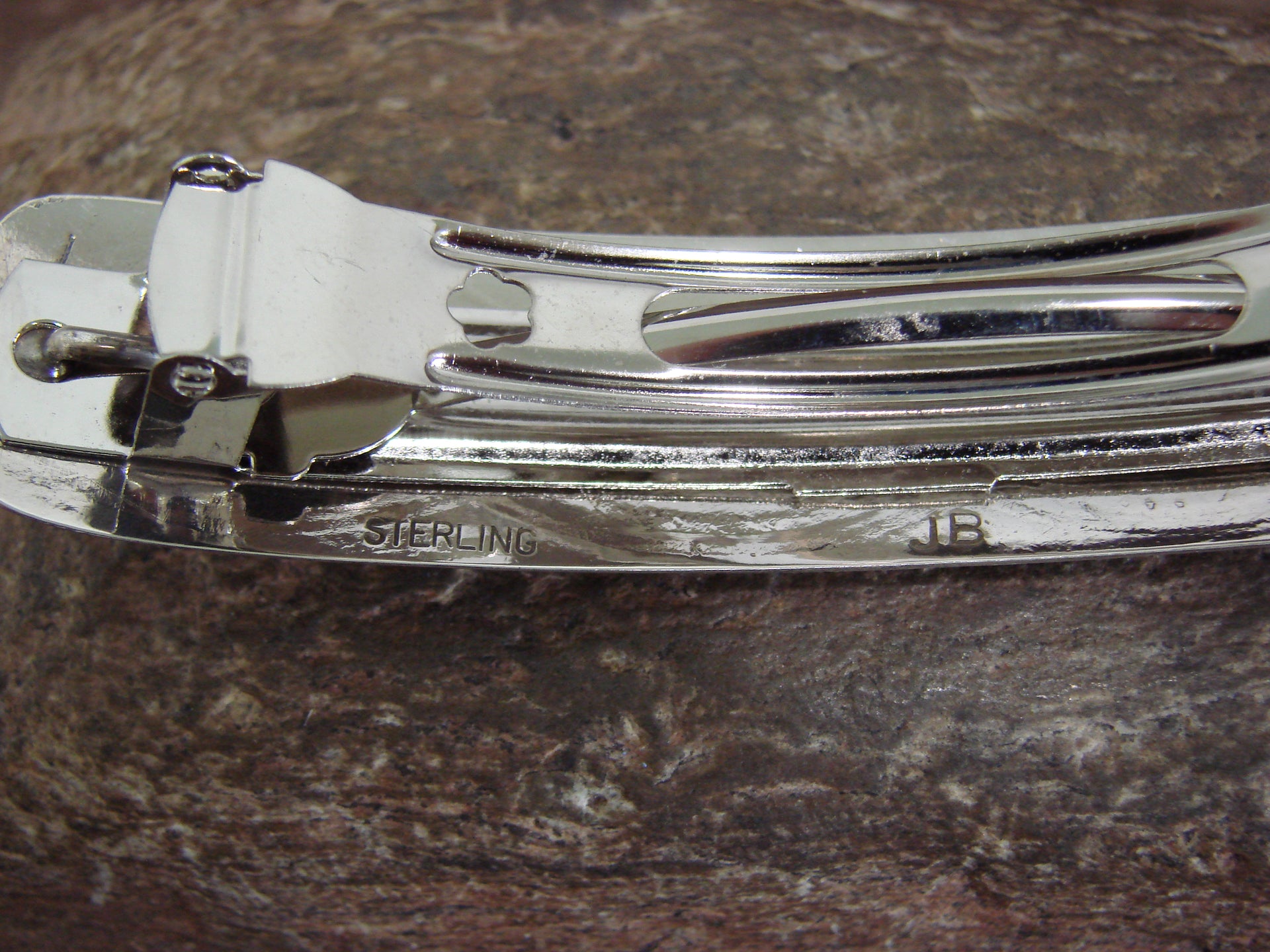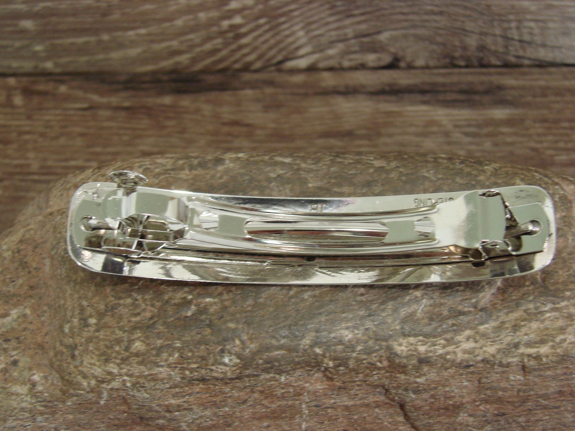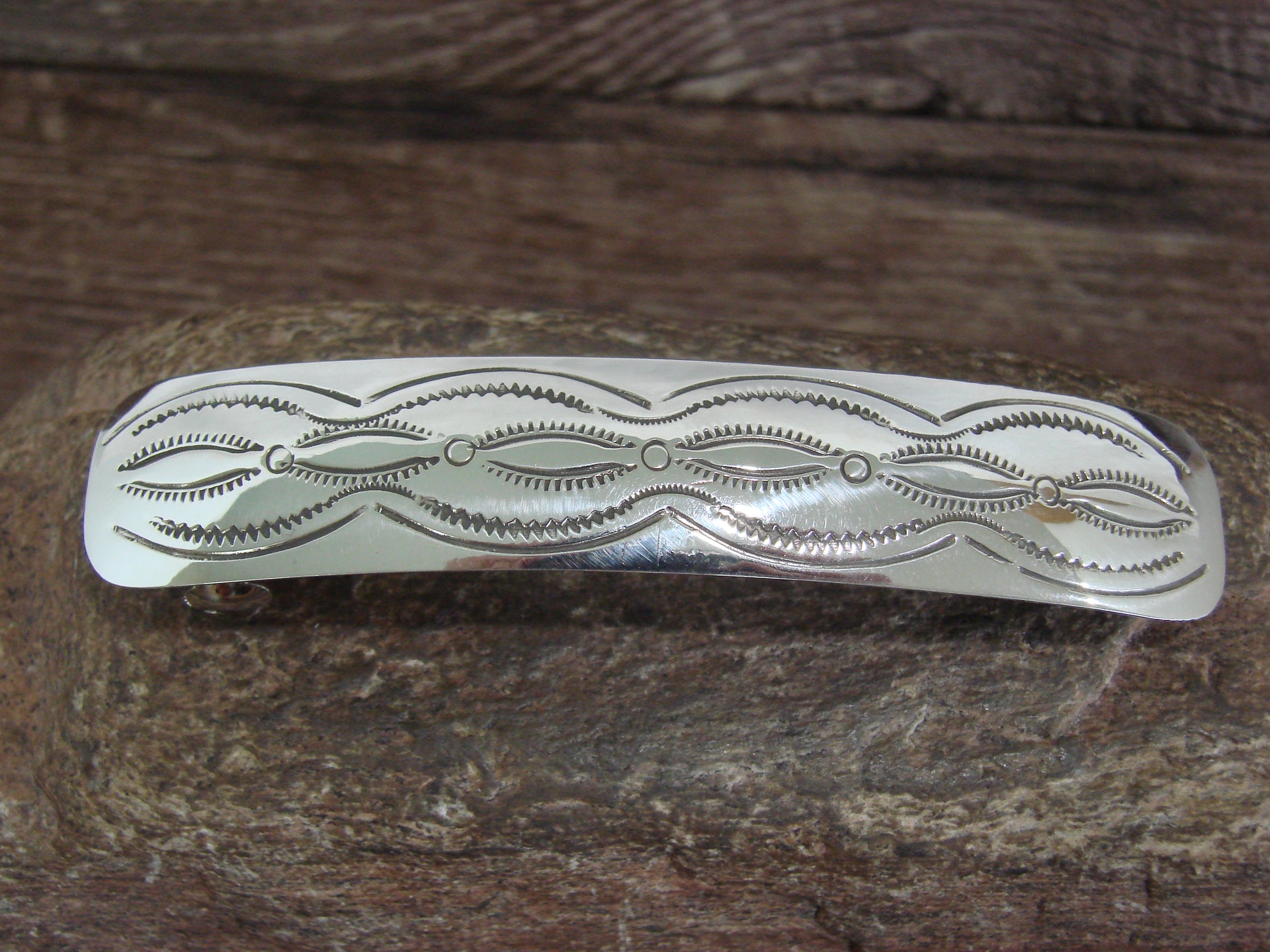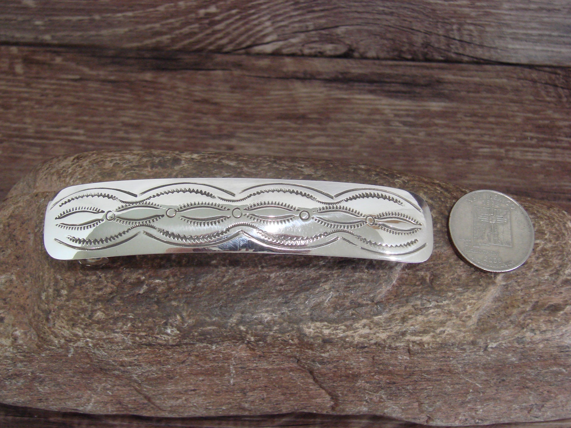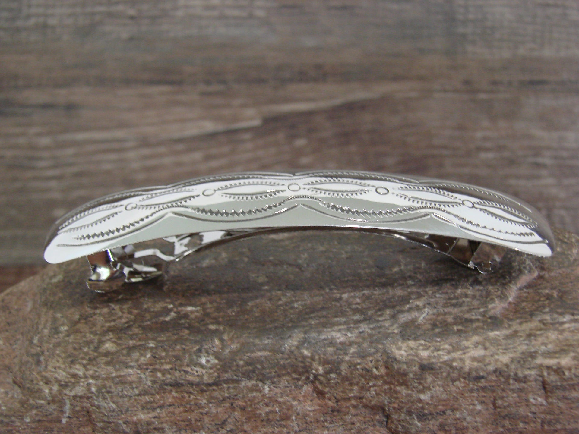 Genuine Native American Navajo Indian Sterling Silver Hand Stamped Hair Barrette from Western New Mexico. This Stunning barrette features beautiful details and hand stamping throughout the Sterling Silver. The spring hair clasp is 2 1/2" wide. This Gorgeous barrette is Handmade to Perfection! Handmade by Navajo Silversmith Jolene Begay. Signed & Stamped Sterling on the back. Free shipping and gift box included!