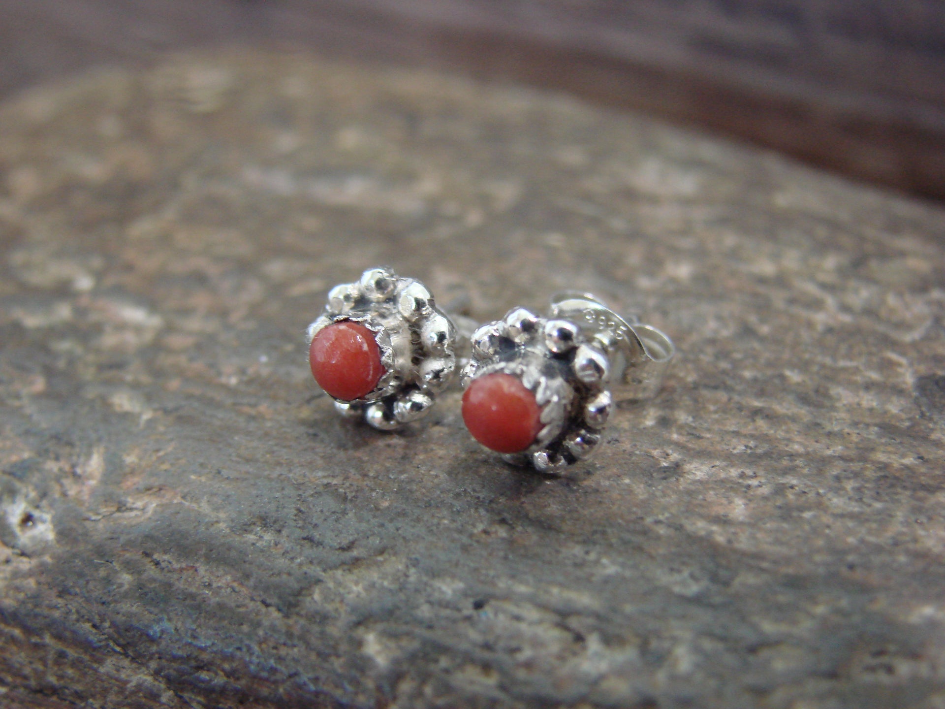 Native American Navajo Indian Sterling Silver & Coral Post Earrings from Western New Mexico. These earrings feature Beautiful Coral stones set into crown sterling silver bezels within shadowbox. settings This is a great pair of stud post earrings! Navajo Indian handmade by Rena Laate. Unsigned. Free shipping in a gift box included!
