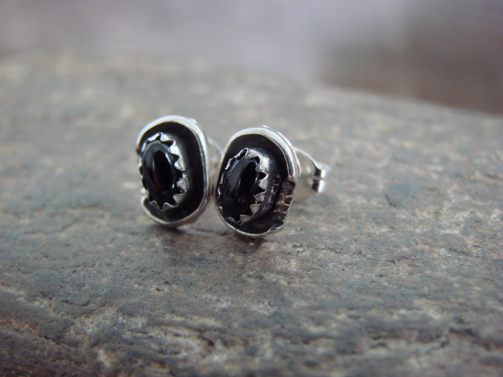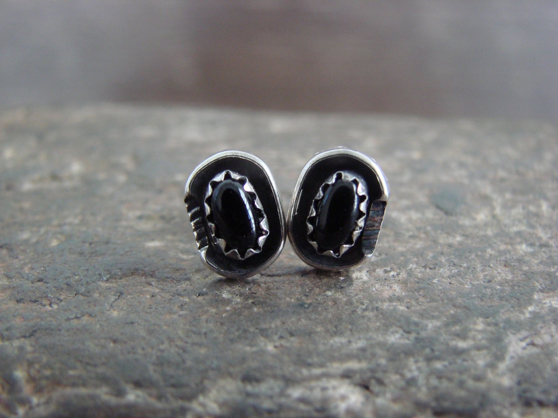 Native American Navajo Indian Sterling Silver & Onyx Post Earrings from Western New Mexico. These earrings feature Beautiful Onyx stones set into crown sterling silver bezels within shadowbox. settings This is a great pair of stud post earrings! Navajo Indian handmade by Roselene Joe. Unsigned. Free shipping in a gift box included!