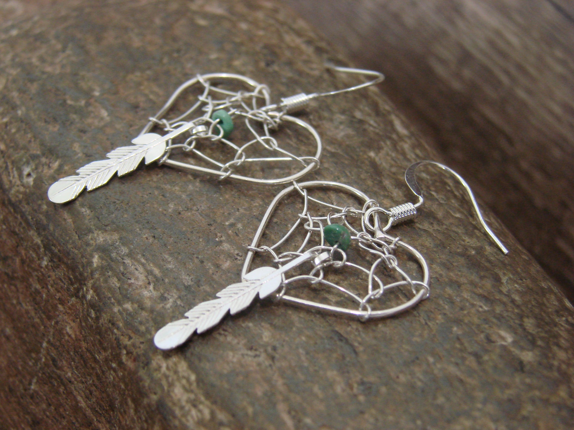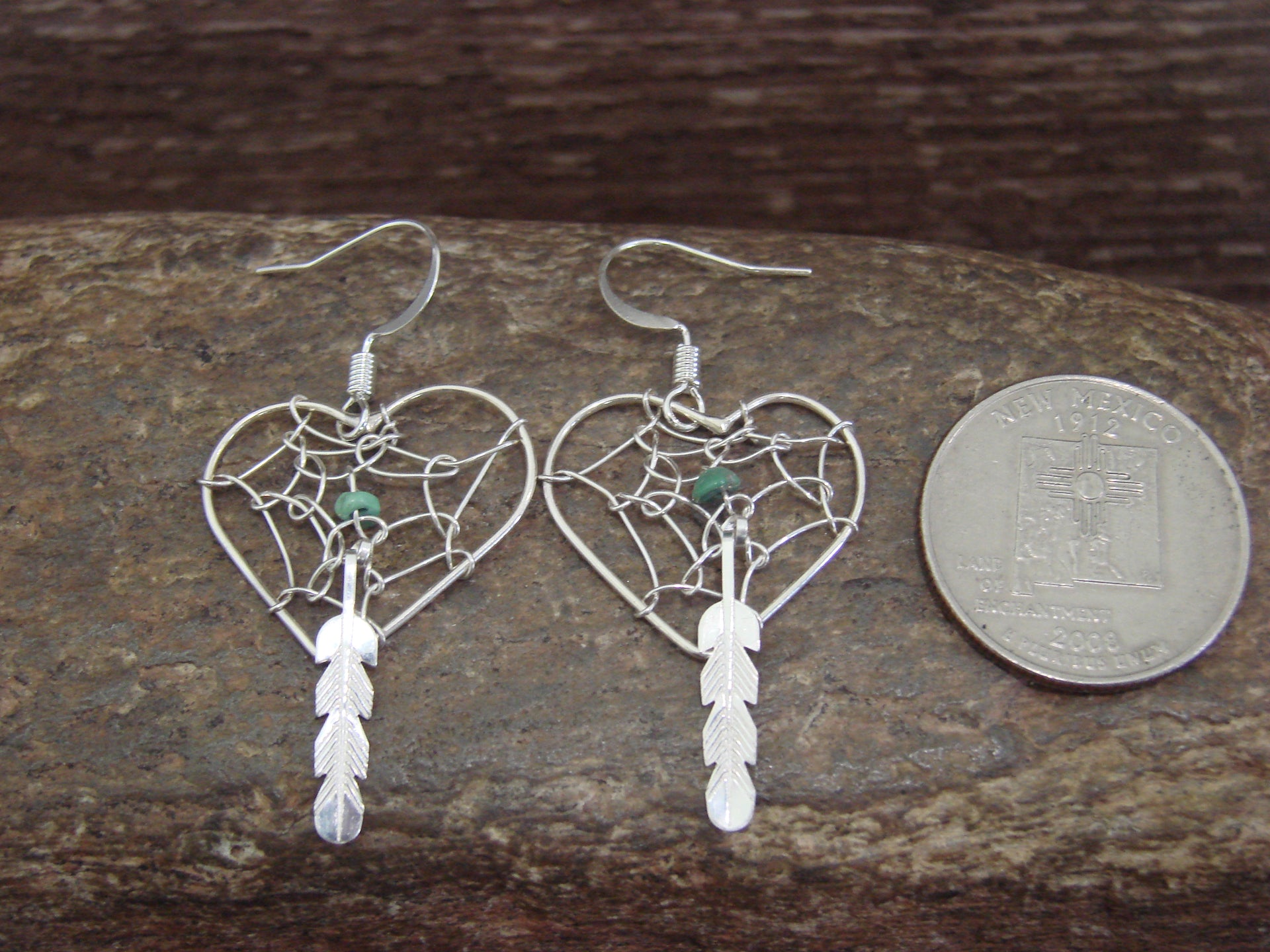 Genuine Native American Navajo Indian Sterling Silver Heart Dream Catcher Dangle Earrings from Western New Mexico. These Stunning earrings feature beautiful Sterling Silver details throughout. The Sterling Silver is nicely polished. This is a great pair of earrings! Free gift box included! Navajo Indian handmade by Helena Yazzie. These are Unsigned. Free shipping and gift box included!