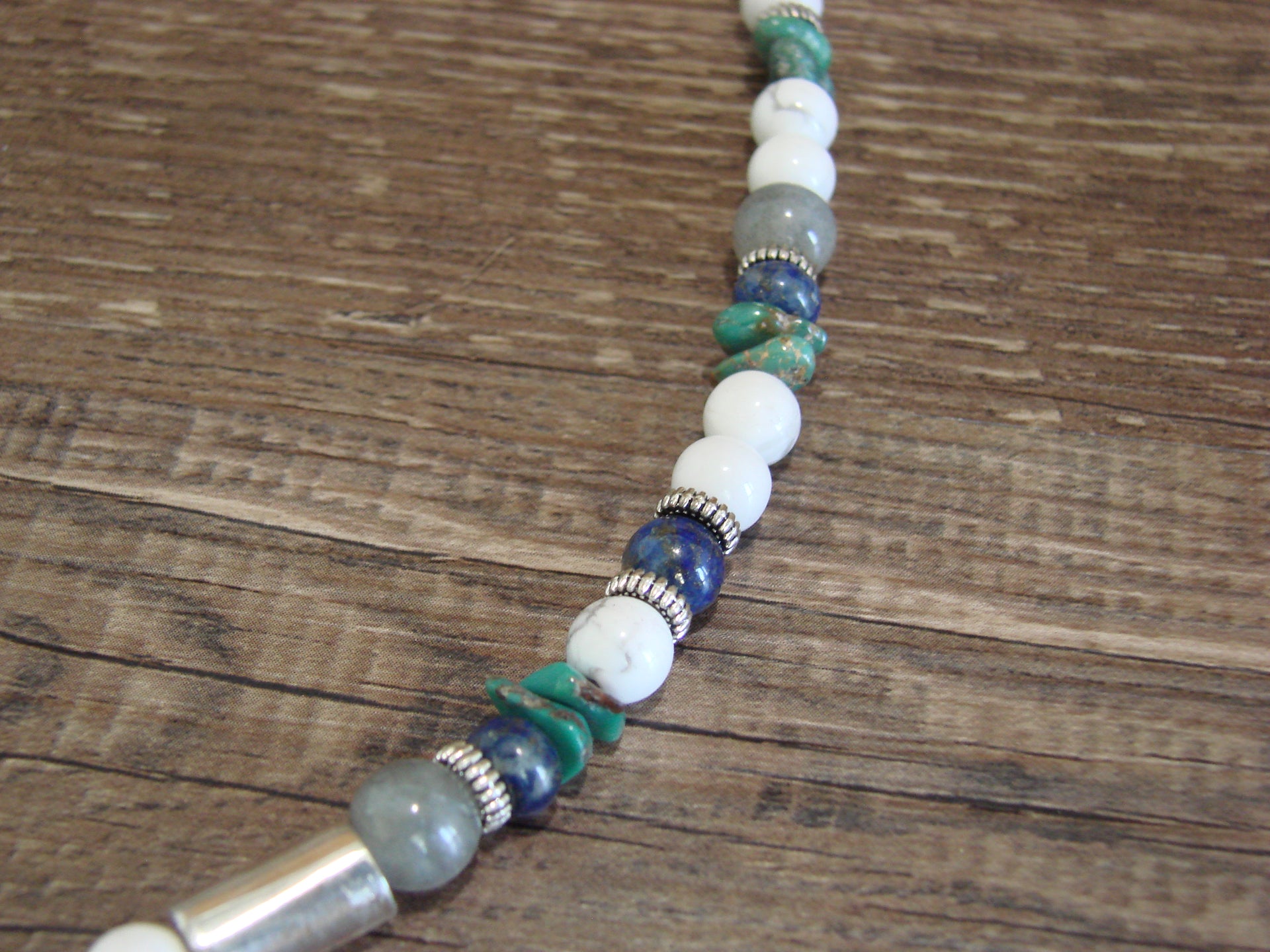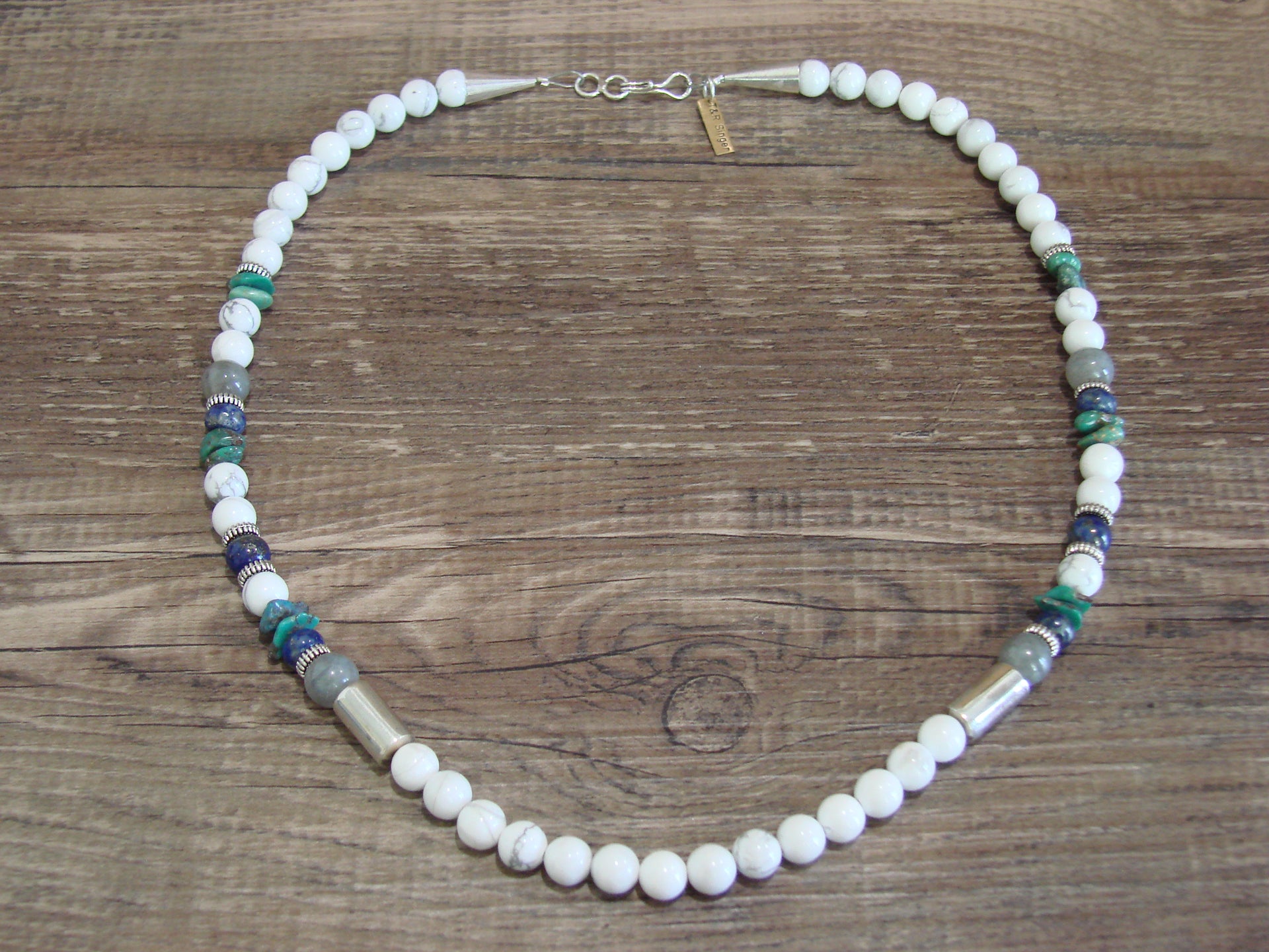 Native American Navajo Indian Howlite Gemstone Beaded Necklace from Western New Mexico. This stunning necklace features beautiful Howlite Beads accented with sterling silver and Multiple Gemstones. Finished with a sterling silver hook and eye closure this is a great necklace. These are high quality stones. This gorgeous piece is a handmade masterpiece! Hand strung by Rosita Singer, wife of the late Tommy Singer. This necklace is signed "T&R Singer". Free shipping in a gift box included!