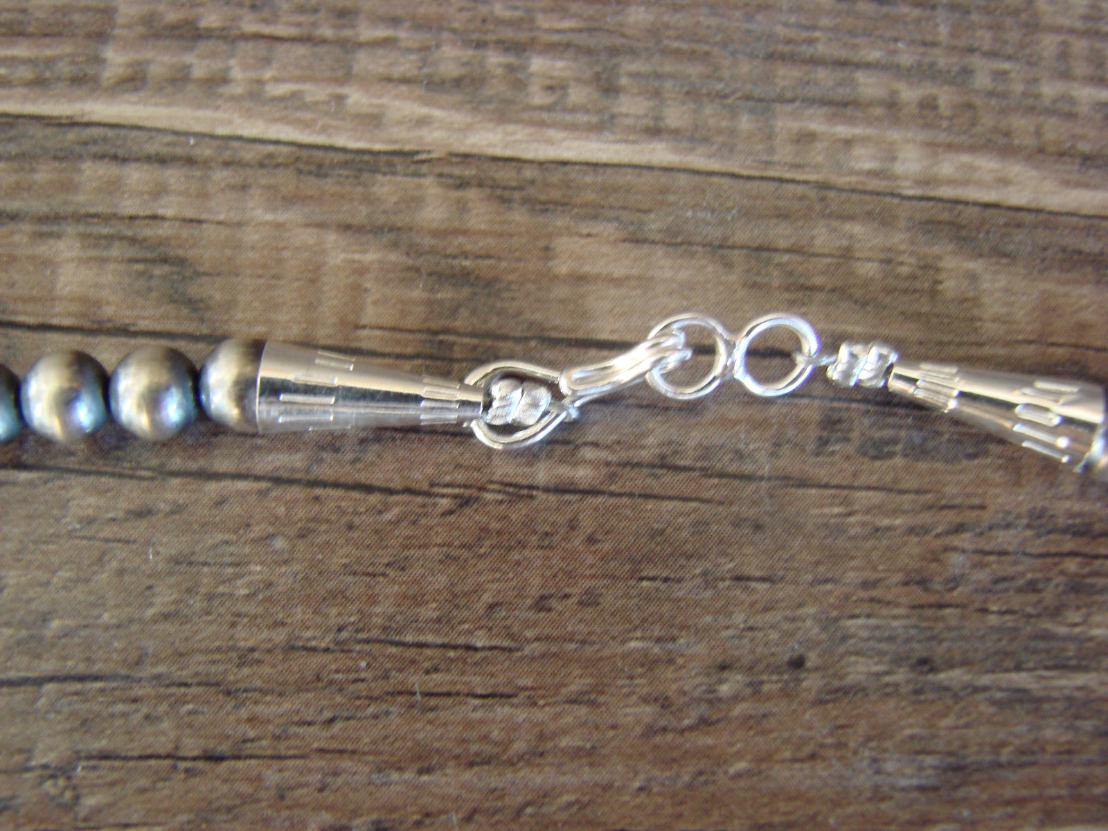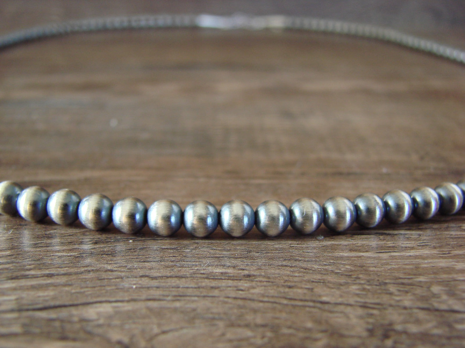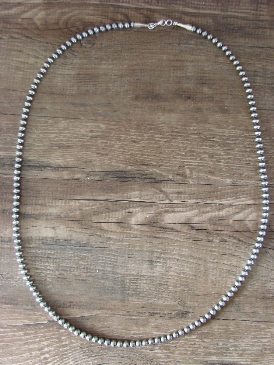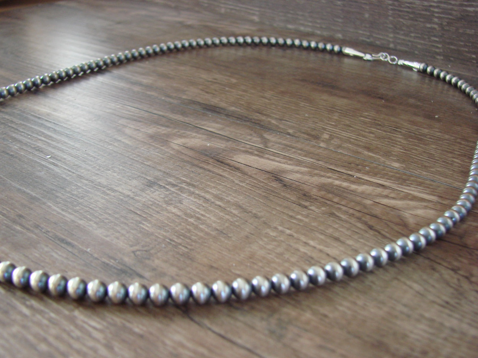 Native American Indian Single Strand Sterling Silver Navajo Pearl Necklace from Western New Mexico. This necklace features a single 28" strand of hand strung 5mm Round Sterling Silver Navajo Pearls. The necklace is finished with a sterling silver cone and a hook and eye closure. These Sterling Silver Navajo Pearls are gorgeous, and this necklace is stunning! Hand strung by Navajo artist Doreen Jake. Free shipping and gift box included!