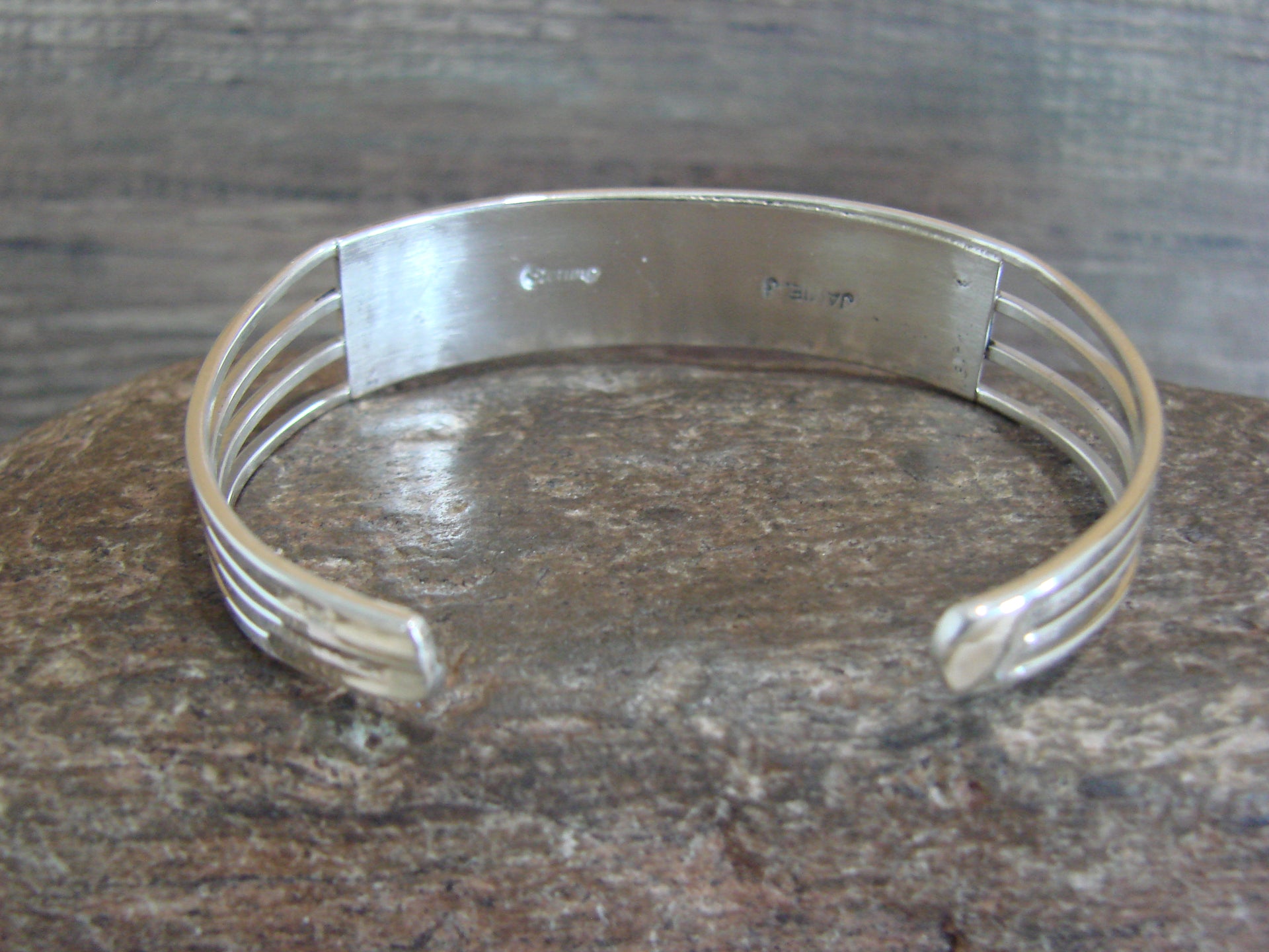 Genuine Native American Zuni Indian Sterling Silver & Pink Opal Inlay 3 Row Bracelet from Western New Mexico. This Bracelet feature 3 rows of Lab Pink Opal stones beautifully inlayed into smooth sterling silver and polished. This inlay work is Stunning! Zuni Indian hand made by Jamie Johnson. Signed "Jamie J" and stamped "Sterling" on the back. Free gift box and shipping included!