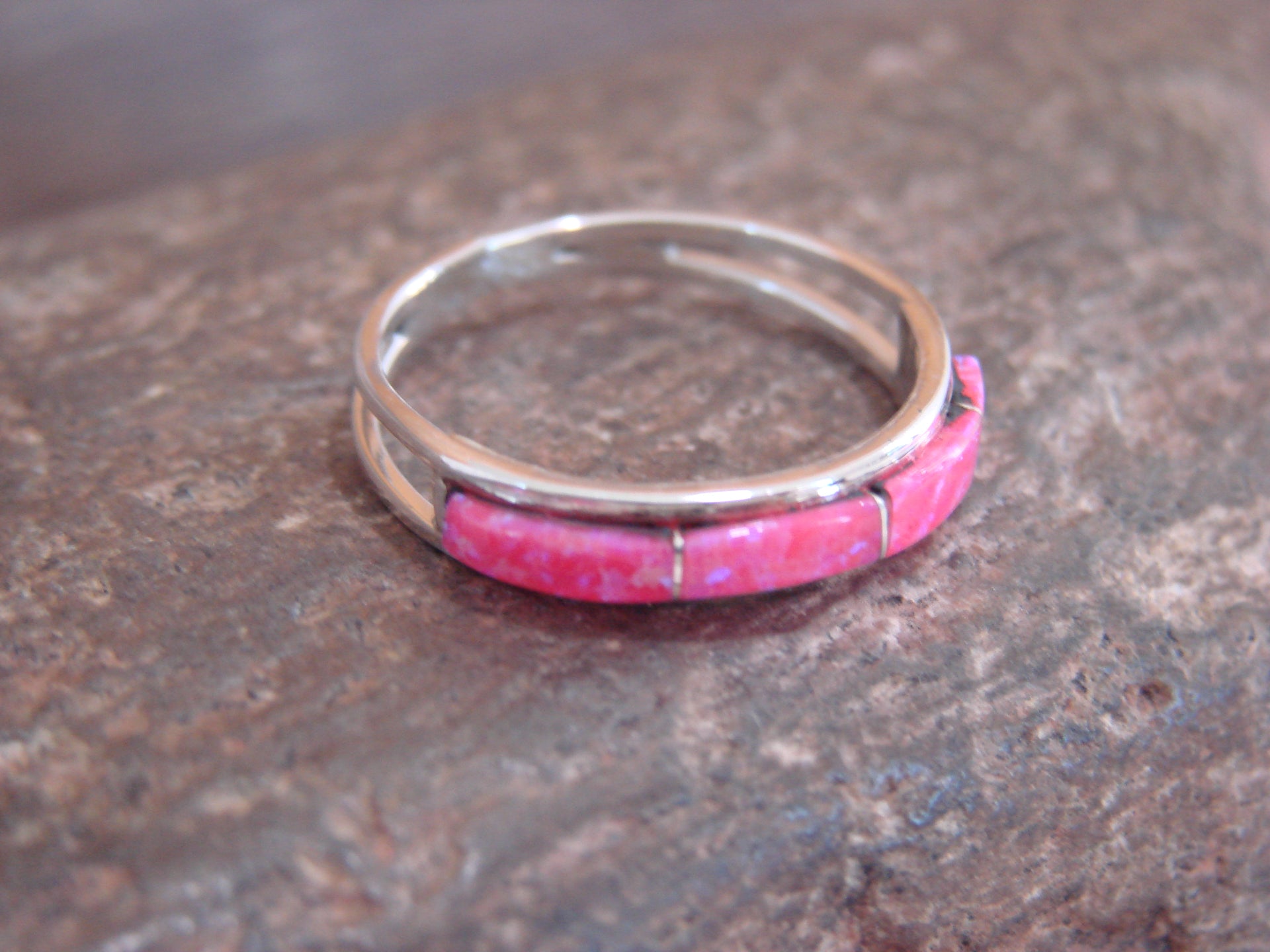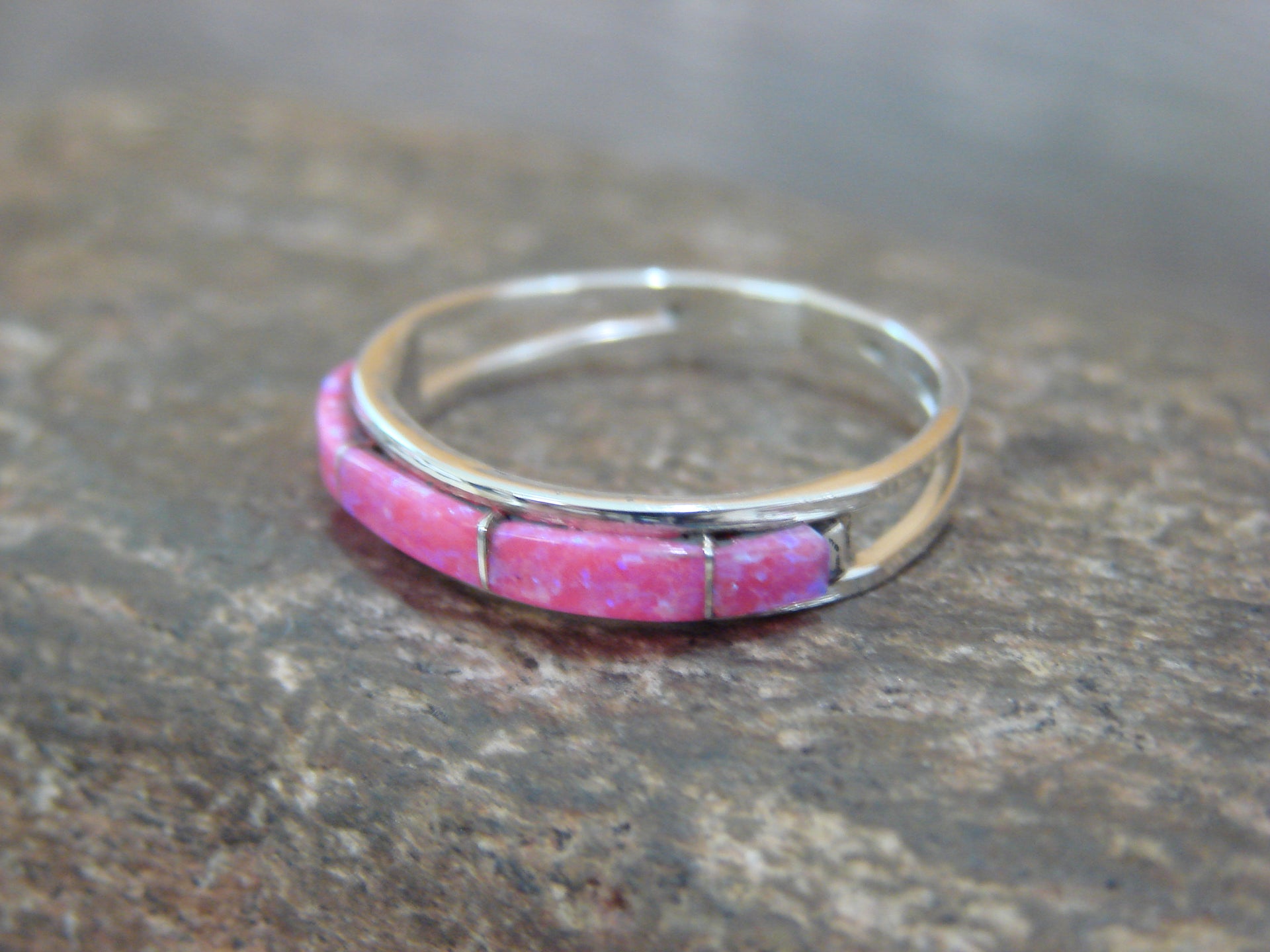 Native American Zuni Indian Sterling Silver & Pink Opal Inlay Ring from Western New Mexico. This ring features beautiful Pink Lab Opal stones Inlayed into smooth Sterling Silver. Polished to a bright shine, this is a very nice ring! Handmade by Zuni Silversmith Jamie Johnson. Signed "Jamir J." and stamped "Sterling" on the inner band. Free Shipping and gift box included!