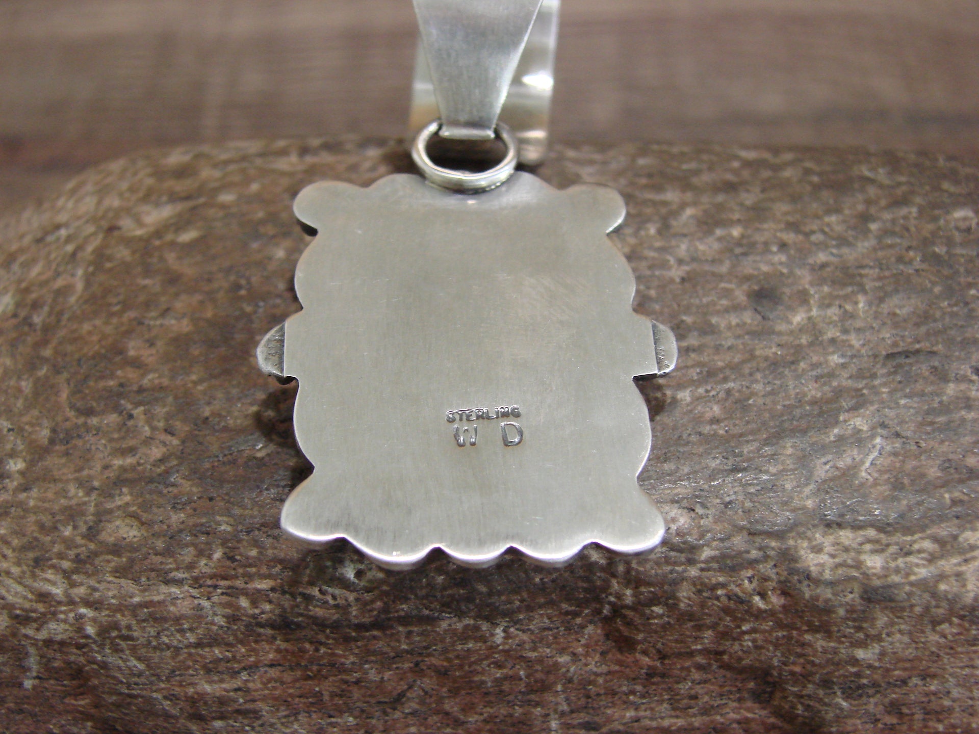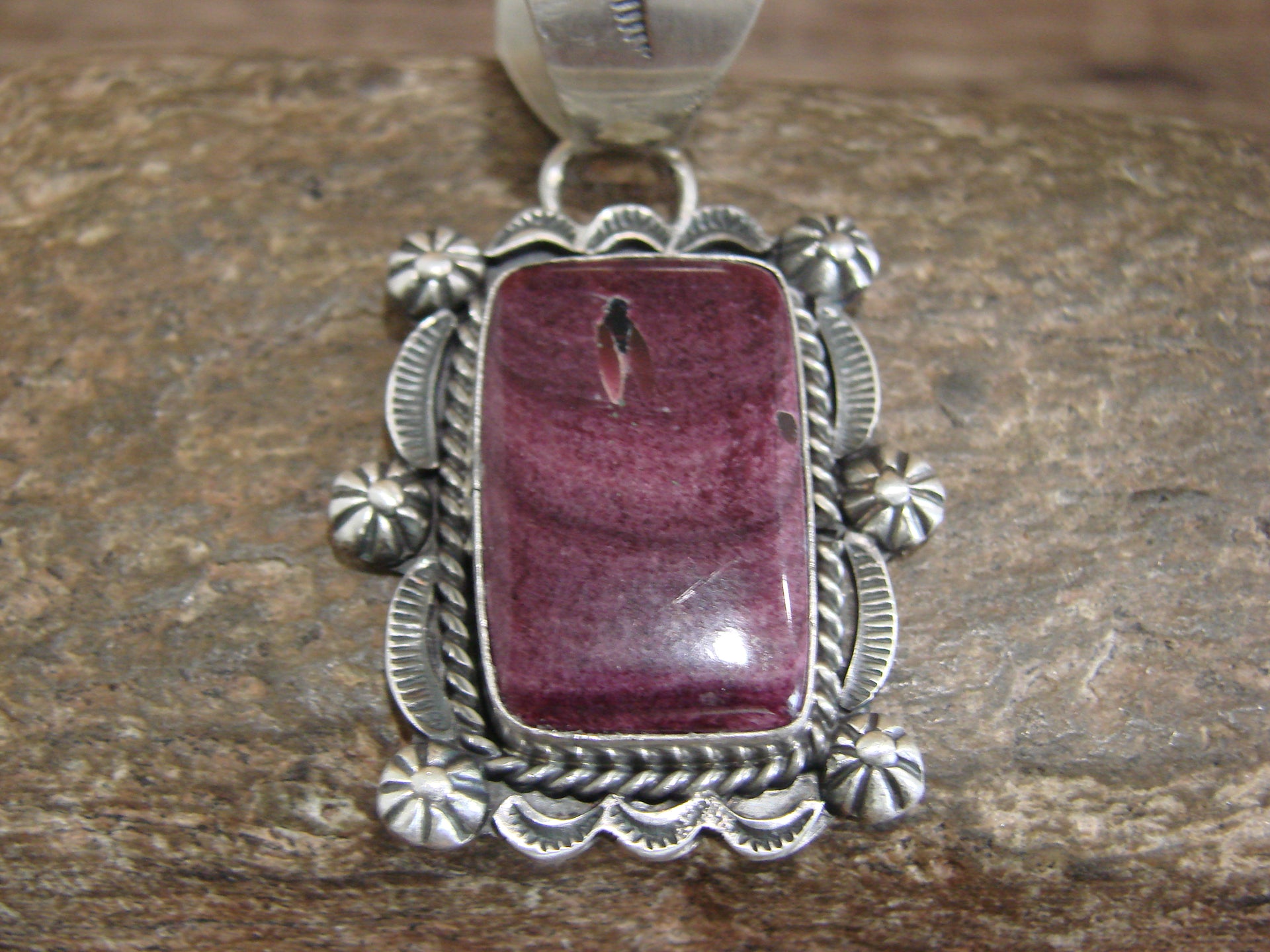Genuine Native American Navajo Indian Sterling Silver & Purple Spiny Oyster Pendant from Western New Mexico. This Stunning pendant features a Genuine Purple Spiny Oyster stone intricately set into a smooth Sterling Silver bezel setting. Beautiful Sterling Silver details and Hand Stamping surround the stone. Handmade by Navajo Artist Wilson Dawes. Signed "WD" and Stamped "Sterling" on back. Free gift box and shipping included!