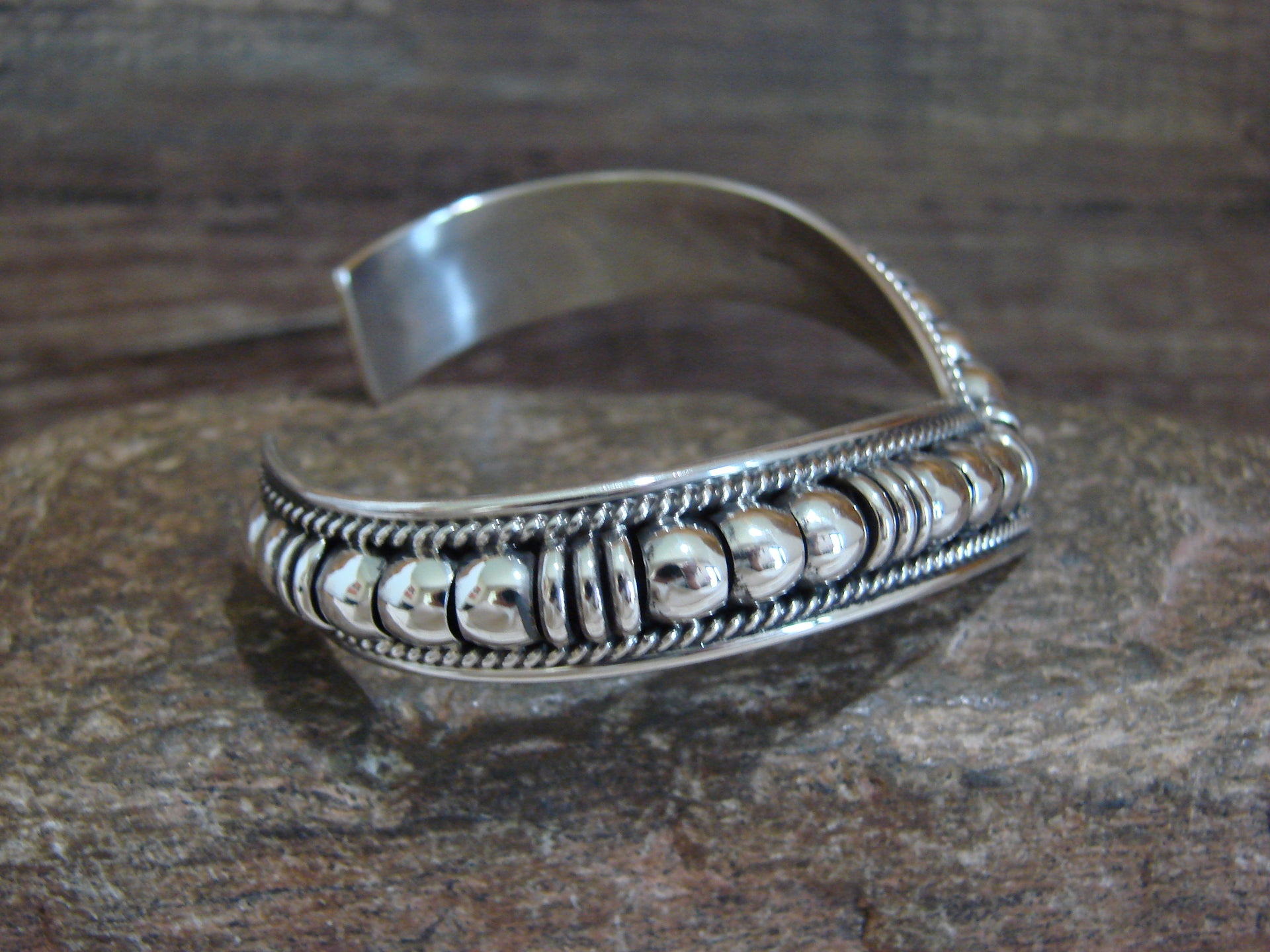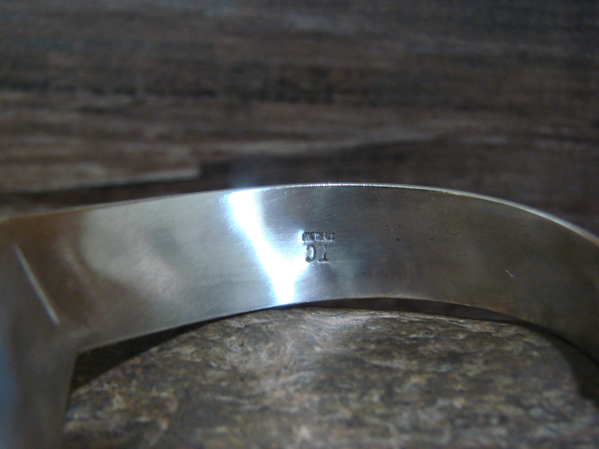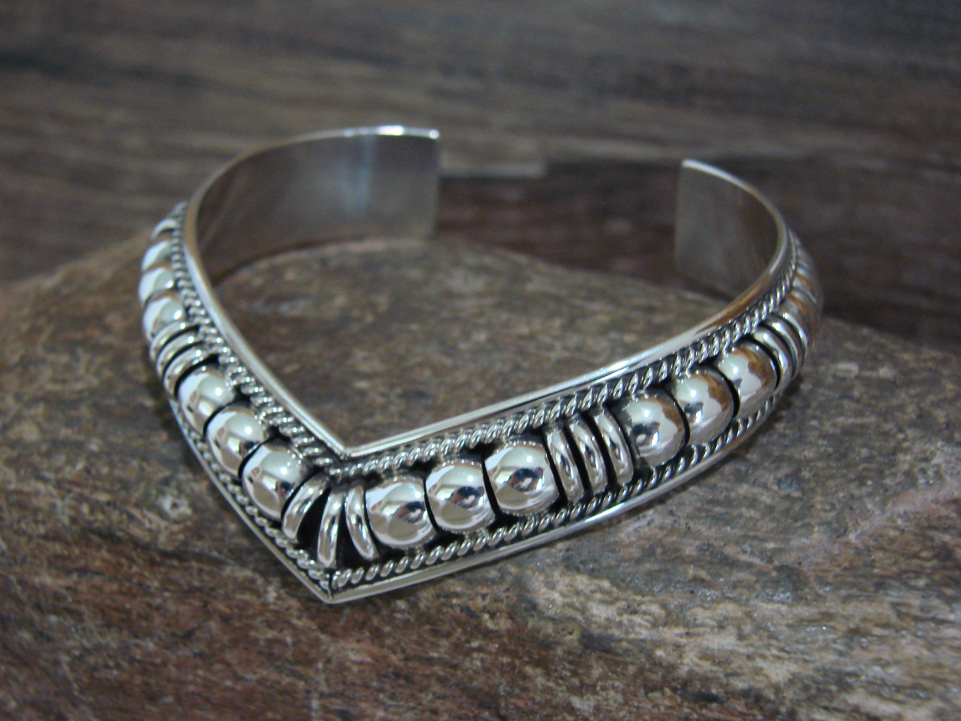 Genuine Native American Navajo Indian Sterling Silver Ribbed Melon V Bracelet from Western New Mexico. This Genuine bracelet features beautiful .925 Sterling Silver throughout. The ribbed Melon design is accented by a twisted rope sterling silver border. The ribbed Melon pattern is Thomas Charley's hallmark design. Handmade by Navajo artist Thomas Charley. Signed "TC" and stamped "Sterling" on the back. Free Shipping with a gift box included!
