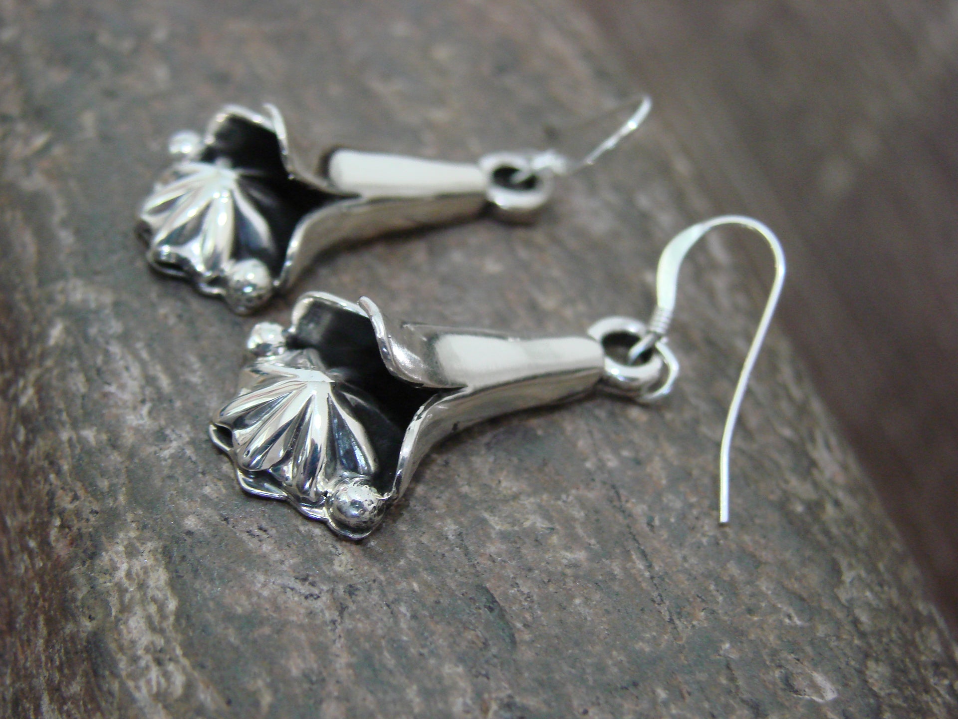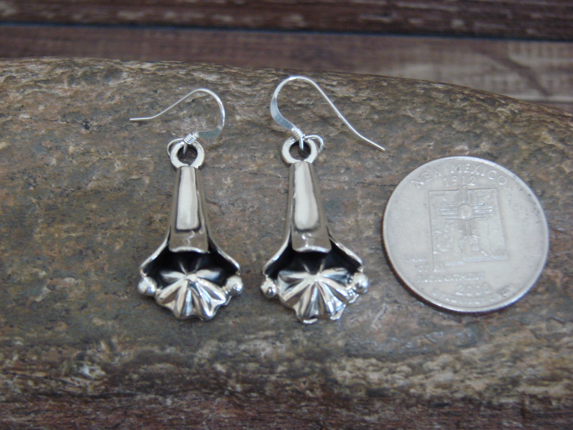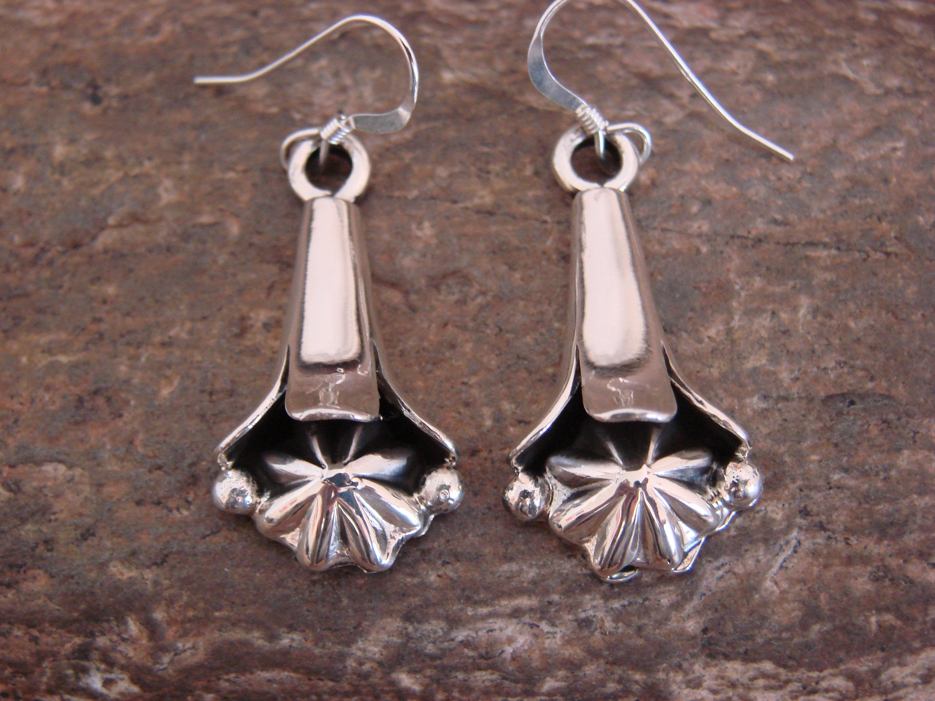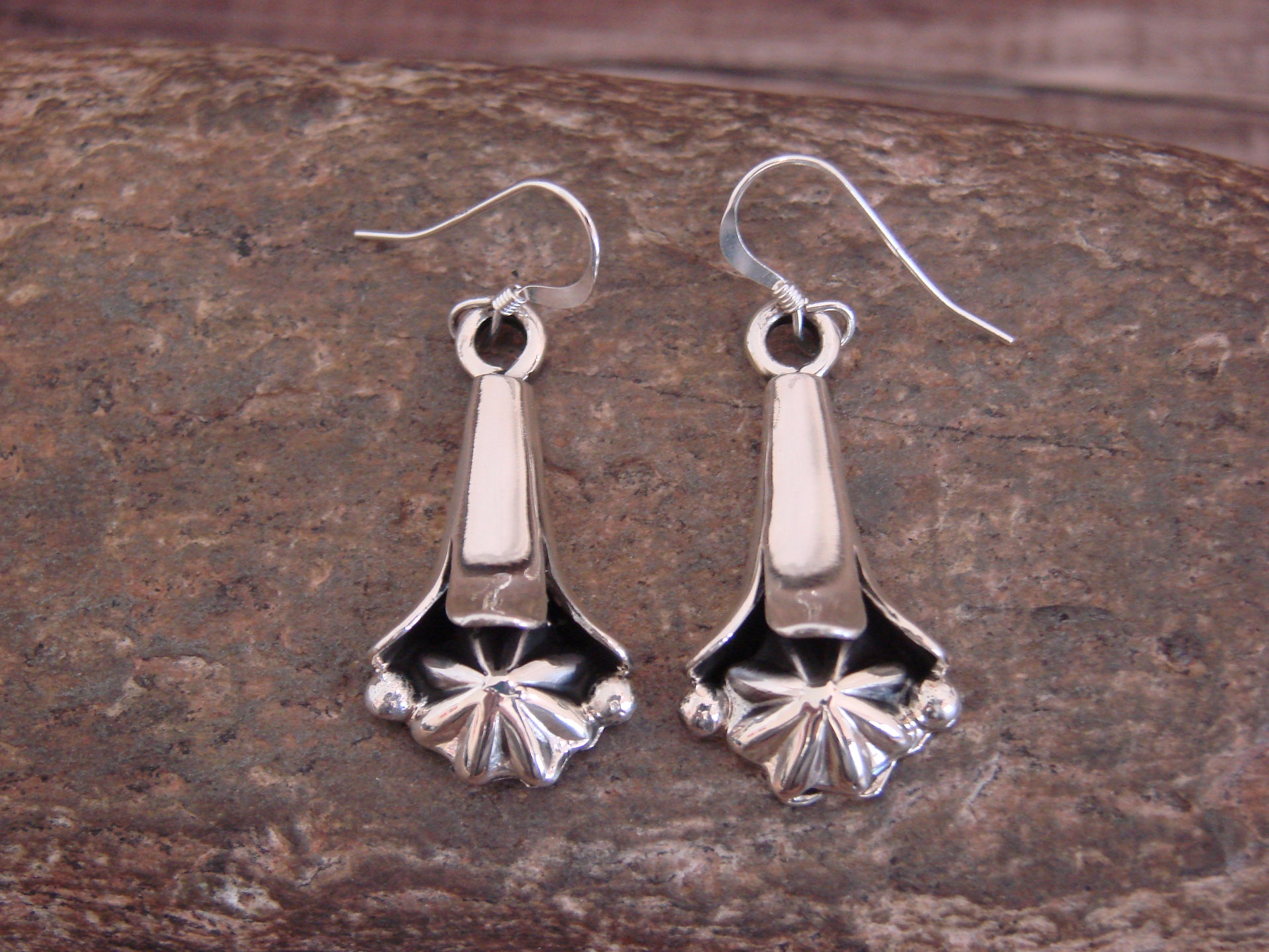 Genuine Native American Navajo Indian Sterling Silver Squash Blossom Dangle Earrings from Western New Mexico. These Stunning earrings feature Smooth Sterling Silver details throughout a Stunning Squash Blossom. This is a beautiful pair of earrings! Navajo Indian hand made by Amanda Larry. Unsigned. Free gift box and shipping included!