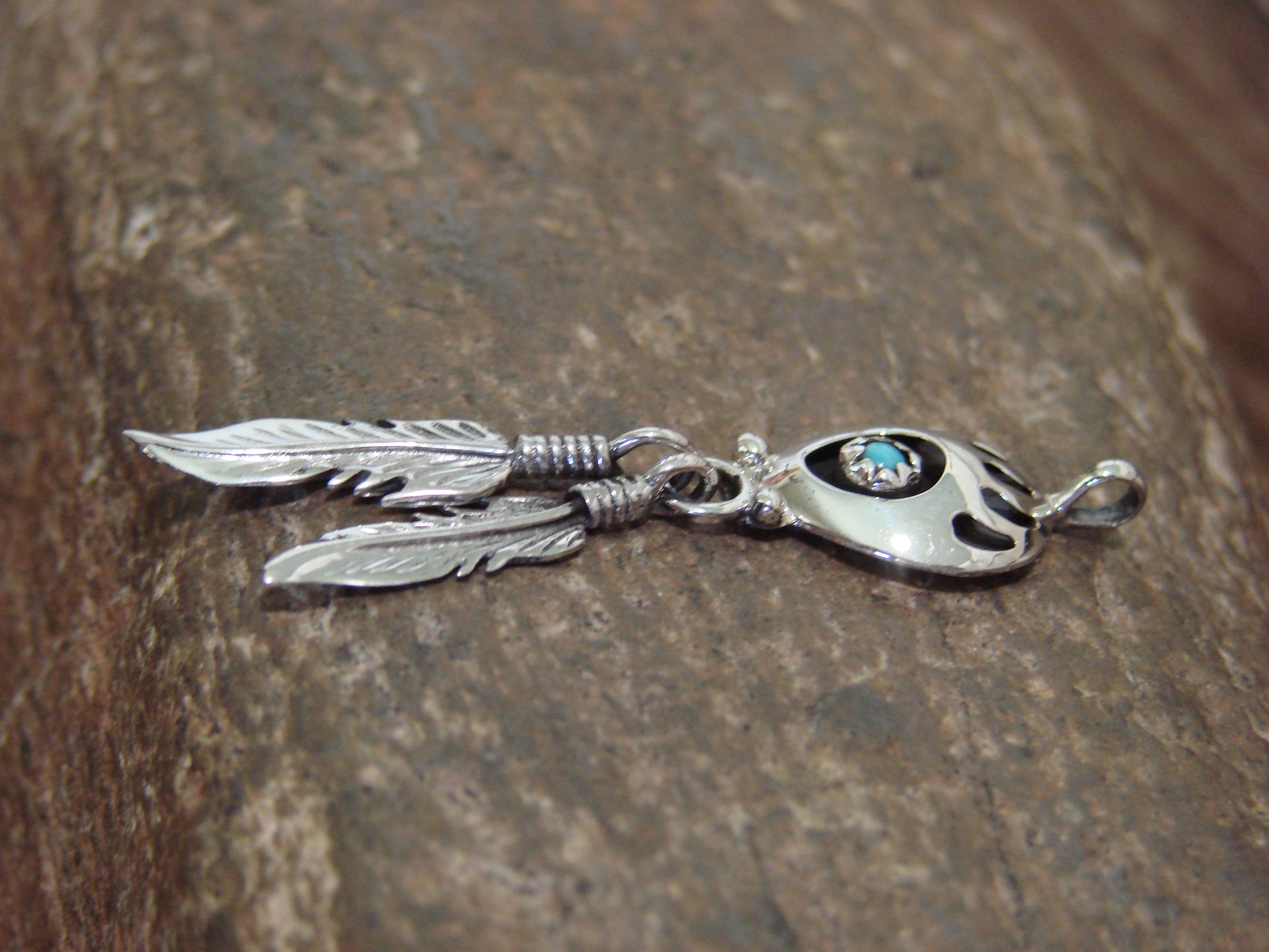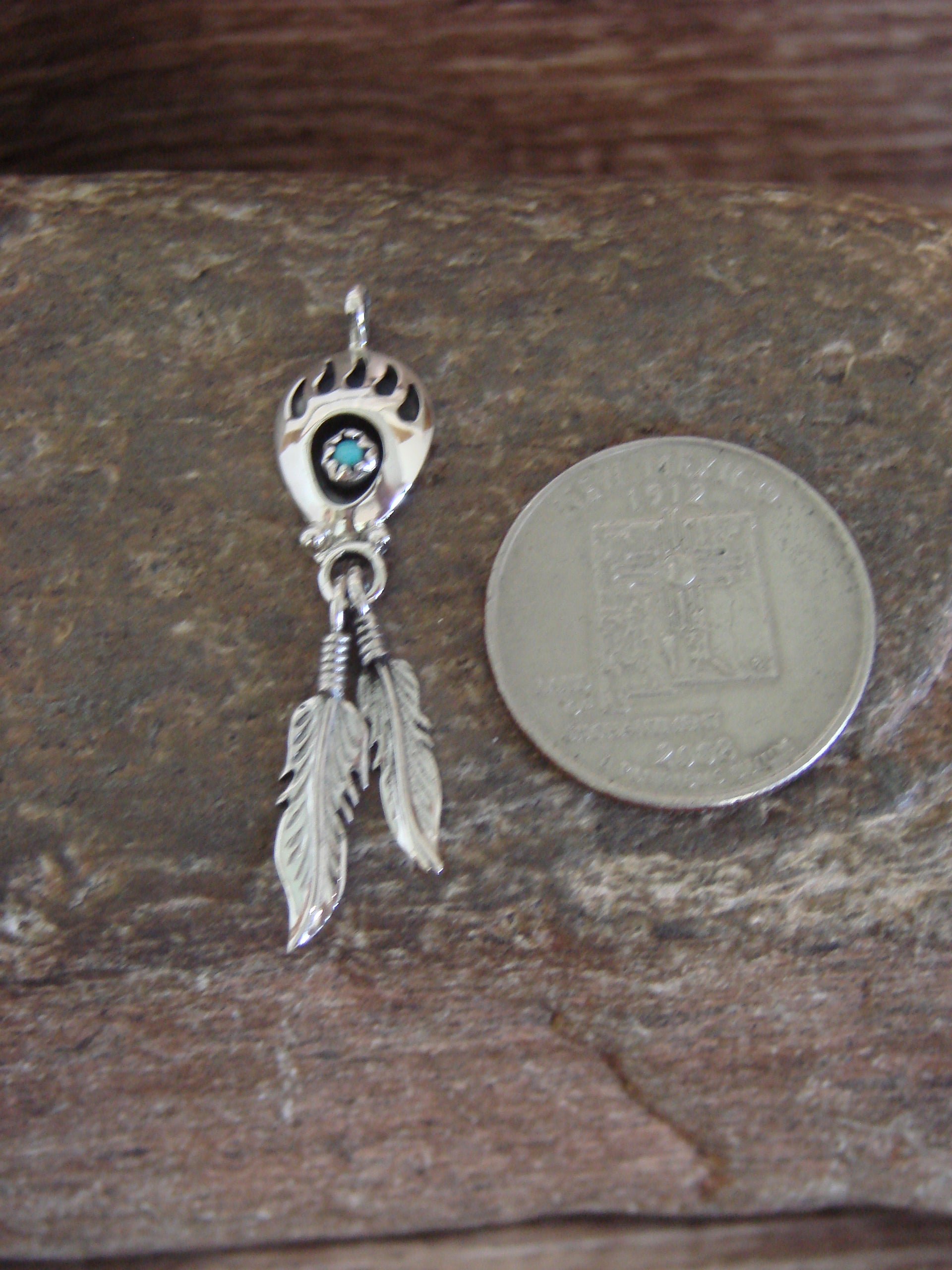 Genuine Native American Navajo Indian Sterling Silver Turquoise Bear Paw Feather Pendant from Western New Mexico. This tiny Charm Pendant features a Turquoise stone set into a crown sterling silver bezel. The Bear Paw is cut out around the stone giving it a very nice shadow box look. Hand Stamped Sterling Silver Feathers dangle below. Handmade by Annie Spencer. Hallmarked on the back. Free Shipping with a Gift Box included!