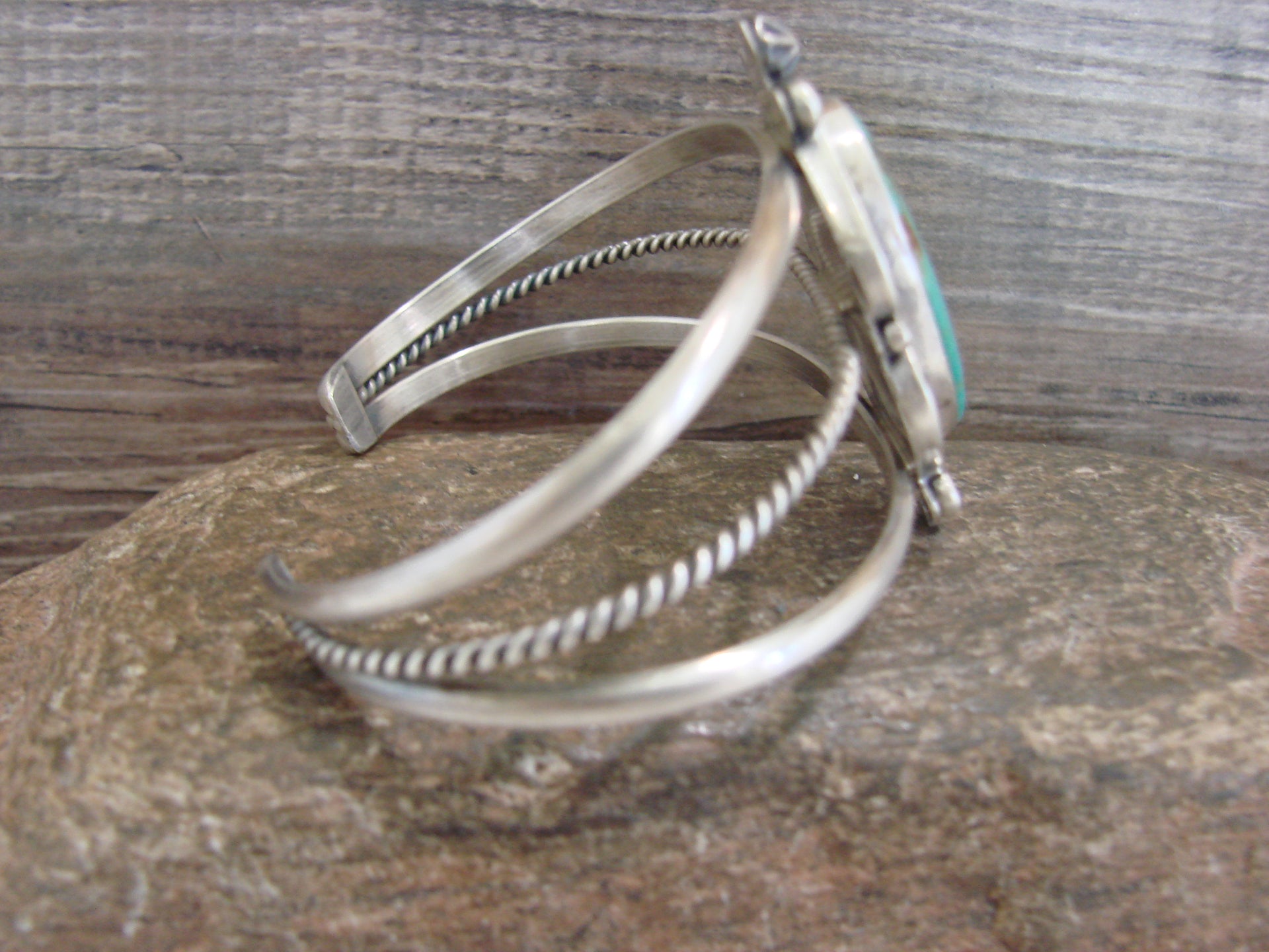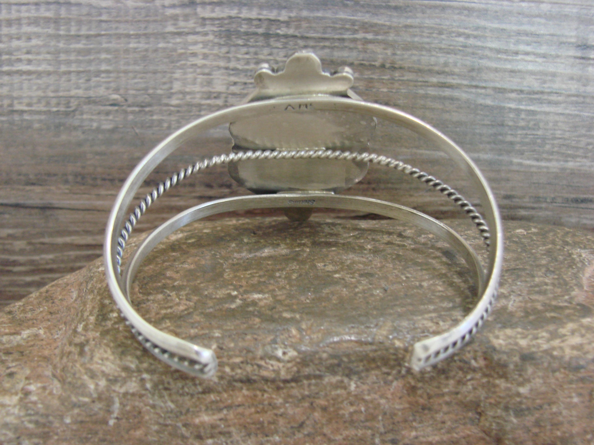 Genuine Native American Navajo Indian Sterling Silver & Turquoise Bracelet from Western New Mexico. This Stunning bracelet features a High Quality, Genuine Turquoise Stone set into a smooth sterling silver bezel setting. Hand Stamping and Beautiful details in Sterling Silver surround the Stone. Fine Navajo Silversmith workmanship quality makes this bracelet a beautiful hand made masterpiece! Navajo Indian handmade by Annie McCray. Signed and Stamped "Sterling" on the back. Free gift box and free shipping included!