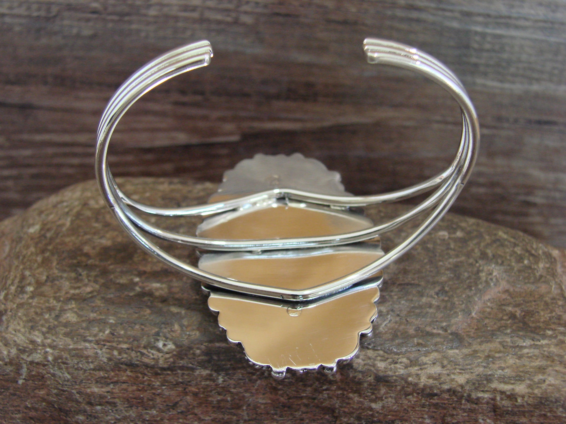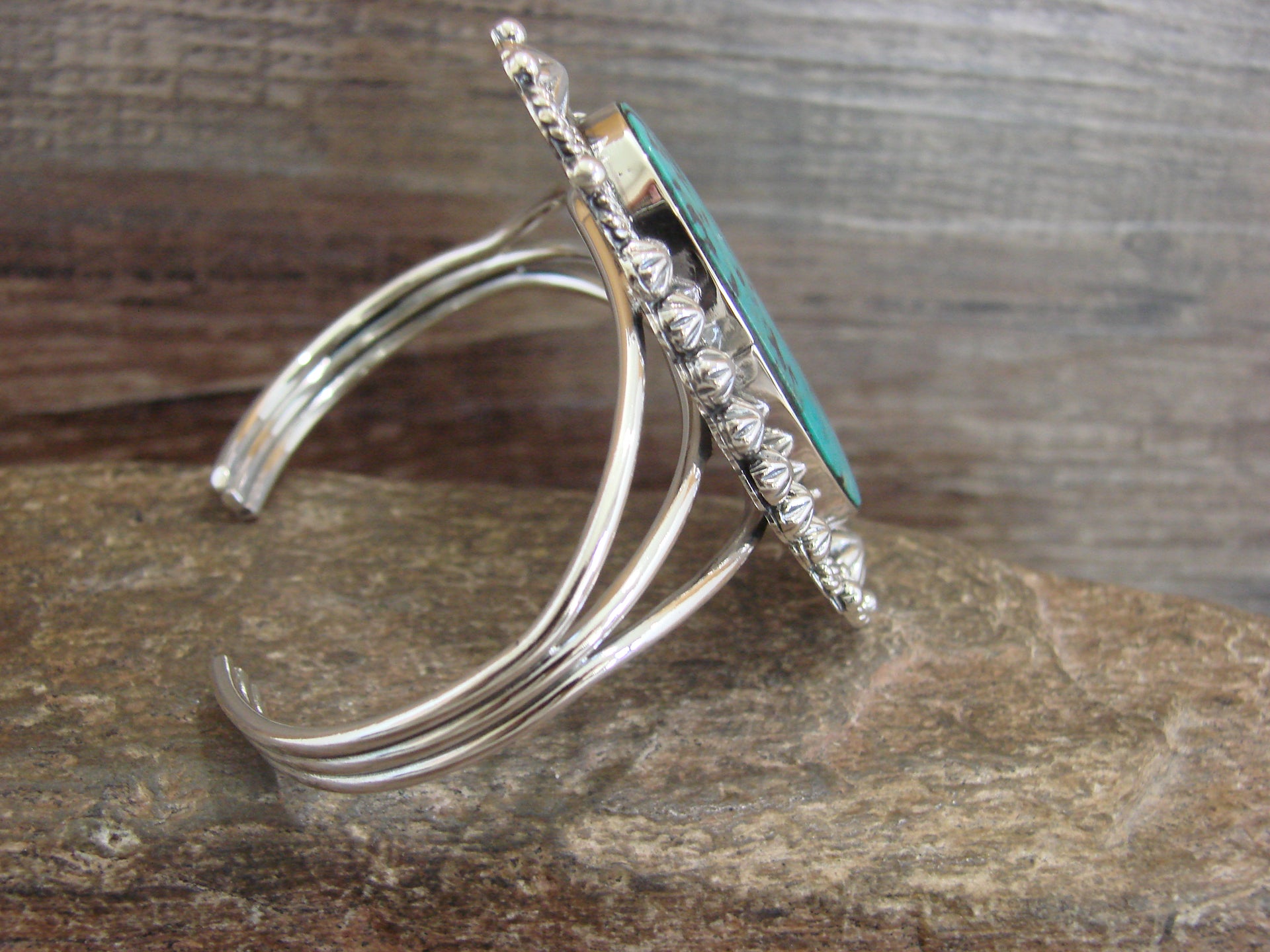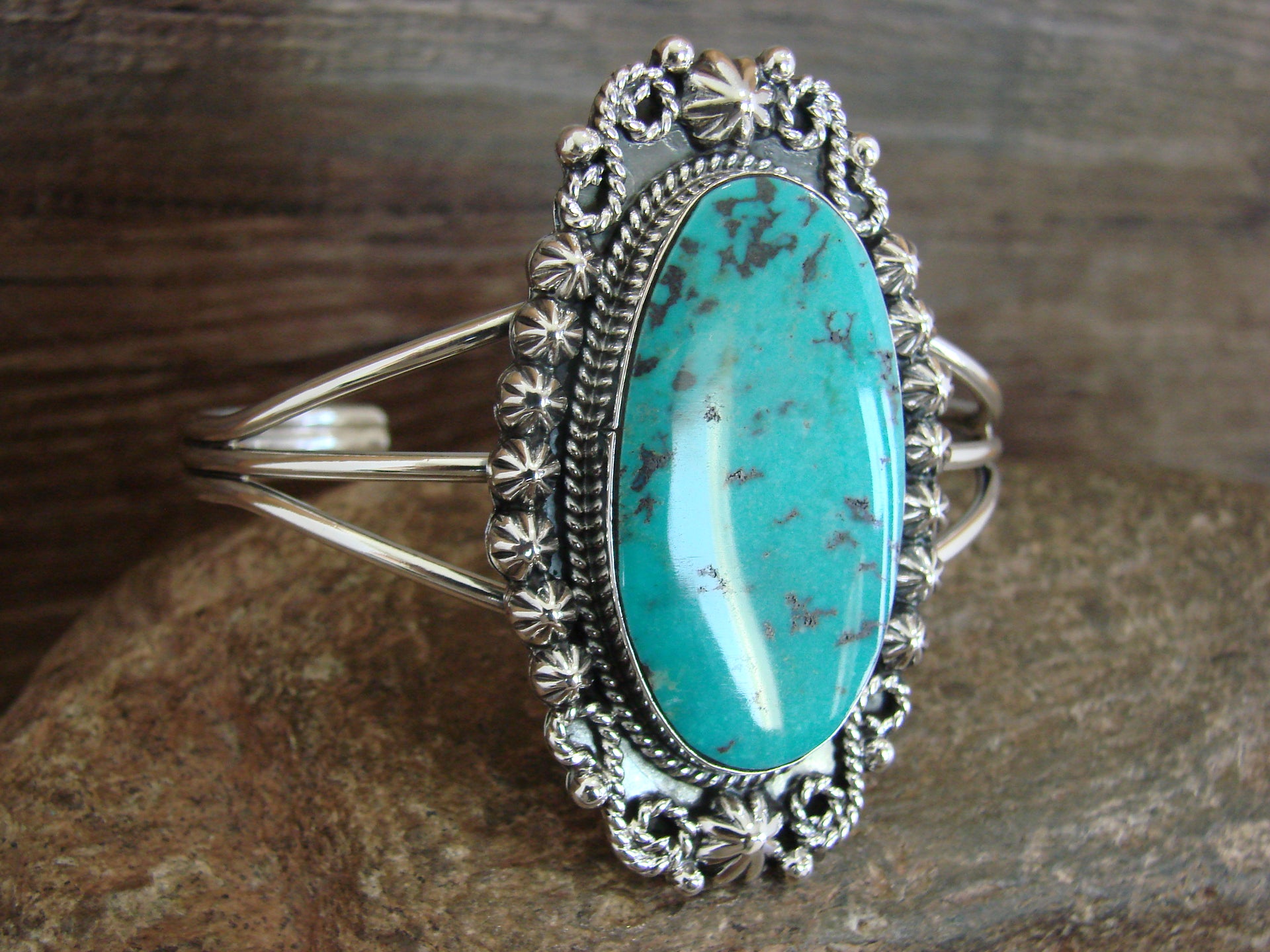 Genuine Native American Navajo Indian Sterling Silver & Turquoise Bracelet from Western New Mexico. This Stunning bracelet features a High Quality, Genuine Turquoise Stone set into a smooth sterling silver bezel setting. Hand Stamping and Beautiful details in Sterling Silver surround the Stone. Fine Navajo Silversmith workmanship quality makes this bracelet a beautiful hand made masterpiece! Navajo Indian handmade by Jennifer Cayaditto. Hallmarked on the back. Free gift box and free shipping included!