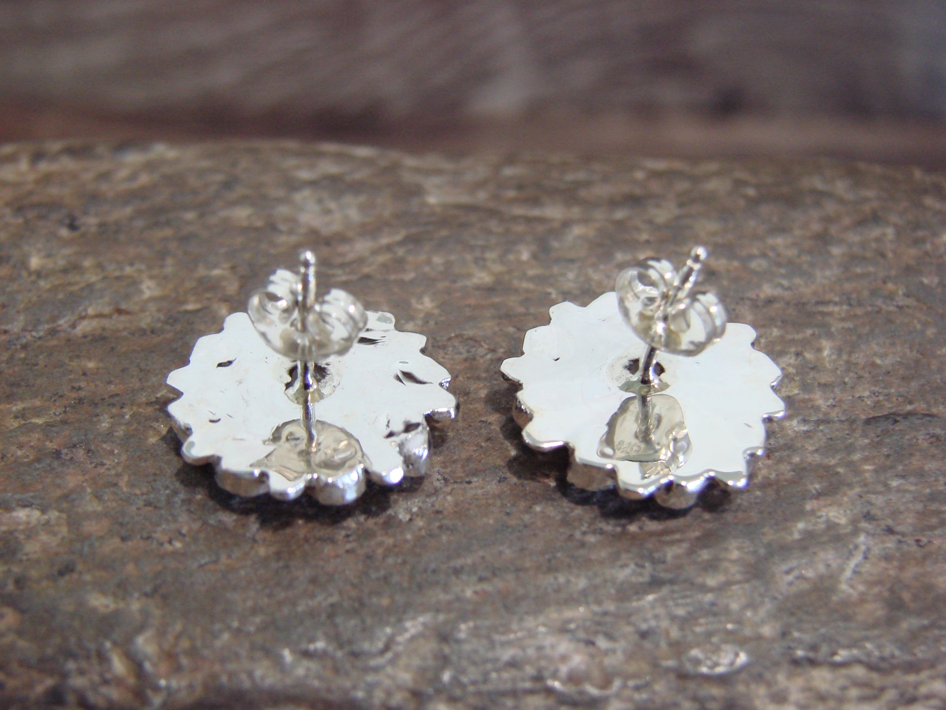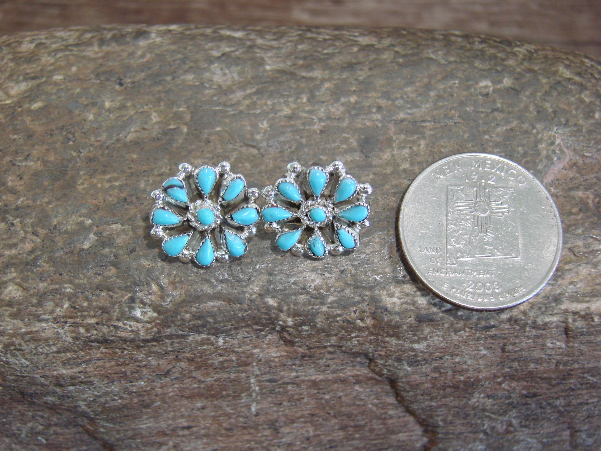 Genuine Native American Zuni Indian Sterling Silver Turquoise Cluster Post Earrings from Western New Mexico. These Gorgeous earrings feature Genuine Turquoise stones beautifully set into crown sterling silver bezel Settings. Stunning sterling silver details surround the stones. Handmade by Zuni artist Herbert Lastiyano. Free Shipping with gift box included!