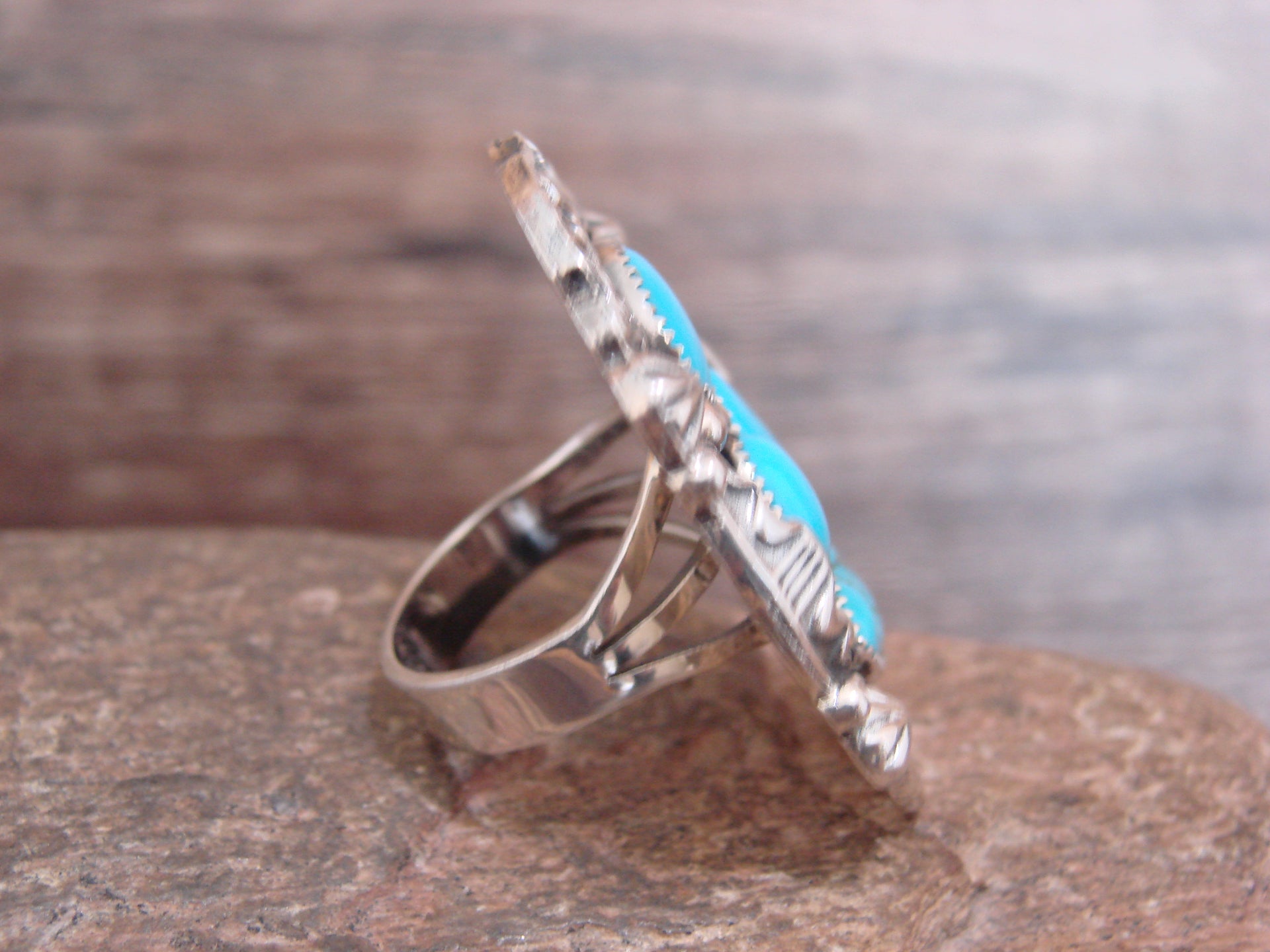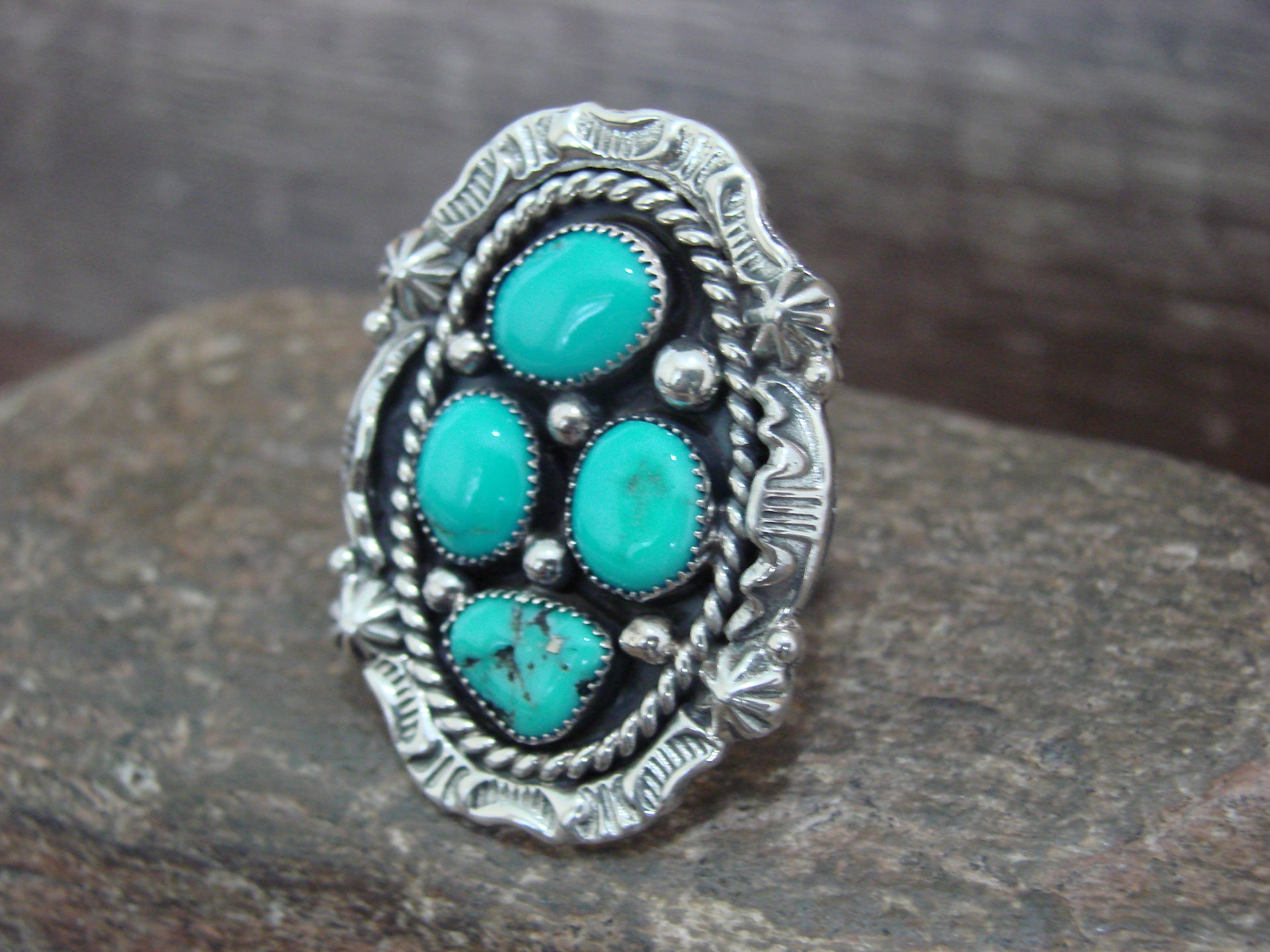 Native American Navajo Indian Sterling Silver & Turquoise Cluster Ring from Western New Mexico. This ring features Genuine Turquoise stones set into crown Sterling Silver bezel settings. Surrounding the stones are beautiful details in Sterling Silver. The stones are polished and have a Stunning look! Handmade by Navajo Silversmith Harold Becenti. Hallmarked on the back. Free gift box and shipping included!