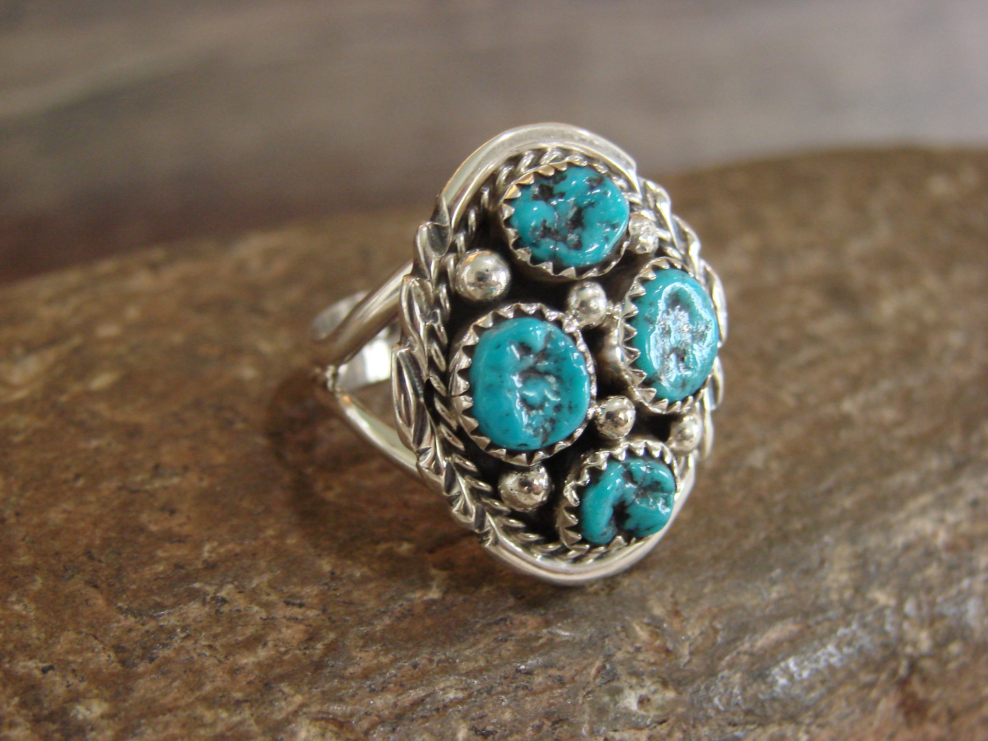 Genuine Native American Navajo Indian Sterling Silver & Turquoise Cluster Ring from Western New Mexico. This ring features Genuine Turquoise stones set into a sterling silver cluster setting. The stones are polished and have a stunning look! Handmade by Navajo Silversmith M. Chee. Hallmarked on the back and Stamped "Sterling". Free gift box and shipping included!