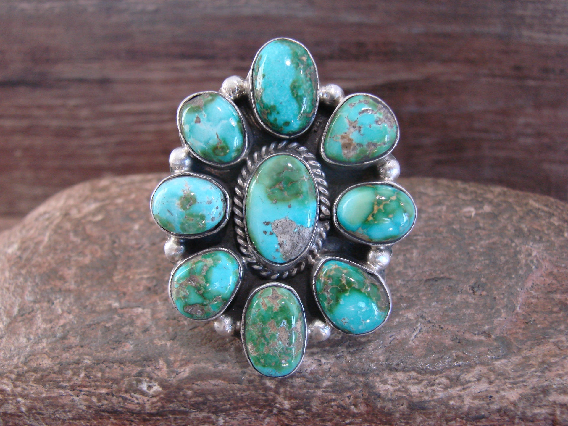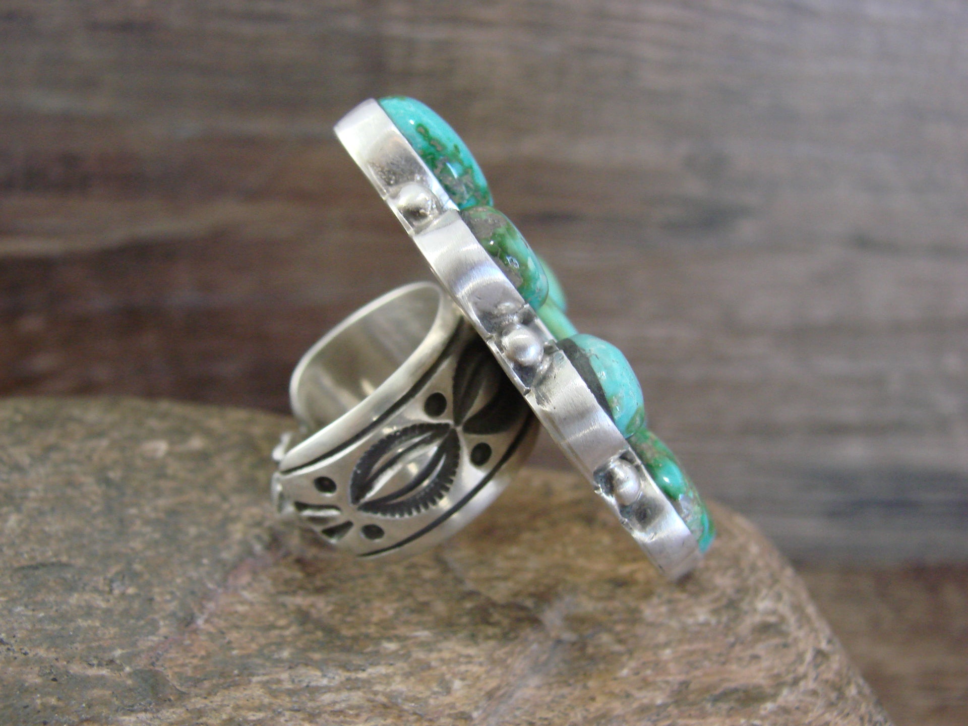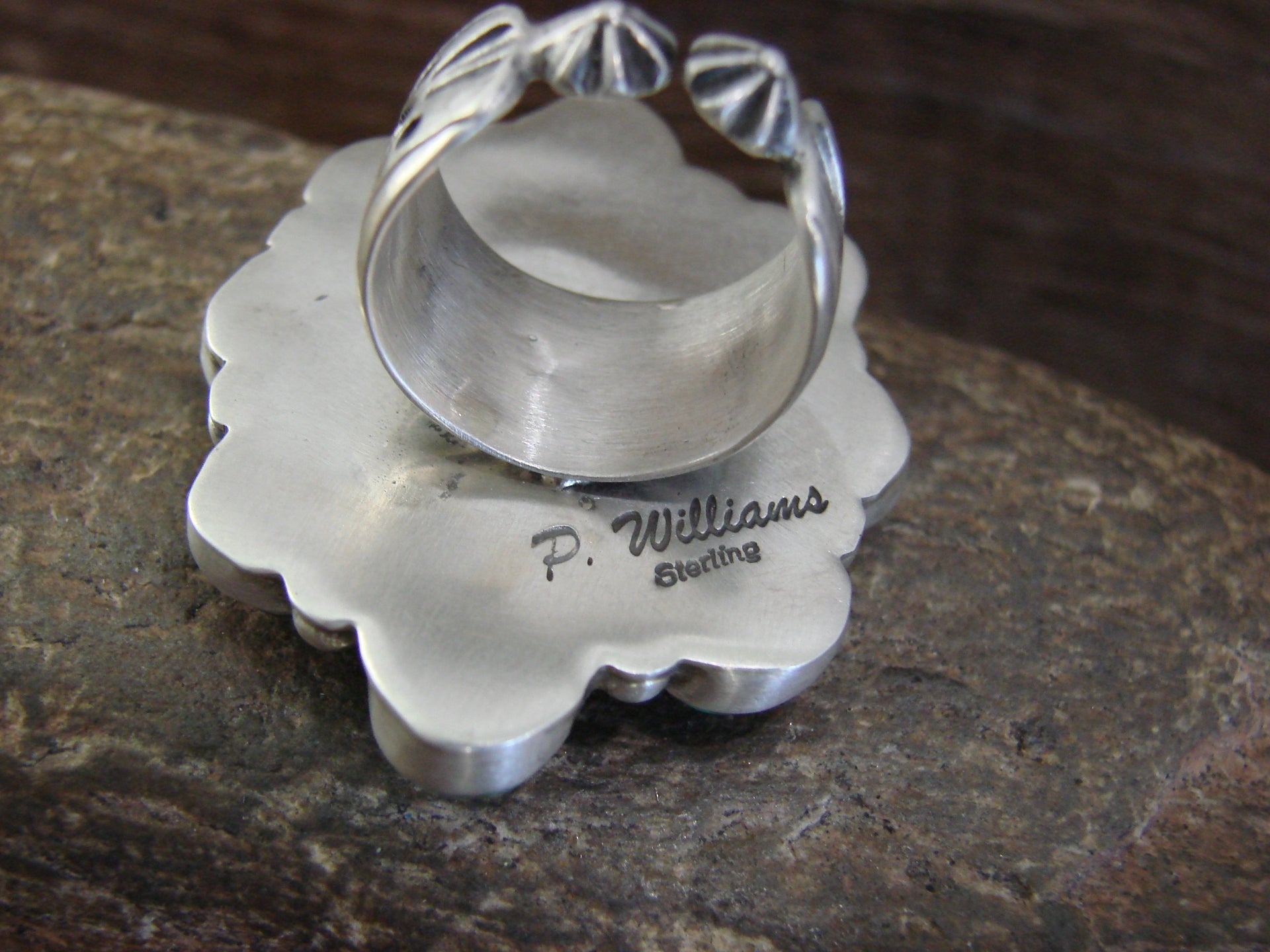Genuine Native American Navajo Indian Sterling Silver & Sonoran Turquoise Cluster Ring from Western New Mexico. This Gorgeous ring features Genuine Turquoise stones set into smooth Sterling Silver bezel settings. Beautiful details in Sterling Silver Surround the Stones. The stones are polished and have a Stunning look! Handmade by Navajo Silversmith P. Williams. Signed "P. Williams" and Stamped "Sterling" on the back. Free gift box and shipping included!