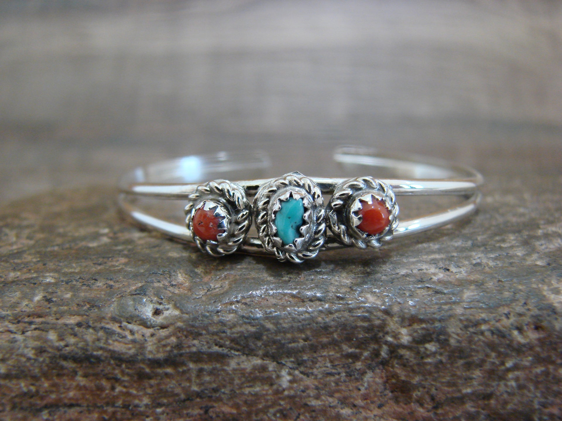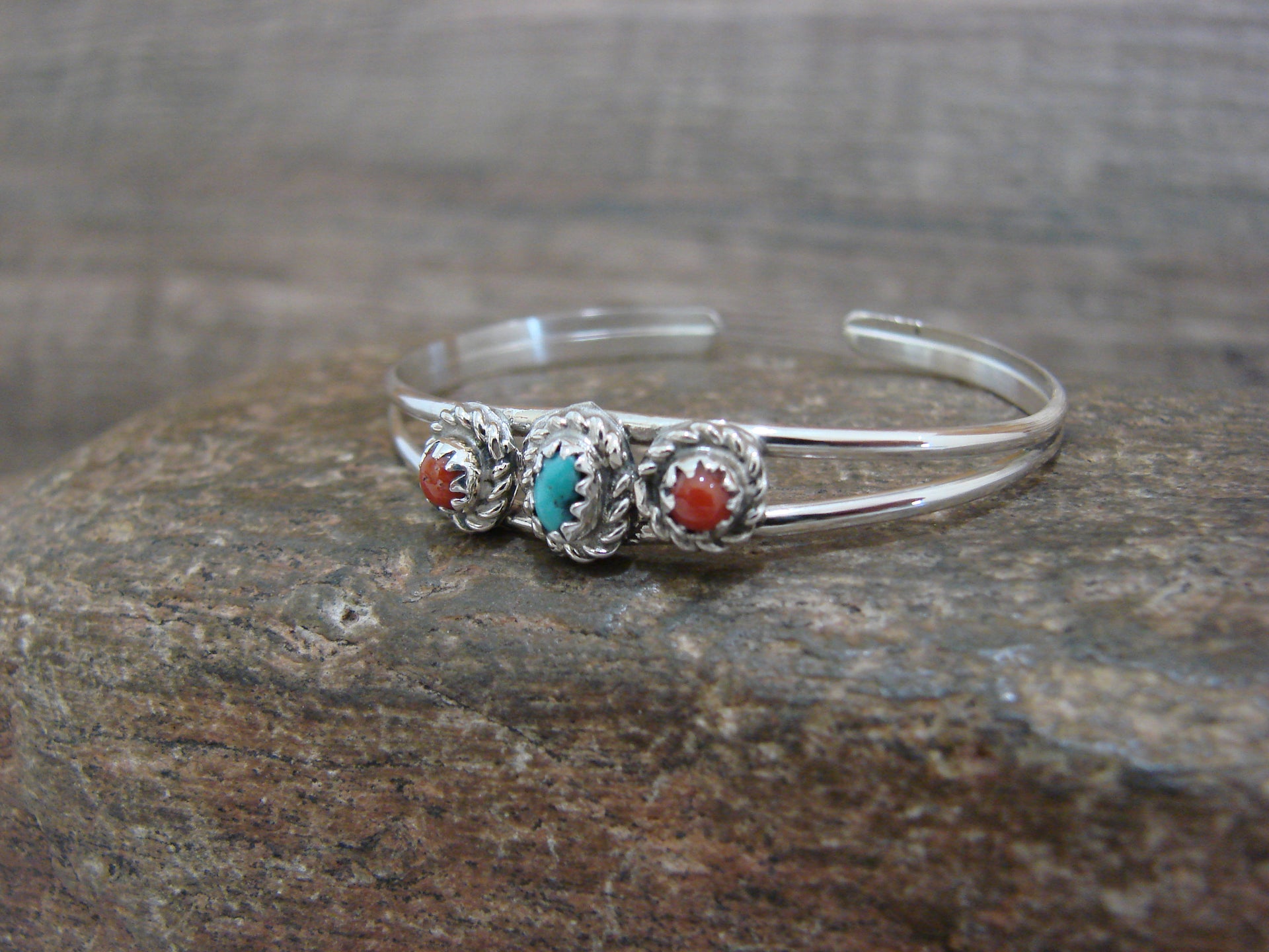 Native American Sterling Silver & Turquoise Coral Baby / Child Bracelet - Cadman