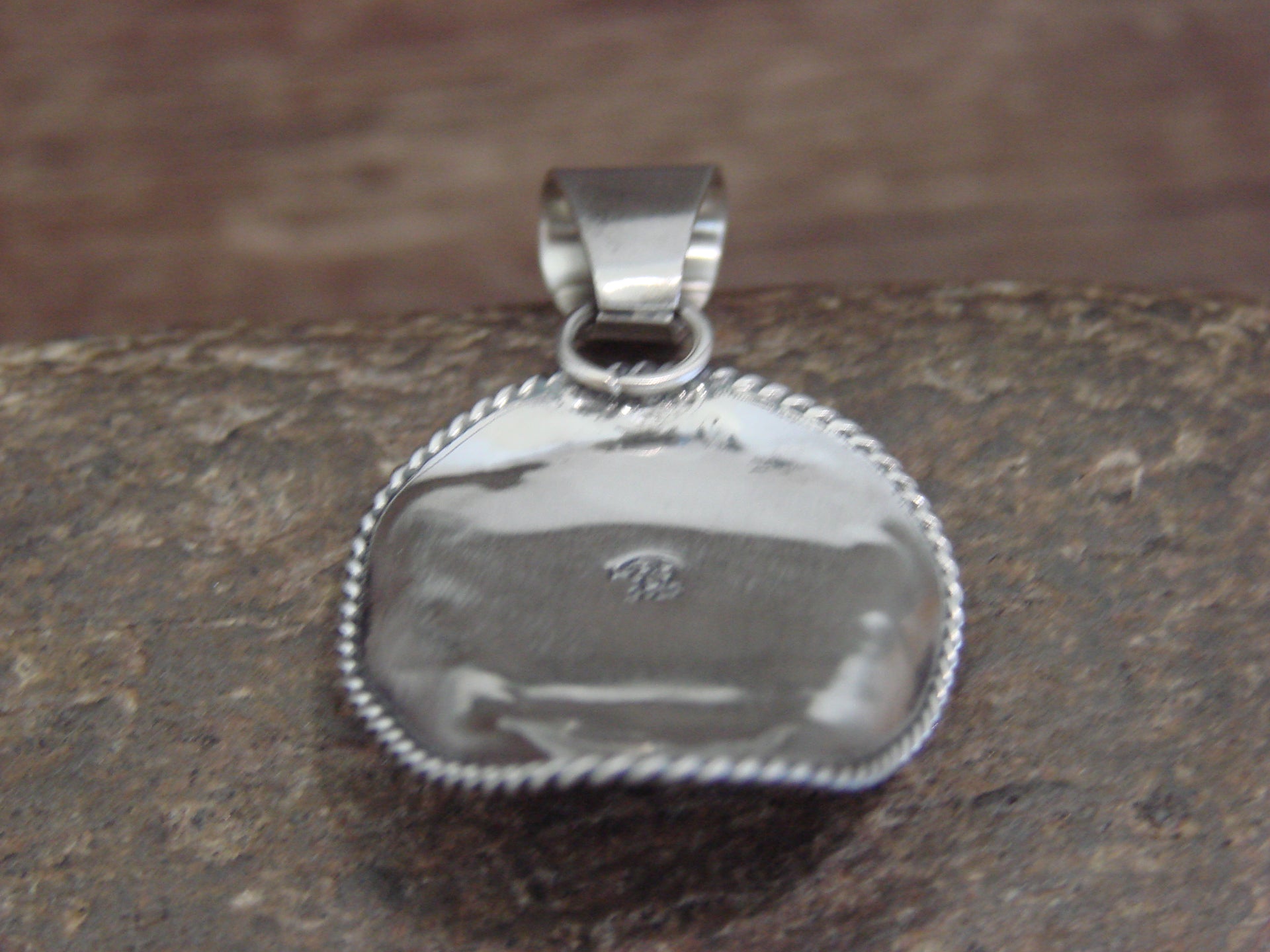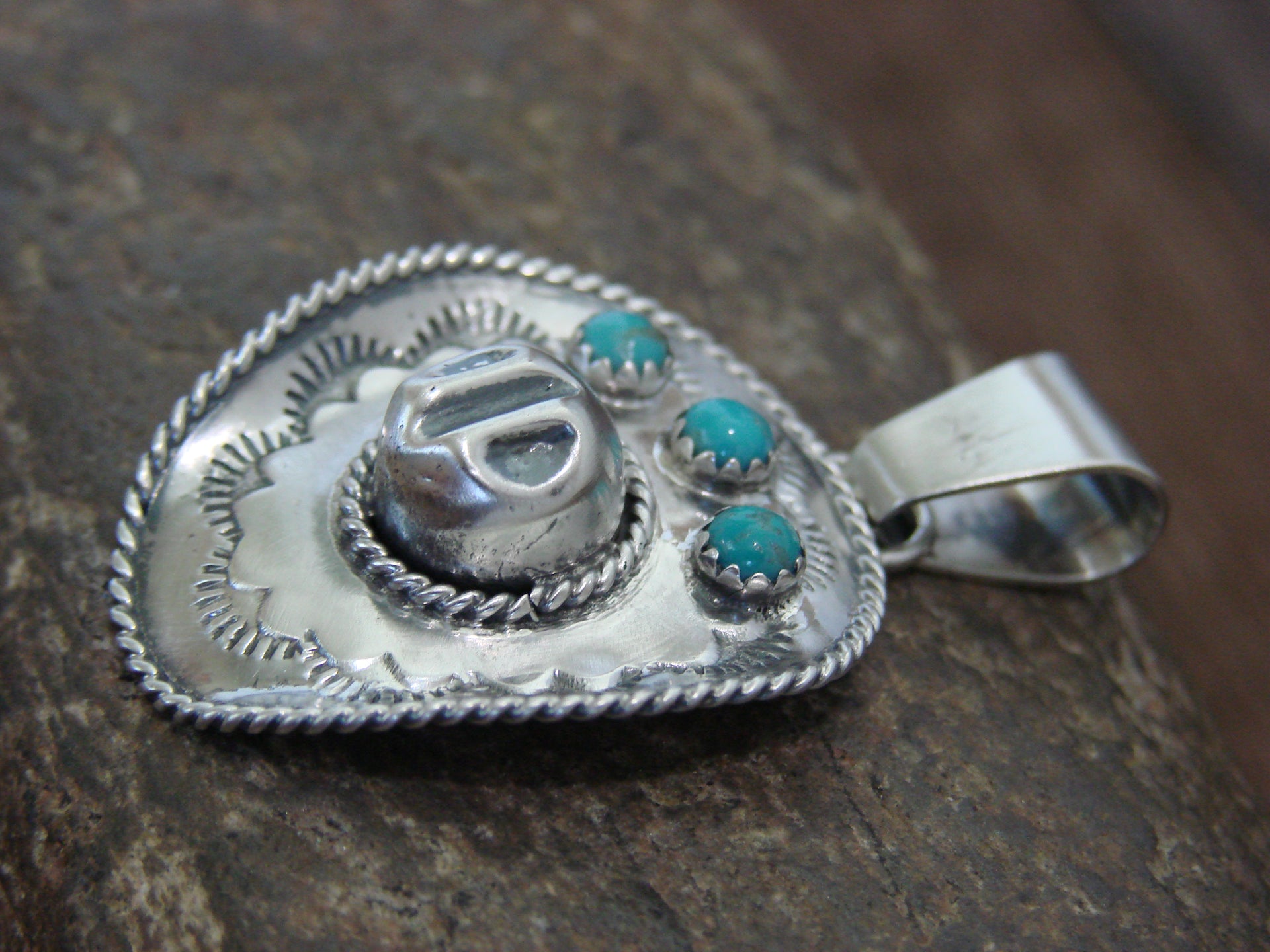Genuine Native American Navajo Indian Sterling Silver & Turquoise Cowgirl Pendant from Western New Mexico. This Stunning Pendant features three Genuine Turquoise Stones set into crown sterling silver bezel settings. Hand Stamping and Beautiful details in Sterling Silver surround the Stones. Fine Navajo Silversmith workmanship quality makes this Pendant a beautiful hand made masterpiece! Navajo Indian handmade by Bobby Platero. Hallmarked on the back. Free gift box and free shipping included!