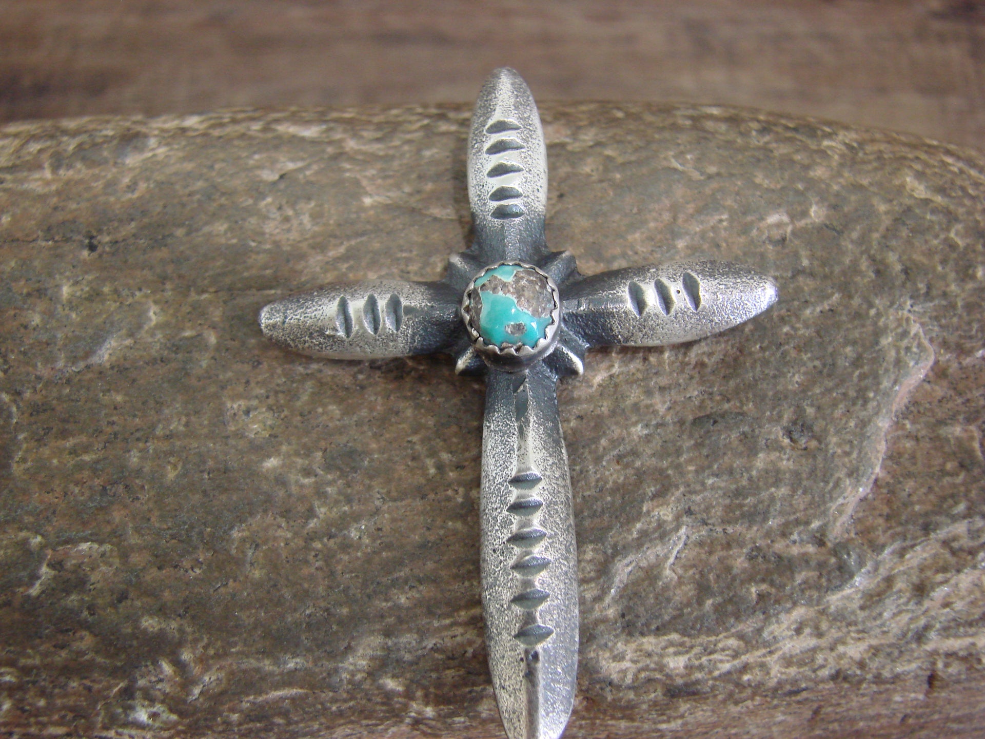 Genuine Native American Navajo Indian Silver & Turquoise Cross Pendant from Western New Mexico. This Cross Pendant features beautifully Cast Sterling Silver and Hand Stamping throughout. The Turquoise stone is set into a Crown Sterling Silver bezel setting at center. This pendant is Stunning! Hand made by Navajo Silversmith Martha Cayatineto. Signed "MC" and stamped "Sterling" on the back. Free Shipping with a gift box included!