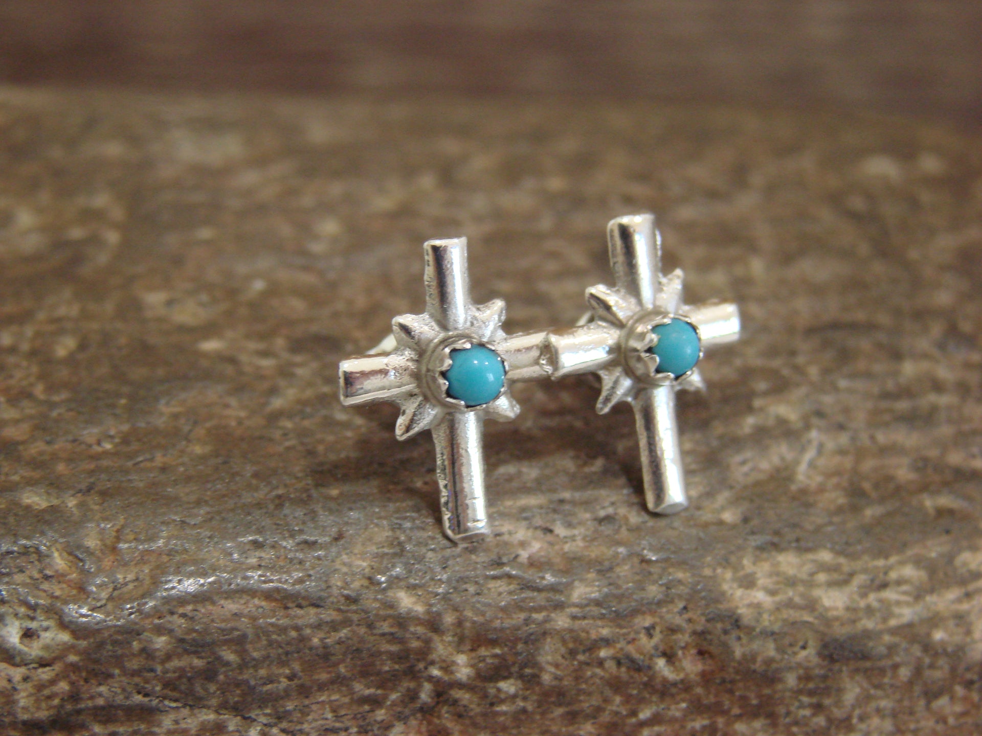 Native American Navajo Indian Sterling Silver & Turquoise Cross Stud Post Earrings from Western New Mexico. These small earrings feature a Turquoise stone set into a sterling silver crown bezel and polished to a smooth finish. This is a great pair of Stud Post Earrings! Navajo Indian handmade by Michael Bitsie. Unsigned. Free shipping and gift box included!