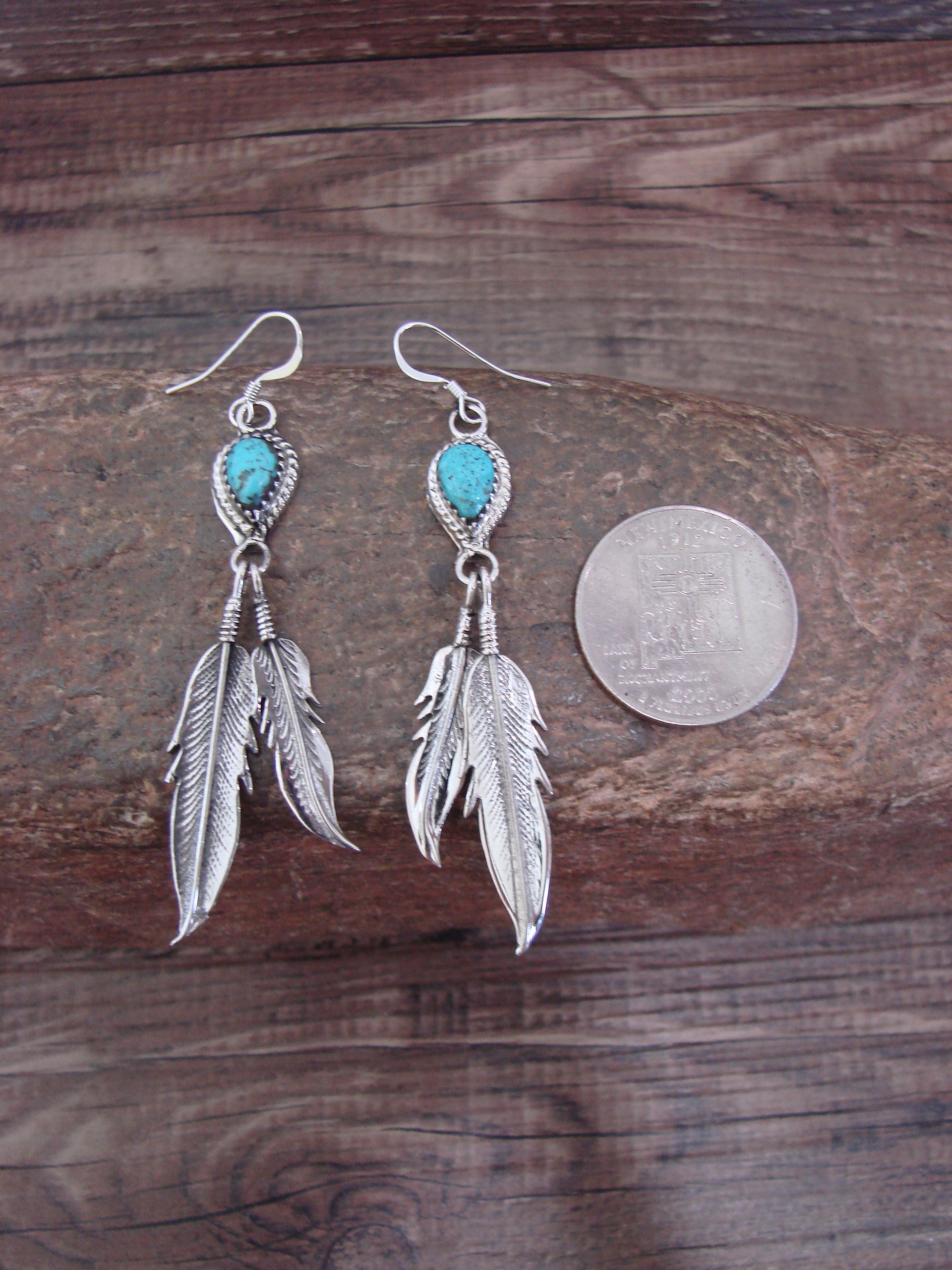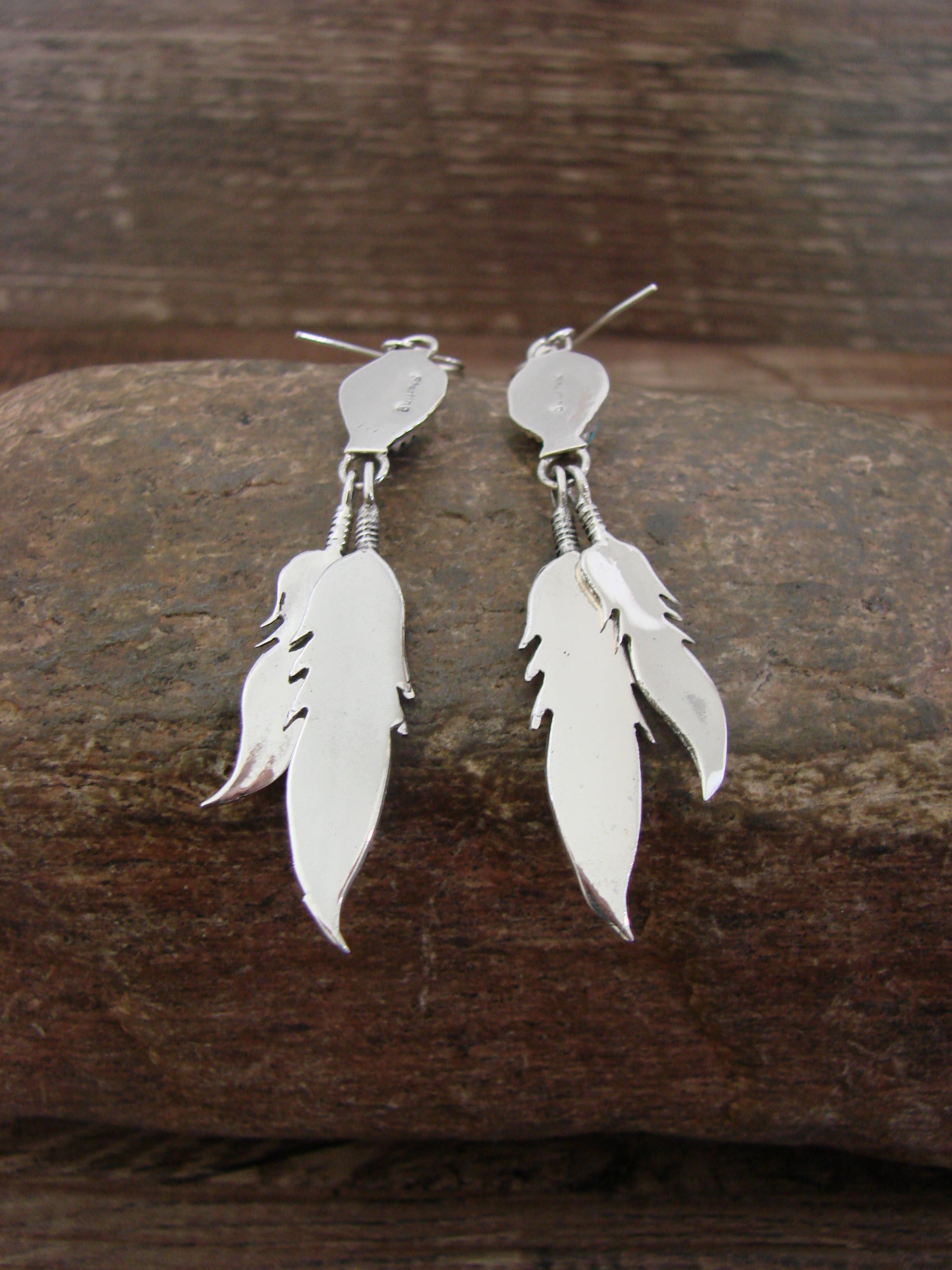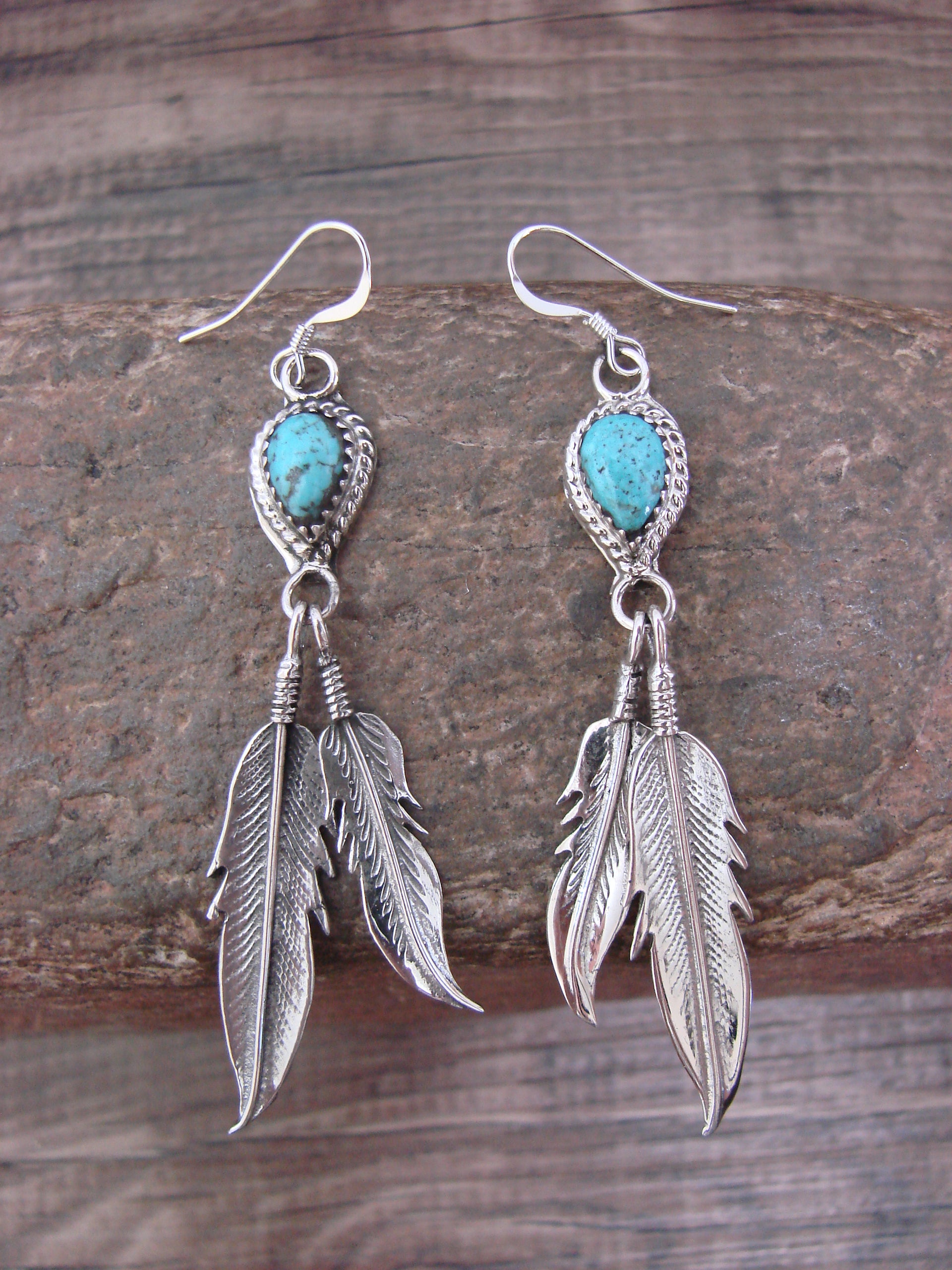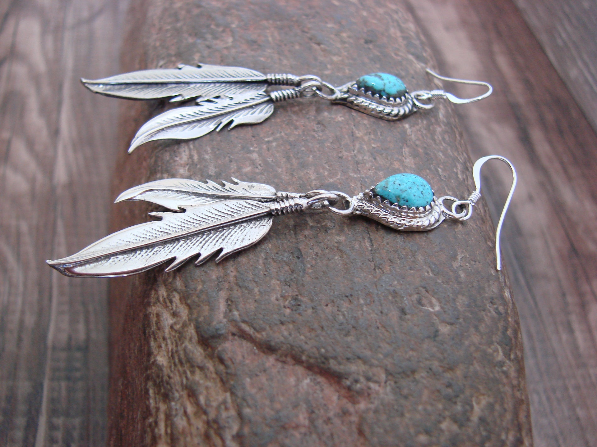 Genuine Native American Navajo Indian Sterling Silver & Turquoise Feather Dangle Earrings from Western New Mexico. These earrings feature Turquoise stones set into beautiful crown sterling silver bezel settings. The sterling silver work surrounding the earrings is very nicely detailed and polished! Navajo Indian handmade by Sharon McCarthy. Unsigned. Free shipping and gift box included!