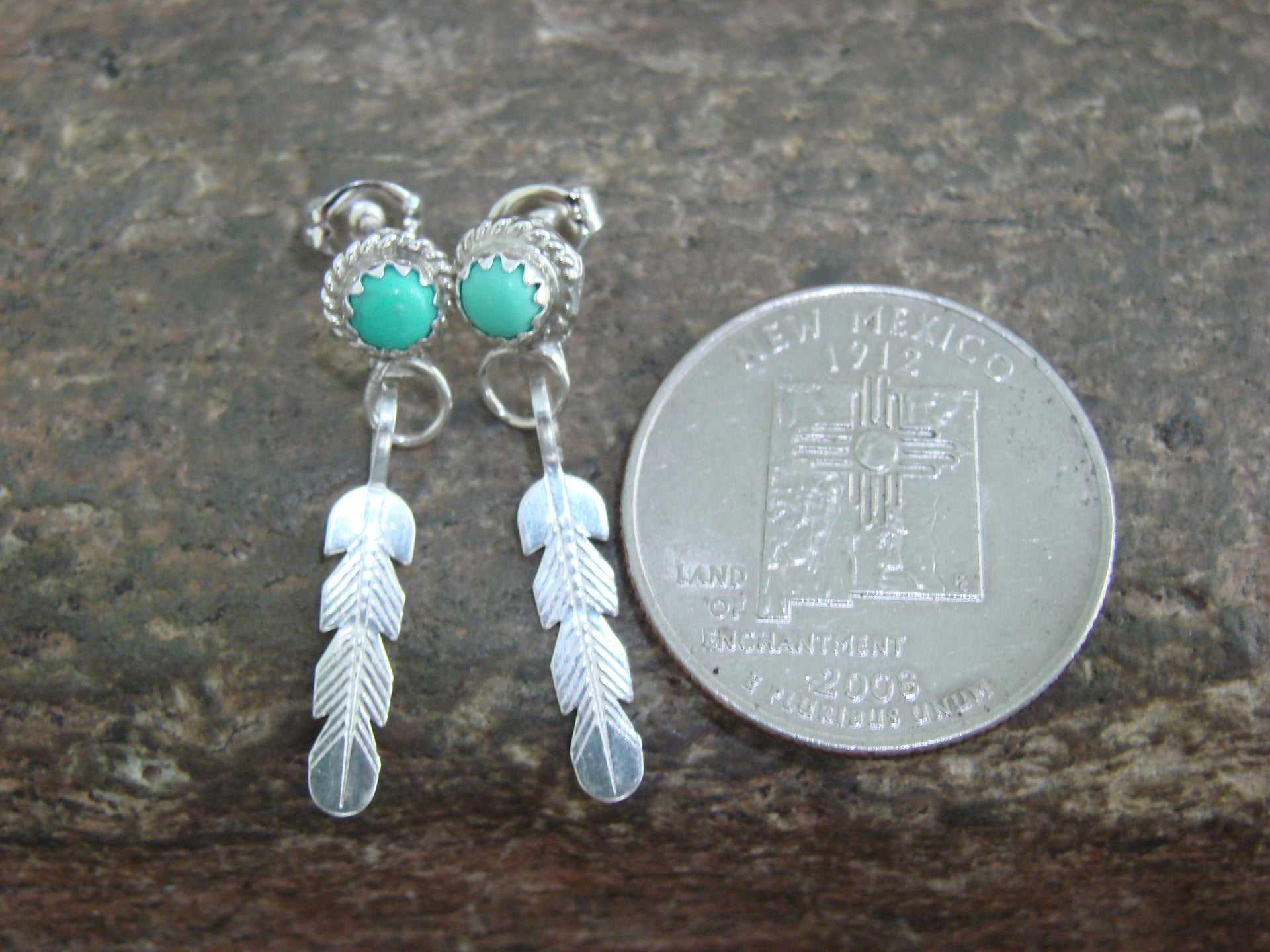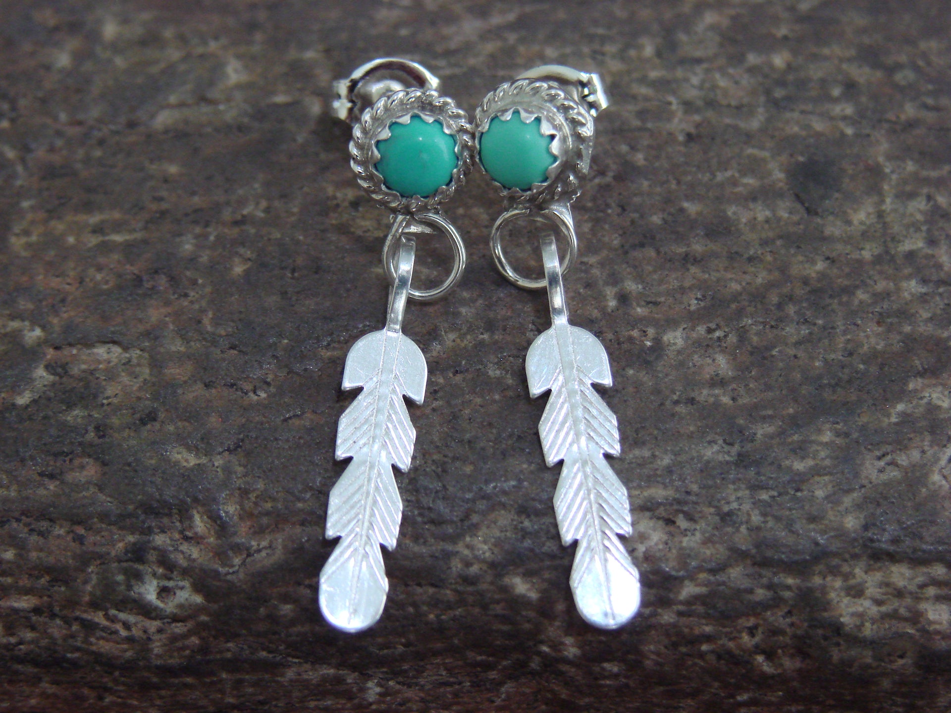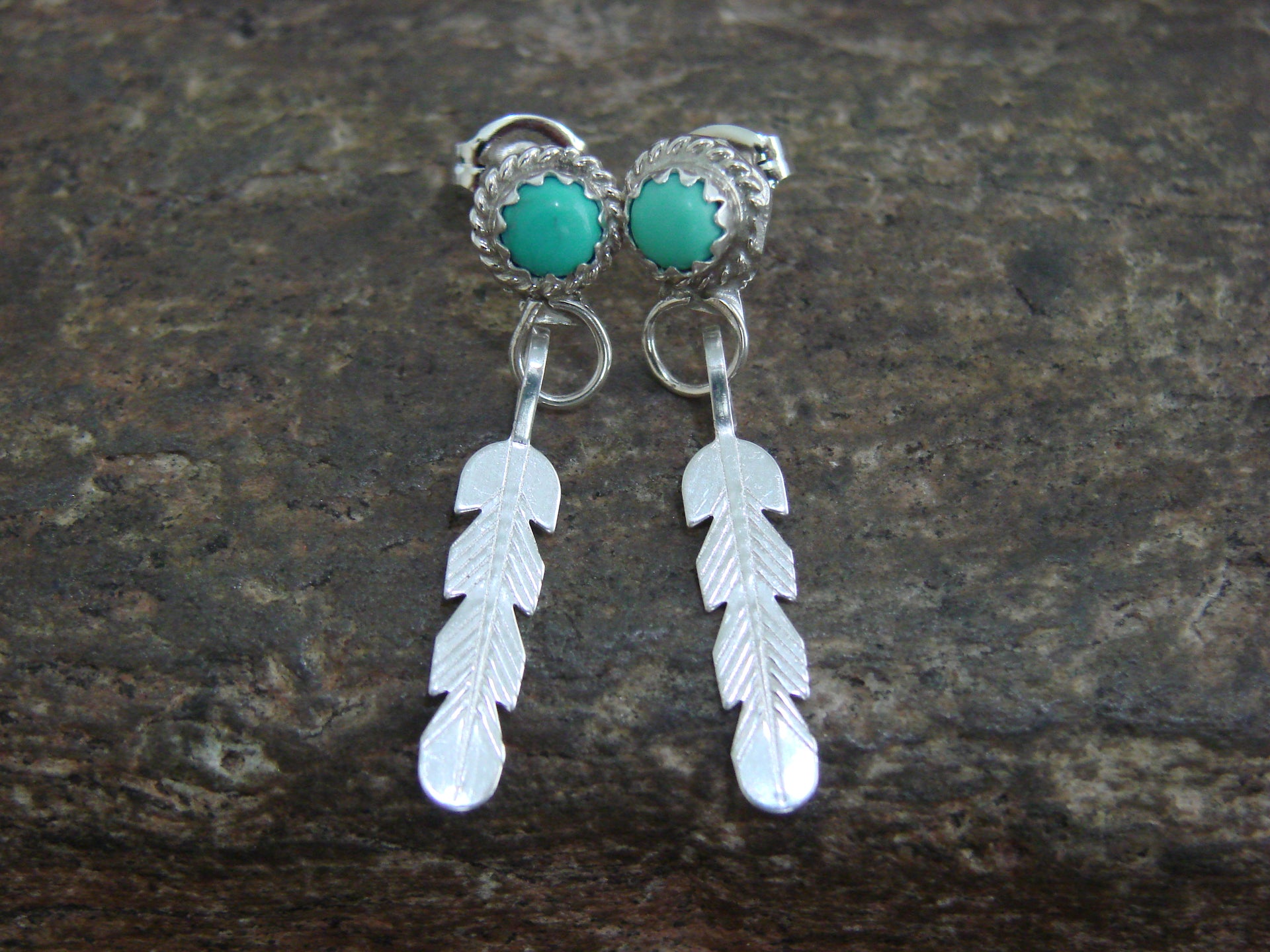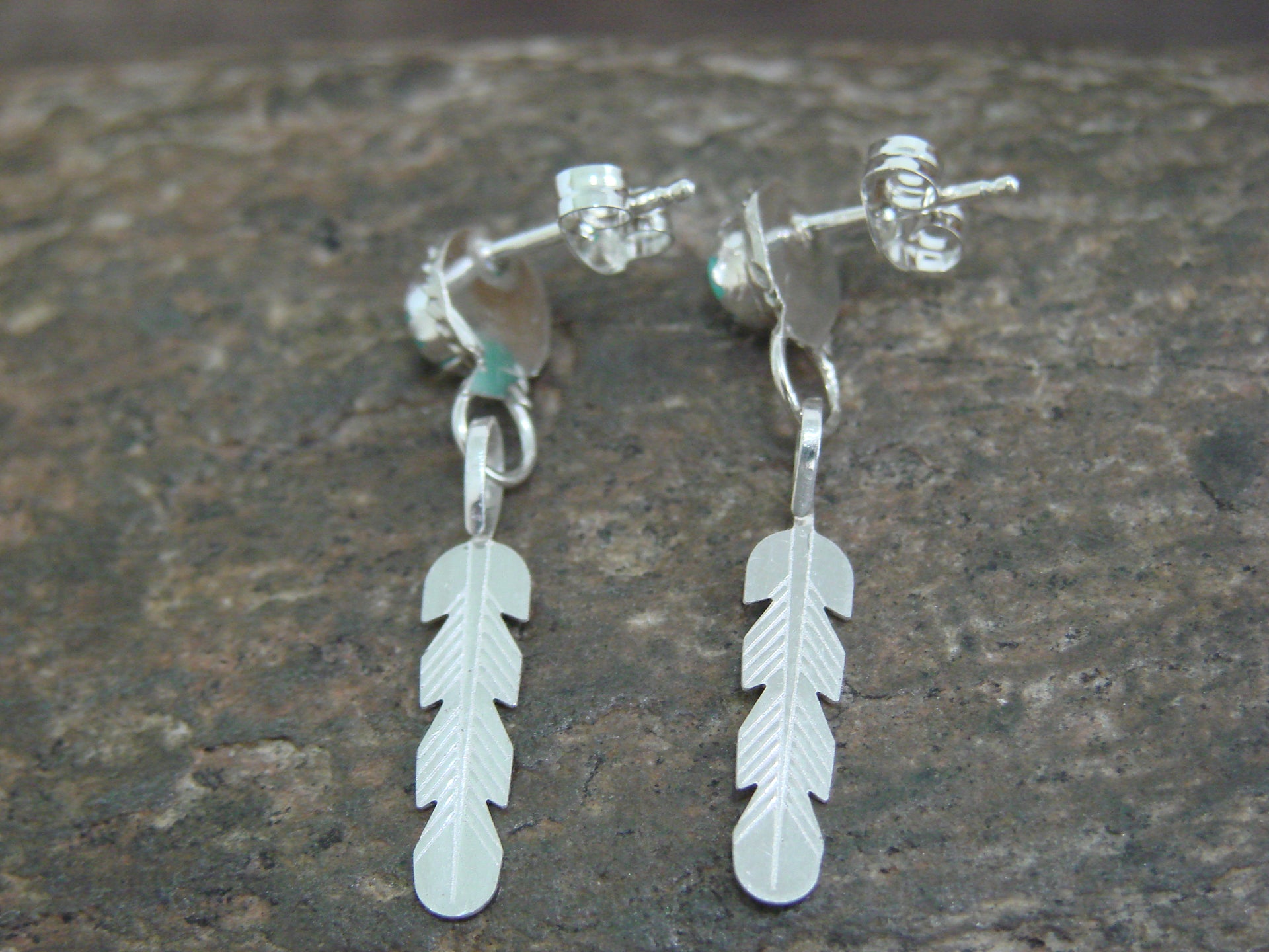 Native American Navajo Indian Sterling Silver & Turquoise Feather Dangle Earrings from Western New Mexico. These earrings feature Turquoise stones set into beautiful crown sterling silver bezel settings. The sterling silver work surrounding the earrings is very nicely detailed and polished! Navajo Indian handmade by Esther White. Unsigned. Free shipping and gift box included!