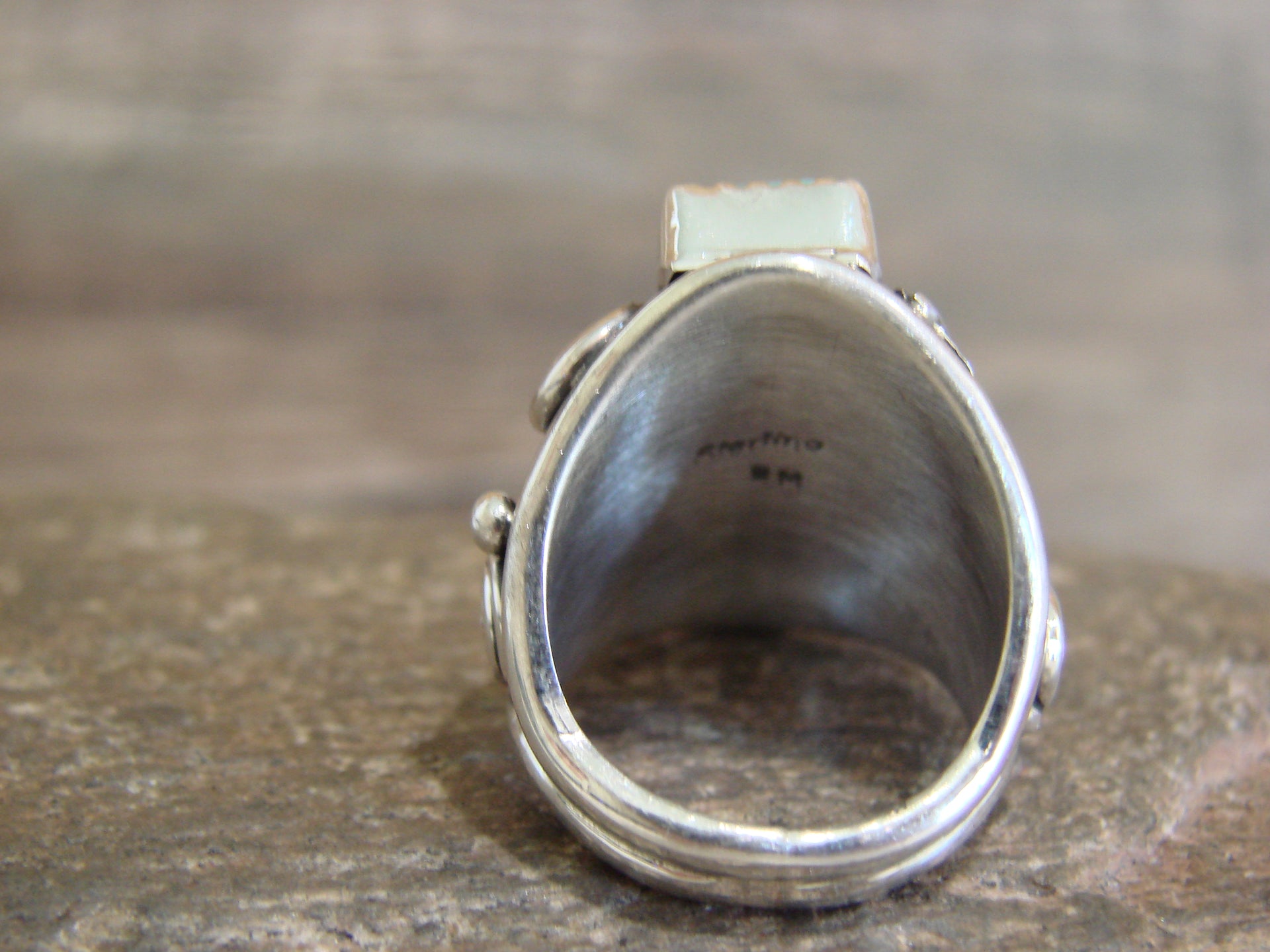 Genuine Native American Navajo Indian Sterling Silver & Turquoise Ring from Western New Mexico. This ring features a stunning Genuine Turquoise stone set into a crown Sterling Silver bezel setting. Surrounding the stone are Hand Stamped feathers and beautiful details in Sterling Silver. Polished to a bright shine, this is a very nice ring! Handmade by Navajo Silversmith Darrell Morgan. Signed "DM" and Stamped "Sterling" on the back. Free shipping and gift box included!