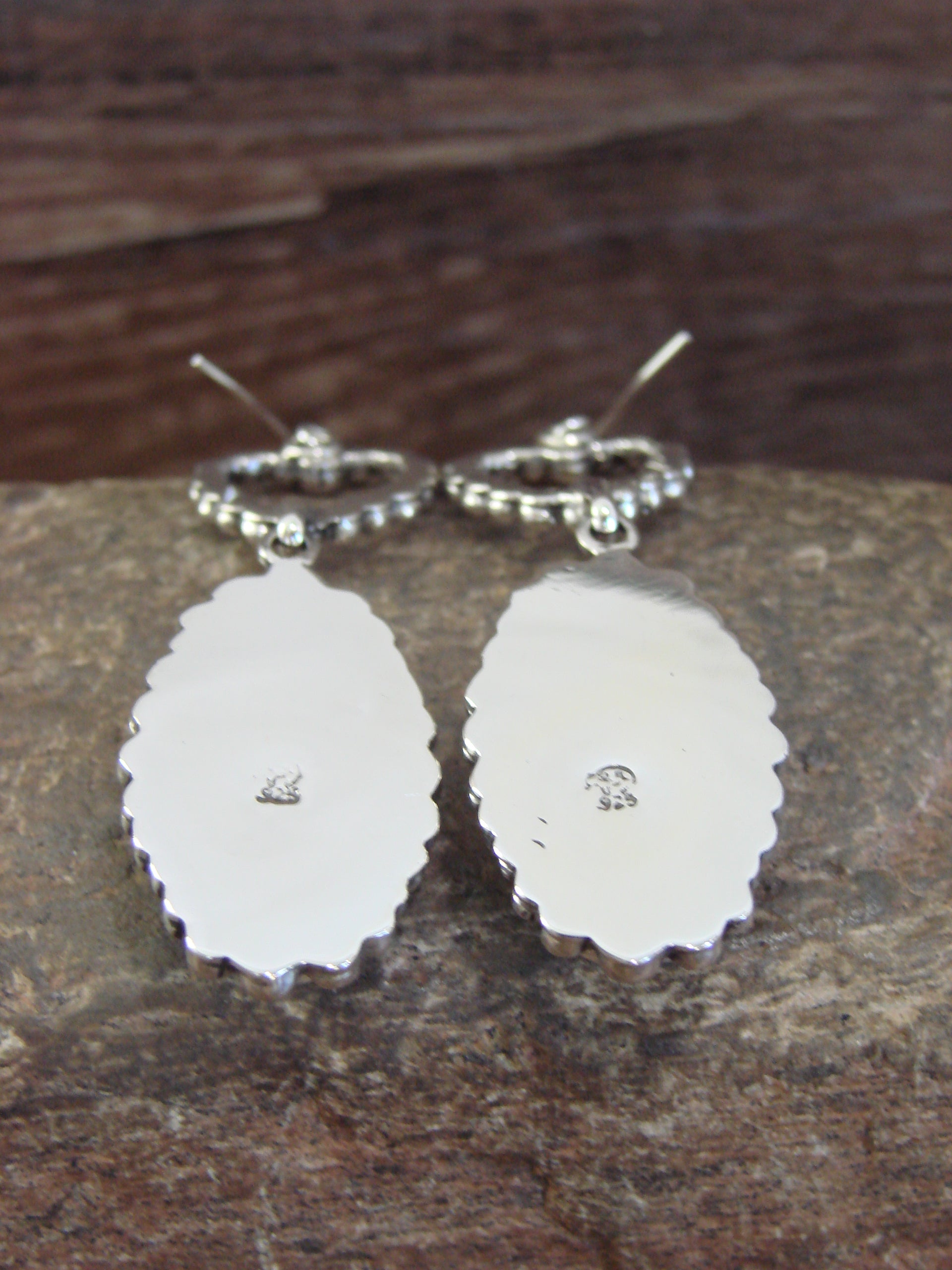 Genuine Native American Navajo Indian Sterling Silver Sonoran Turquoise Heart Dangle Earrings from Western New Mexico. These Dangle style earrings feature polished Sonoran Turquoise Stones intricately set into smooth Sterling Silver Bezel settings. Sterling Silver details surround the Stones. This is a Gorgeous pair of Genuine earrings! Handmade by Navajo Artist Emerson Delgarito. Hallmarked on the back. Free Gift box and Shipping included!