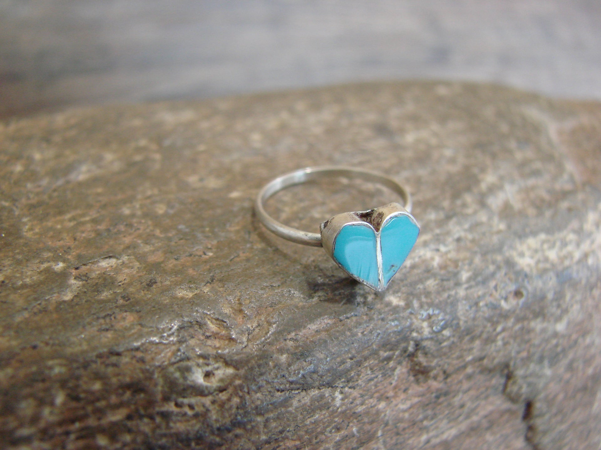 Genuine Native American Zuni Indian Sterling Silver & Turquoise Inlay Heart Ring from Western New Mexico. This Genuine piece features two Genuine Turquoise stones intricately inlayed into a smooth Sterling Silver Heart Bezel Setting. Zuni Indian hand made by Dorothy Neha. Unsigned. Free Shipping and gift box included!